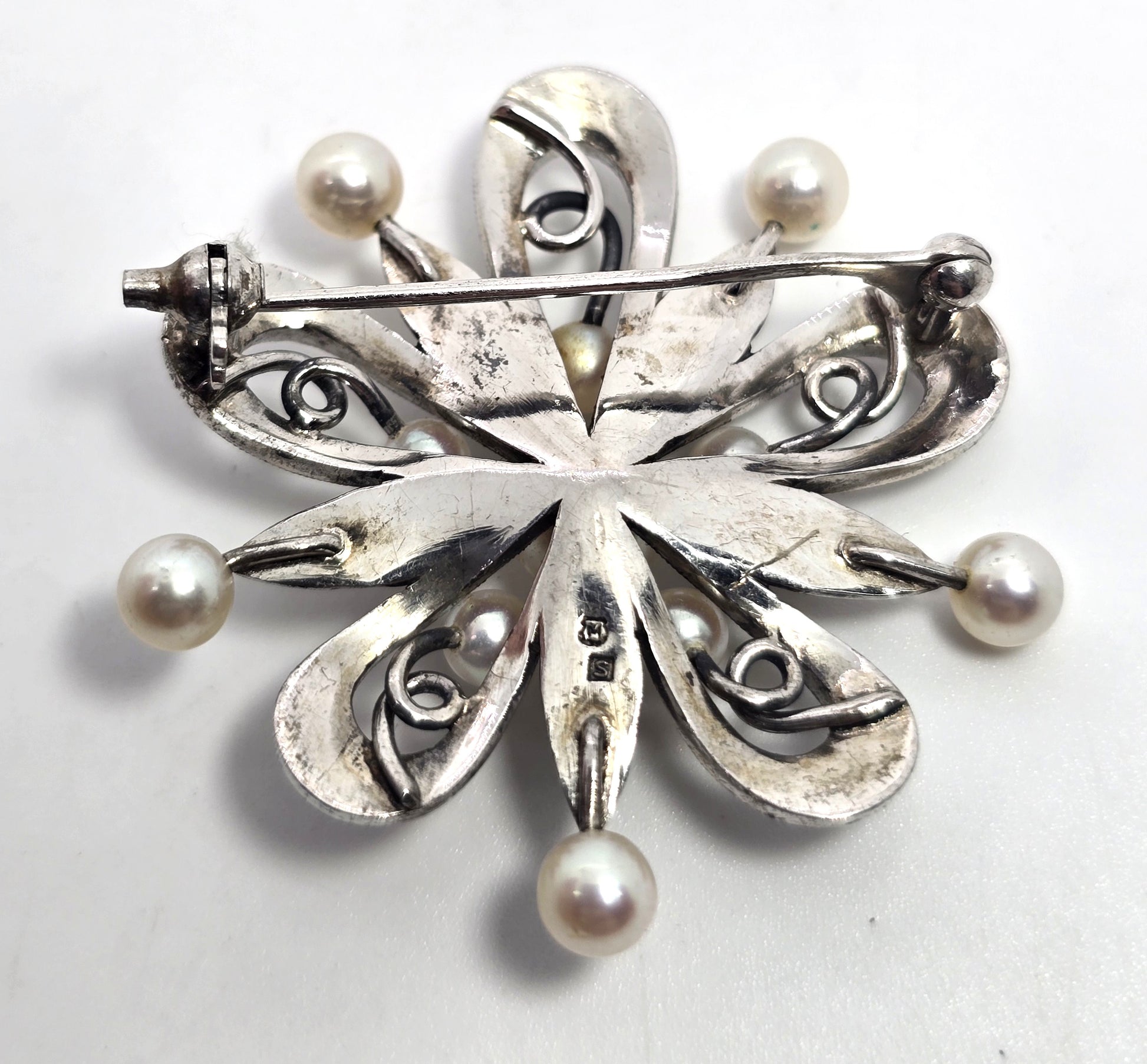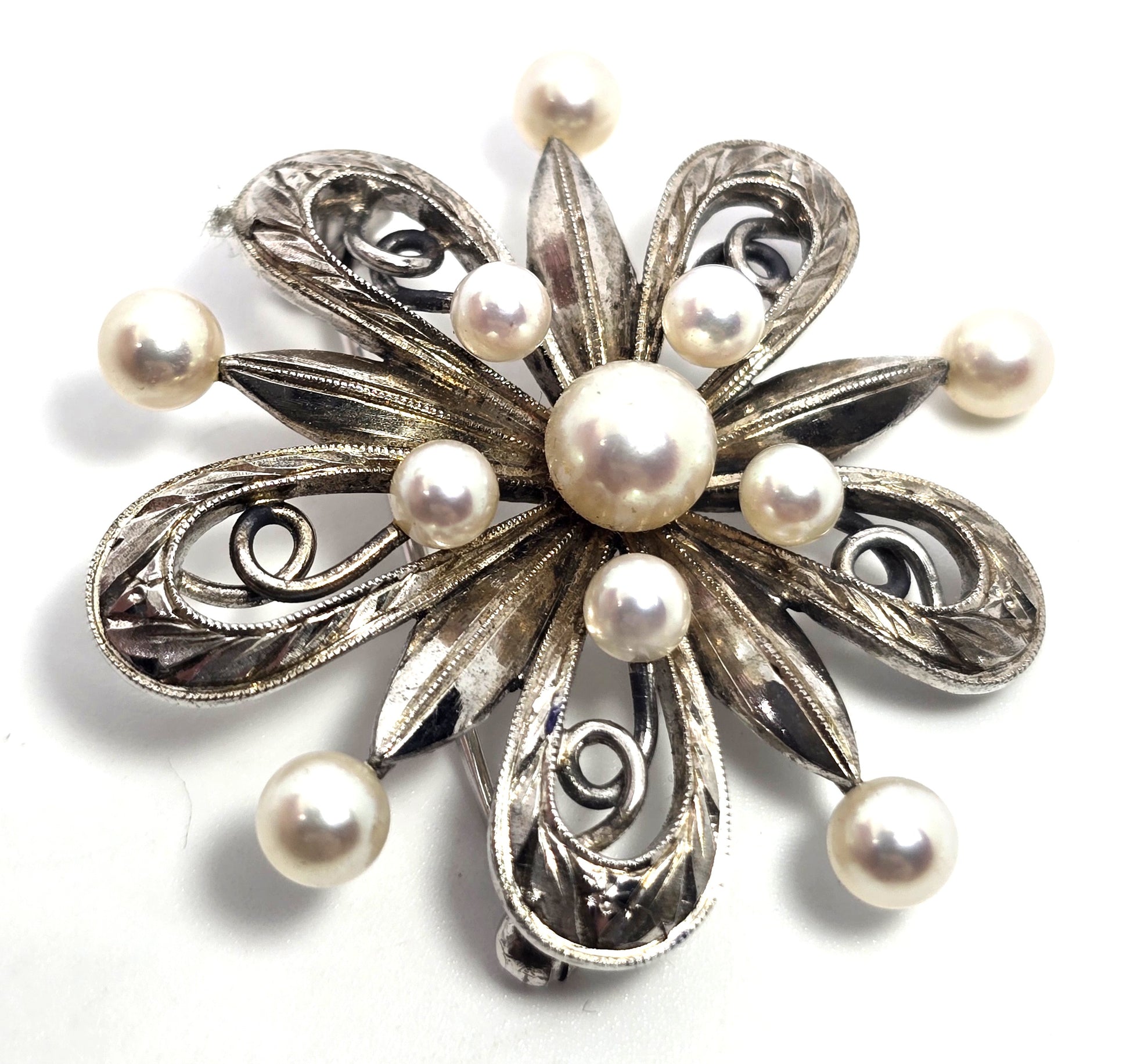 Mikimoto 11 Akoya Cultured Pearl flower vintage mid century sterling silver brooch