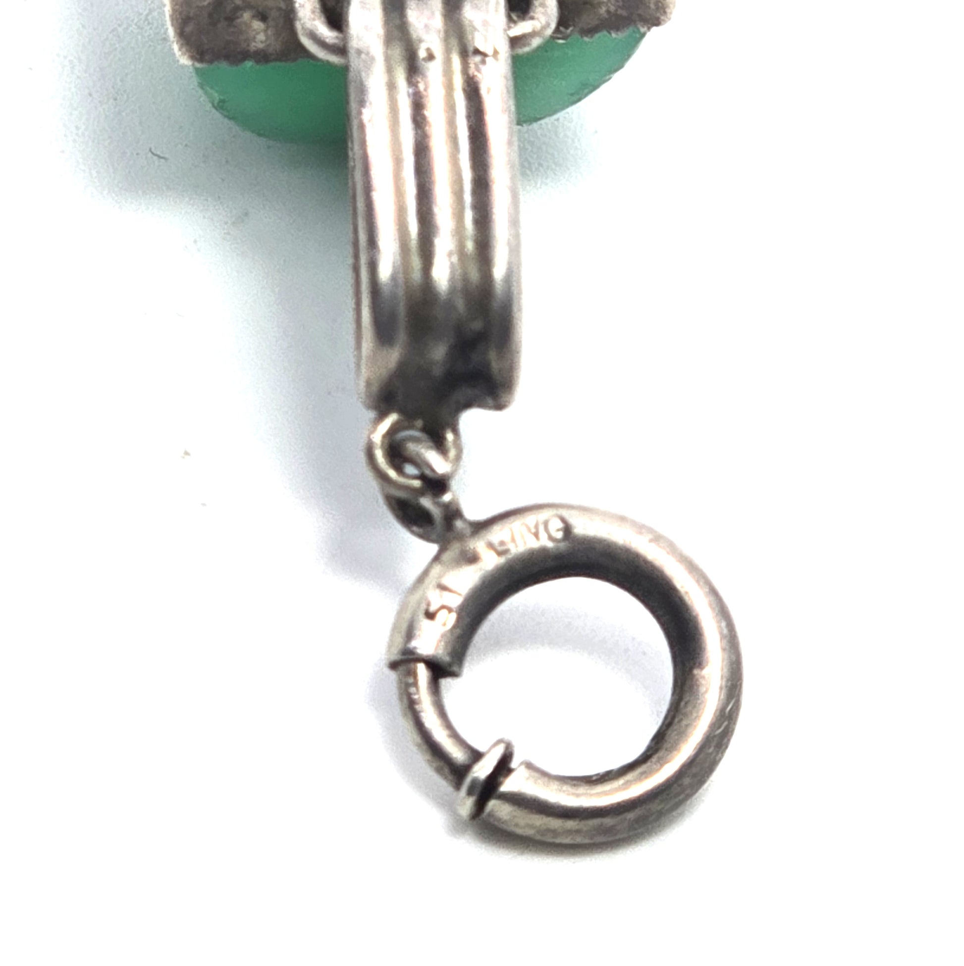 Antique Green onyx Art Deco embossed link sterling silver 6.5 inch bracelet. Good used condition with little to no signs of normal wear. Great vintage patina. Stamped Sterling on the early thumb spring ring clasp. Stamped sterling with a hallmark on the back of the other section of the clasp. No missing stones.