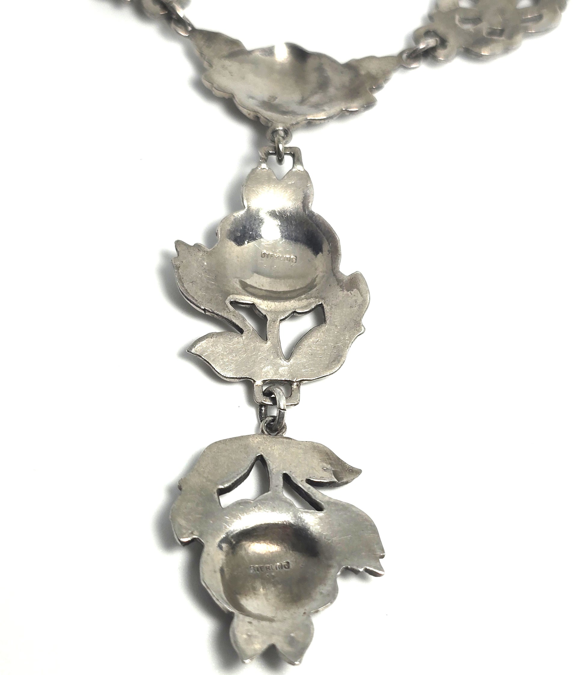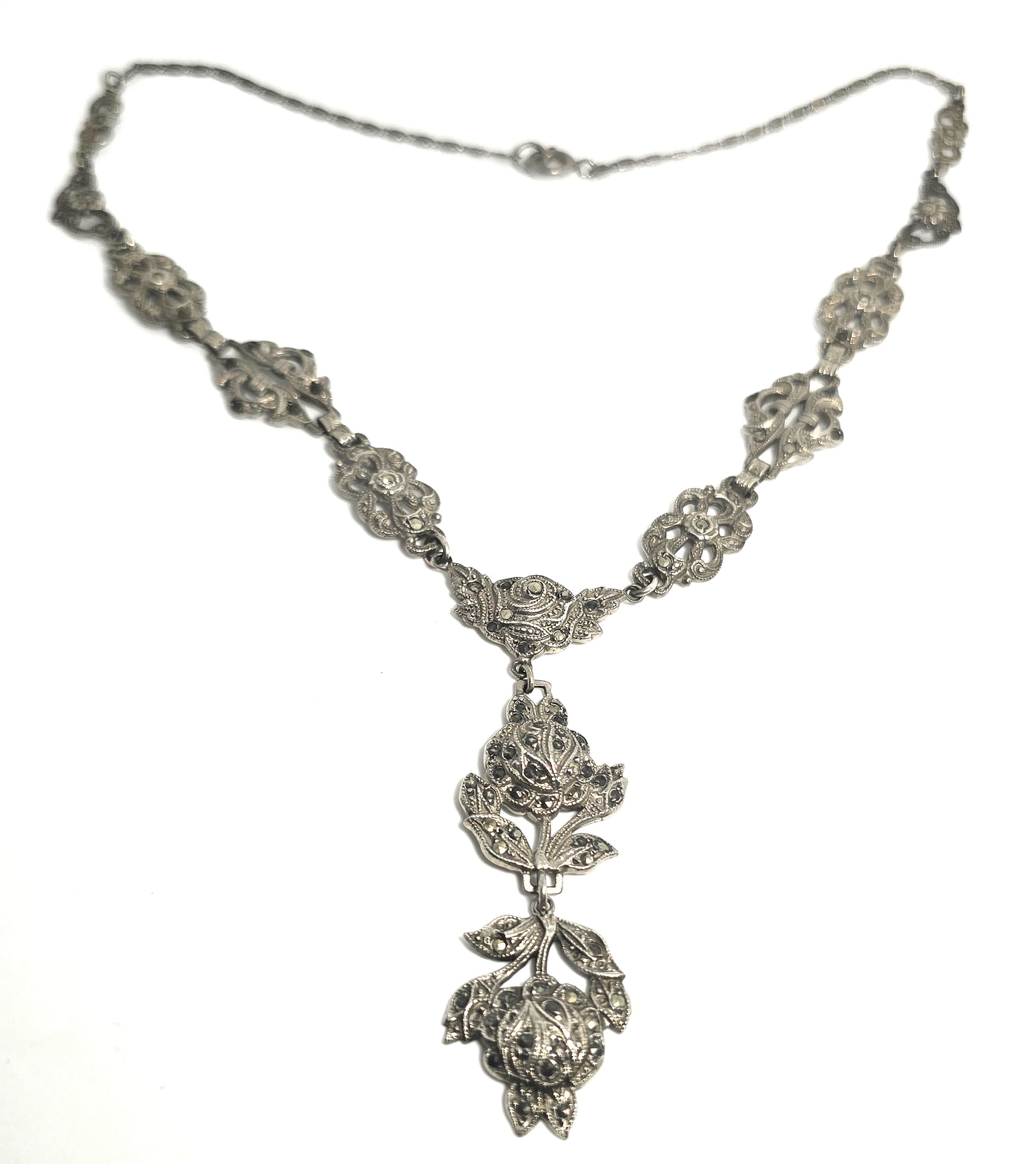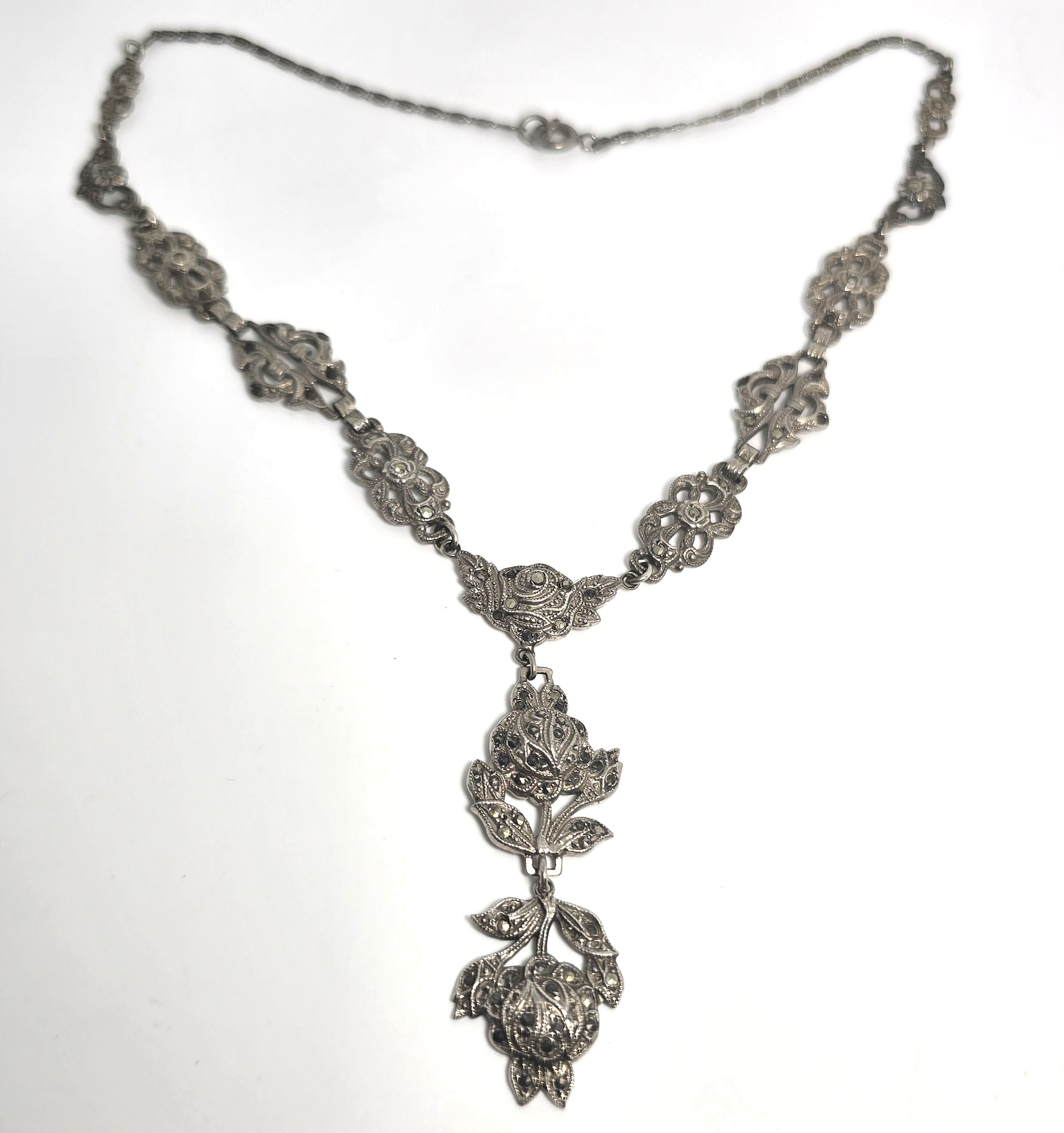 German Marcasite Rose antique Art Deco sterling silver lavalier necklace 1930's