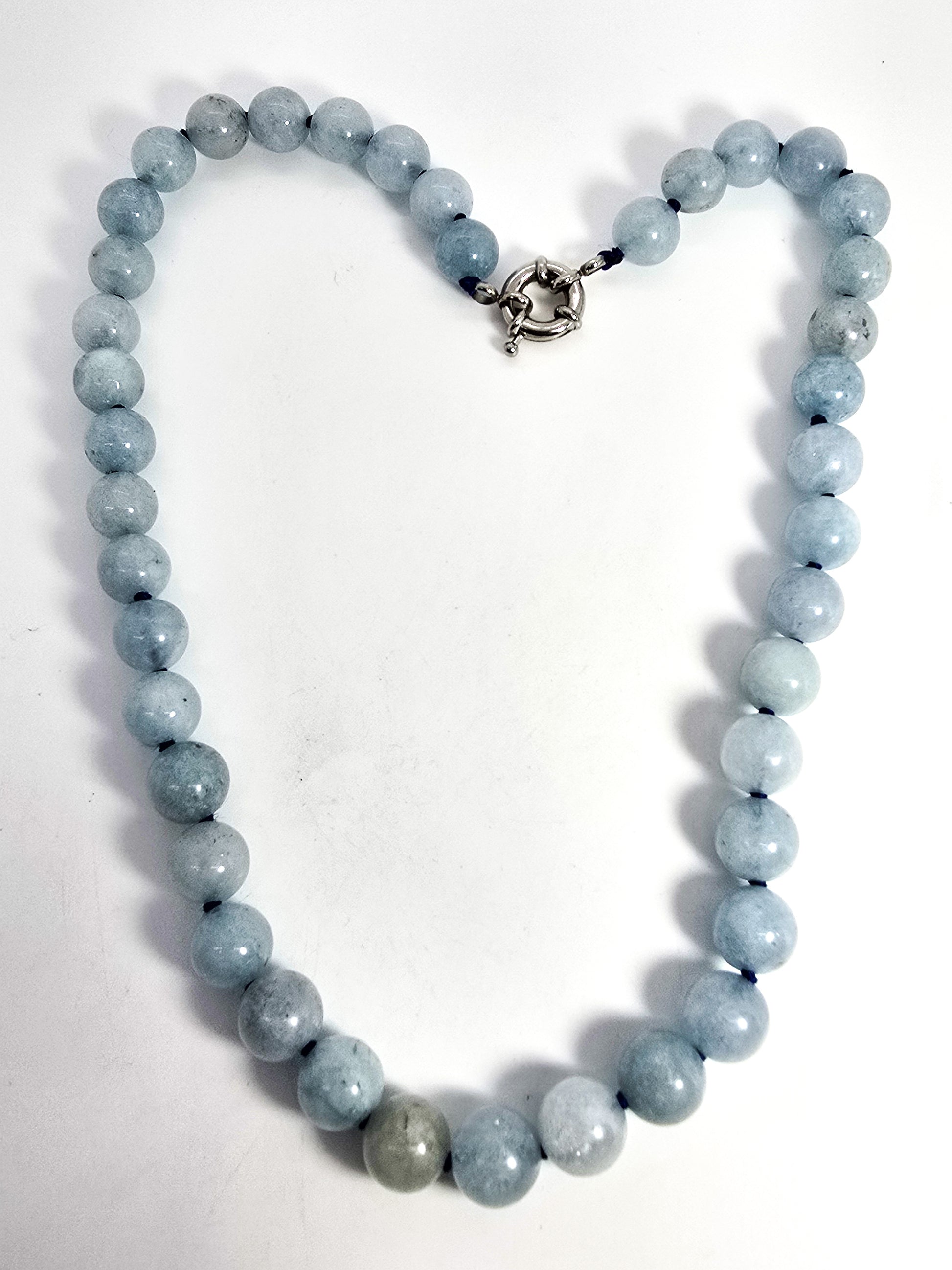Aquamarine blue gemstone 8mm natural beaded silver toned necklace. Good used condition with little to no signs of normal wear. Silver toned spring ring clasp. Silk strung and knotted between the stones.