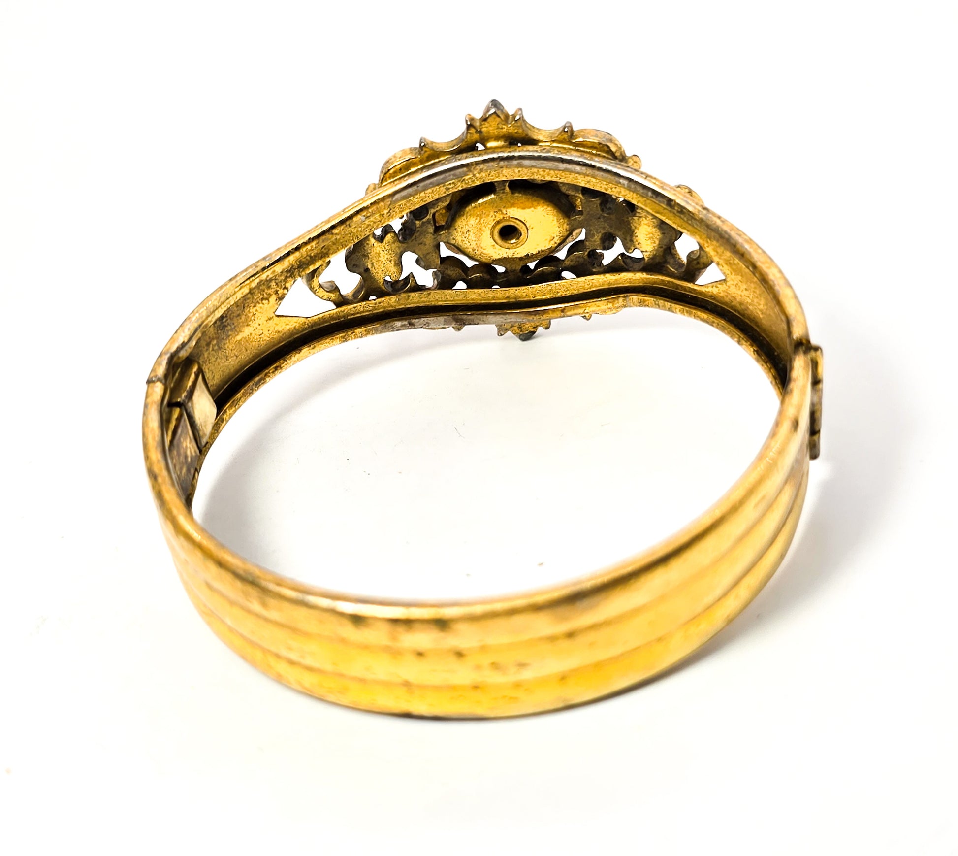 Red rhinestone vintage mid century gold toned floral clamper bangle bracelet. Fair wearable vintage condition with signs of wear. The gold plating on the bracelet has become worn in places especially around the edges of the bracelet. No missing or black stones. Beautiful open filigree accent. Hidden clasp pops open when pressure is applied.