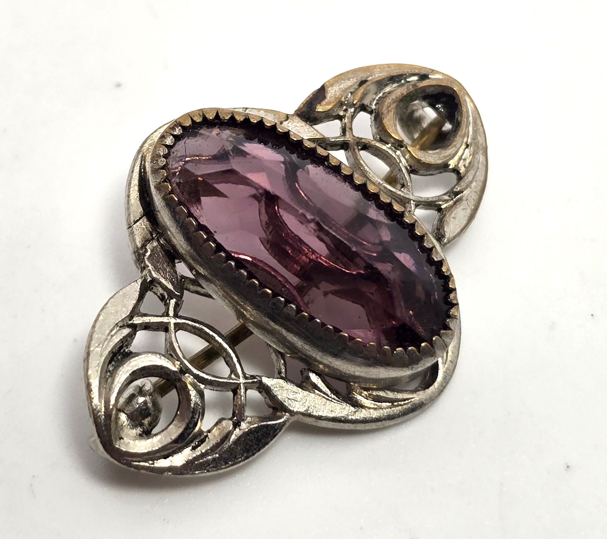 Art Deco Purple paste glass open work cartouche antique brooch . Good used condition with little signs of normal wear. Small amount of plating loss around the sawtooth bezels. Antique C clasp fastening.
