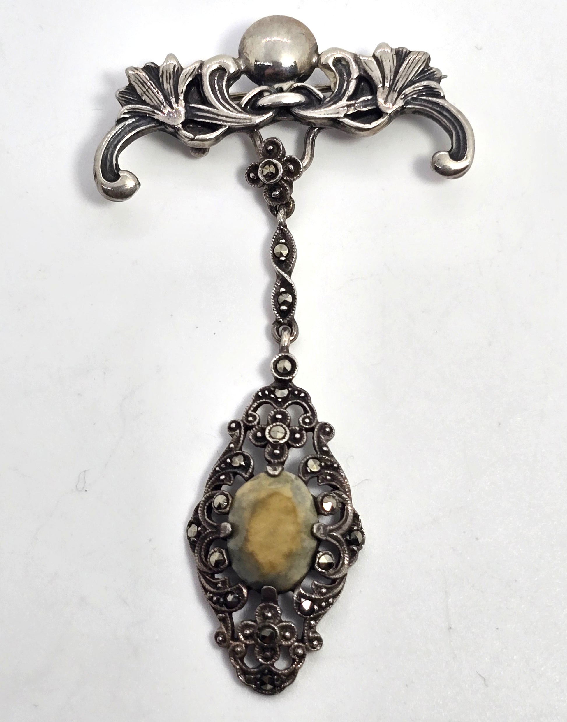 Art Nouveau Lily fob antique sterling silver fob brooch marcasite green stone drop