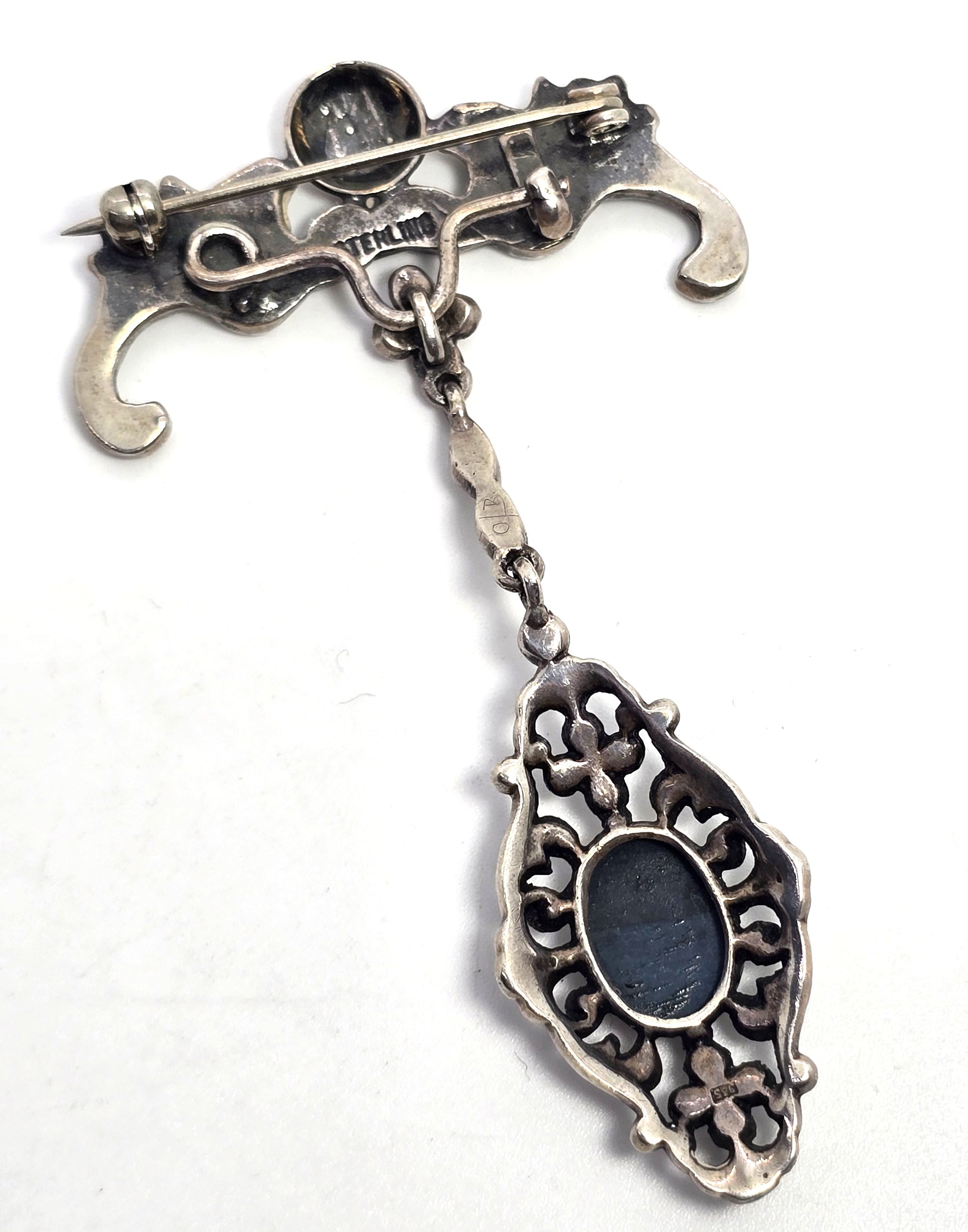 Art Nouveau Lily fob antique sterling silver fob brooch marcasite green stone drop. Good used condition with little to no signs of normal wear. Great patina present. Stunning detail in the flowing silver. The top portion of this brooch is an antique fob brooch. It is stamped sterling under the fob latch. Very well made and detailed. Married onto the fob portion is a vintage sterling silver marcasite green stone drop. These do not appear to be from the same period but kept the set as found. Fob is stamped 925 on the back.