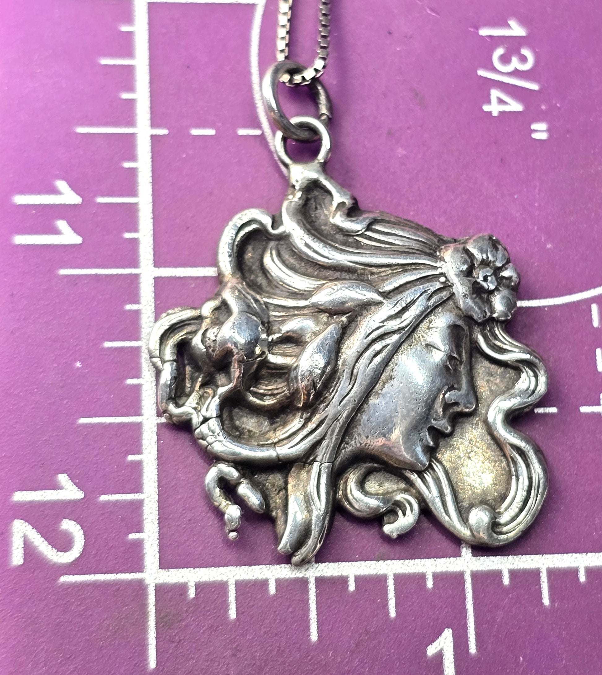 Art Nouveau flowing nymph casted antique sterling silver pendant necklace. Good used condition with little to no signs of normal wear. Great patina present. Stunning detail in the flowing silver. These casted pieces are amazing and made with a large amount of high quality silver compared to the modern jewelry manufacturing process. You can tell by the back side of the pendant. There are reproductions of this design but they are not solid and there are gaps in the hair. This is one of the original pieces. It is partially stamped sterling just under the bail on the backside of the pendant. comes with sterling silver box chain. This is a very solid made set with great weight.