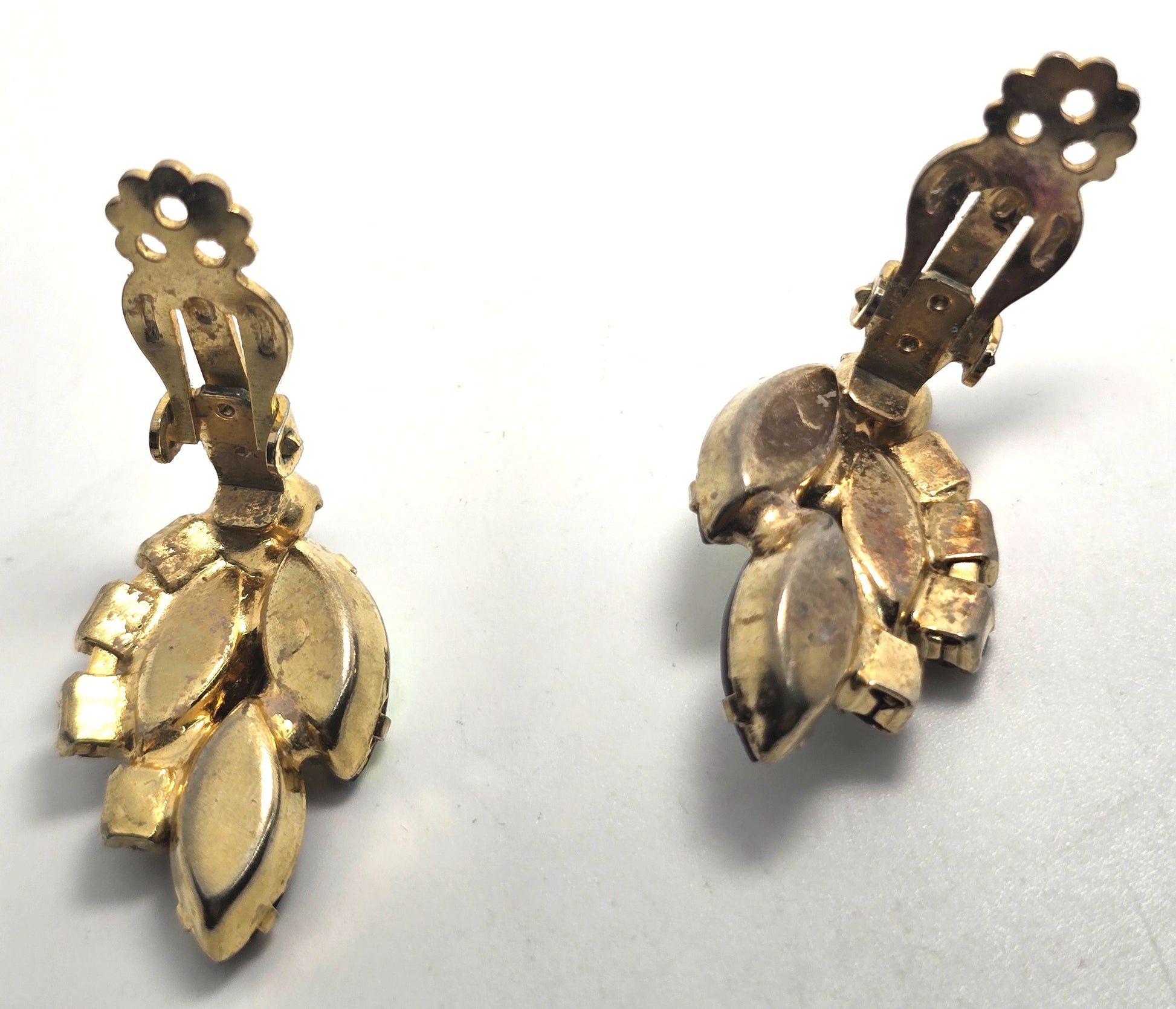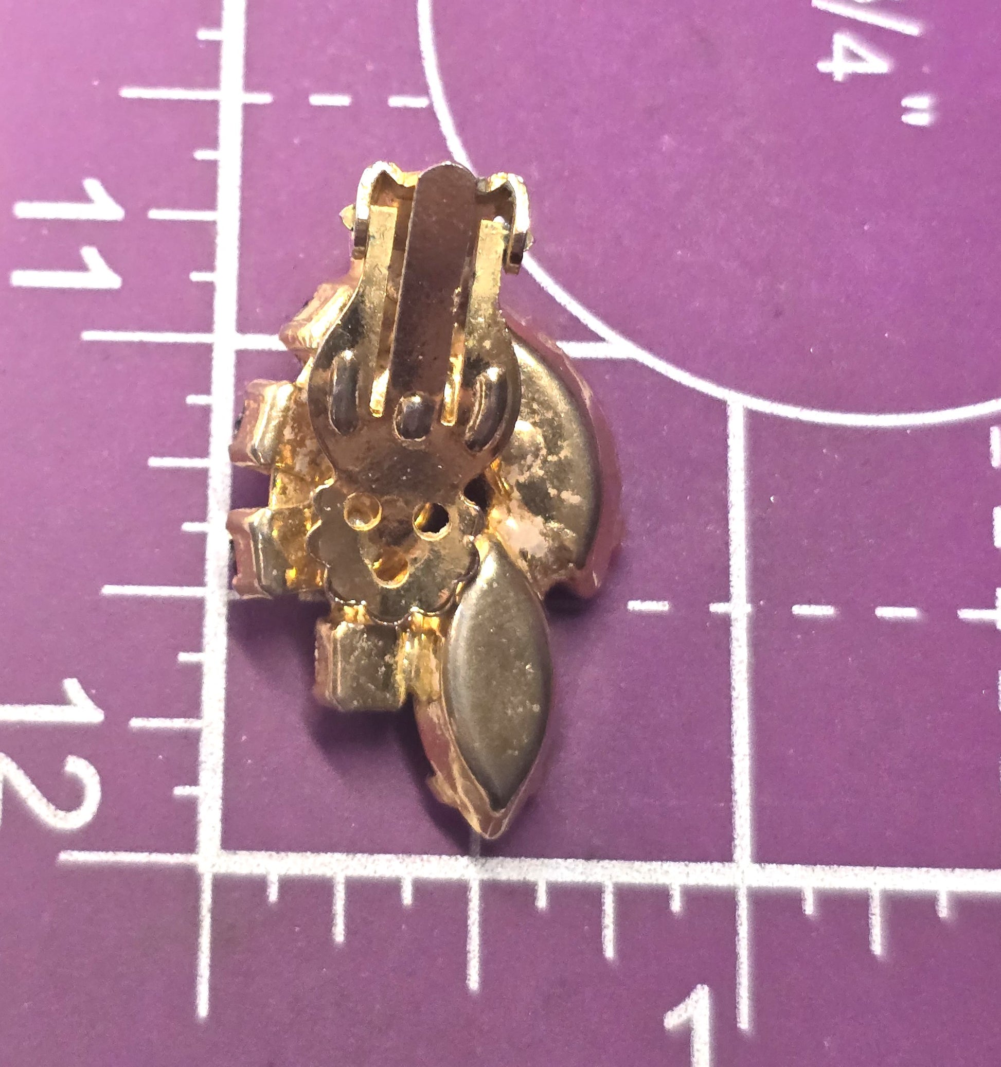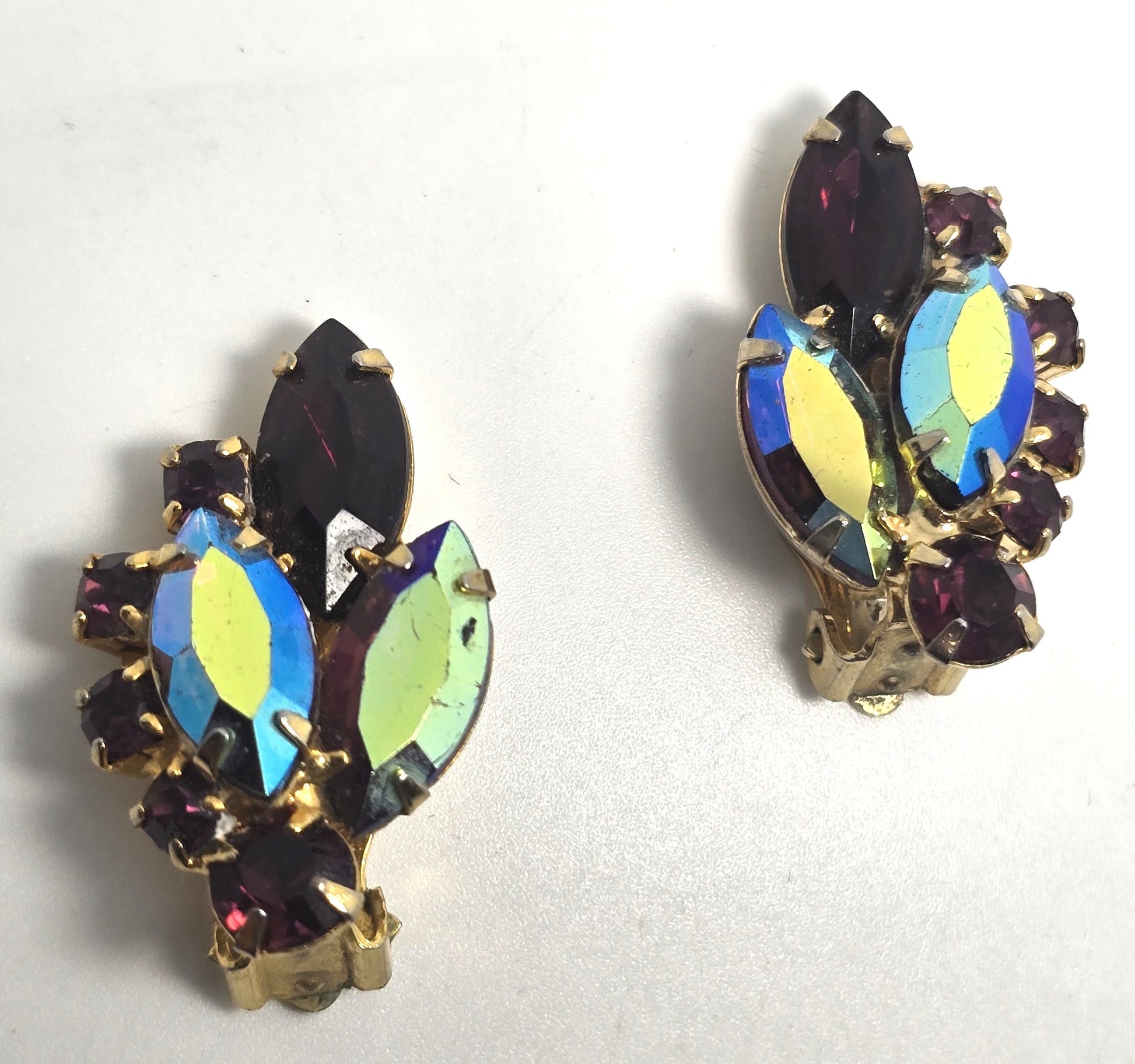 Purple and blue peacock Aurora Borealis rhinestone vintage clip on earrings. Good used condition with small signs of normal wear. yellow gold plated prong set rhinestones. Clip on vintage fastening. No missing stones. AB coating has small signs of wear with some spotting as seen in pictures.