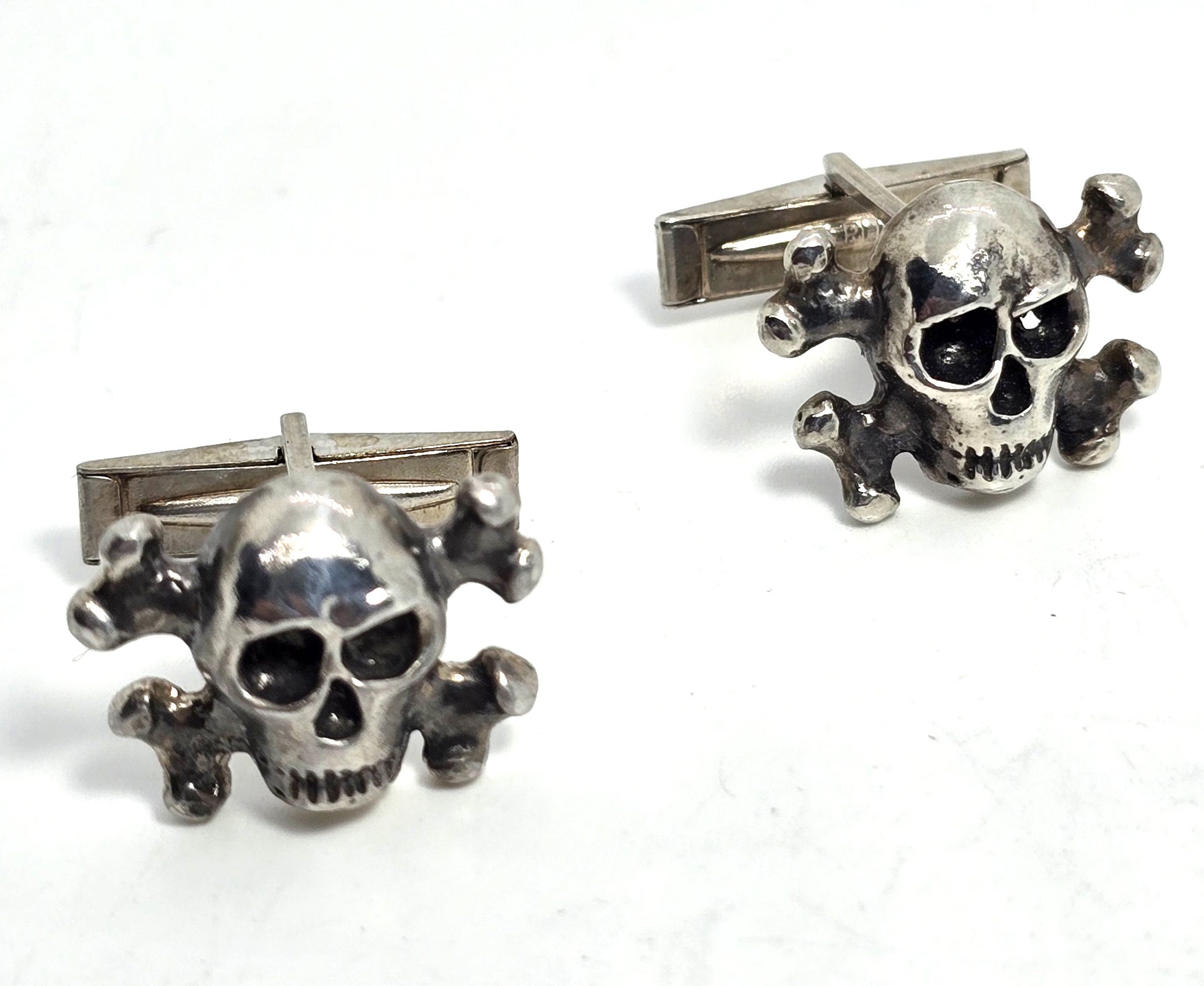 Skull and Crossbones Jolly Roger vintage pirate sterling silver cufflinks Solid sterling silver. Stamped Sterling on the fastening of each cufflink. Good vintage condition with small signs of normal vintage wear.