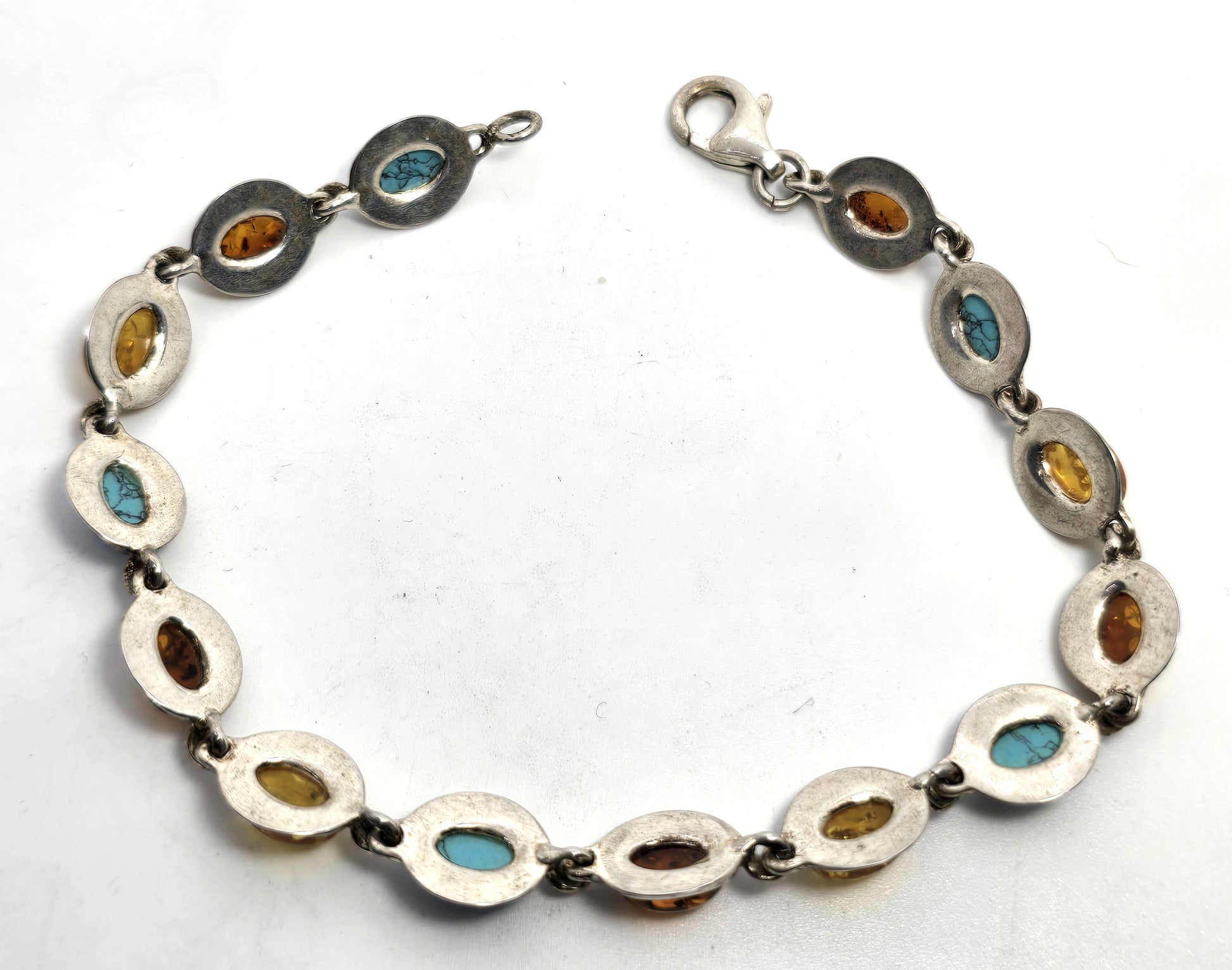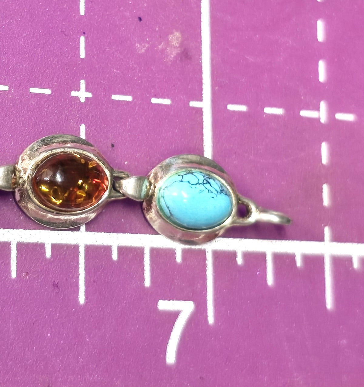 Orange and yellow Amber blue howlite sterling silver tennis bracelet. Good used condition with little to no signs of normal wear. Beautiful compressed amber cabs alternate with blue dyed howlite. Stamped 925 on the lobster clasp and loop.