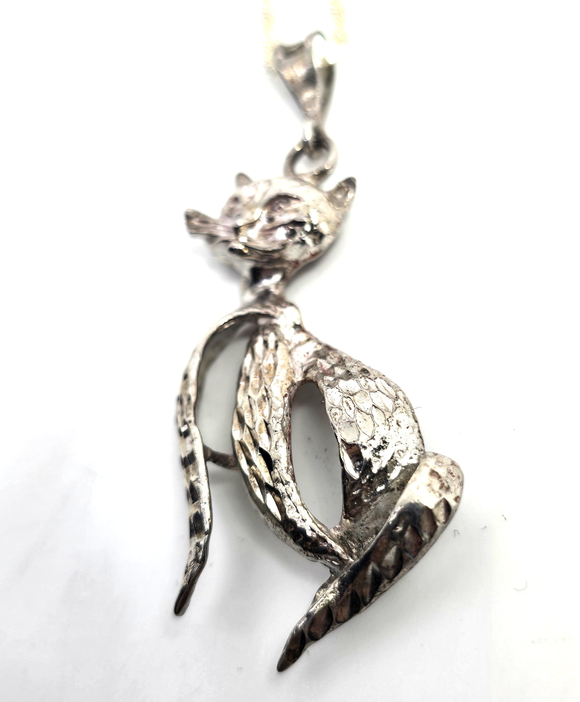 Retro Sassy French cat etched Sterling modernist mid century vintage sterling silver necklace