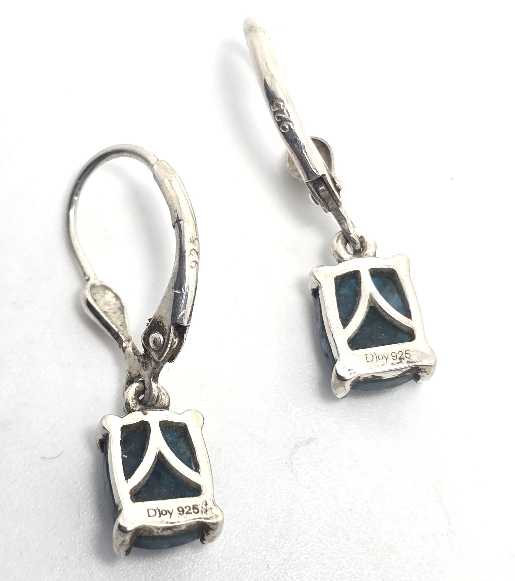 Blue apatite gemstone sterling silver D'Joy lever back earrings. Good new condition with little signs of normal wear. Stamped D'Joy 925 on the back. stones measure 3.15ct. No missing stones.