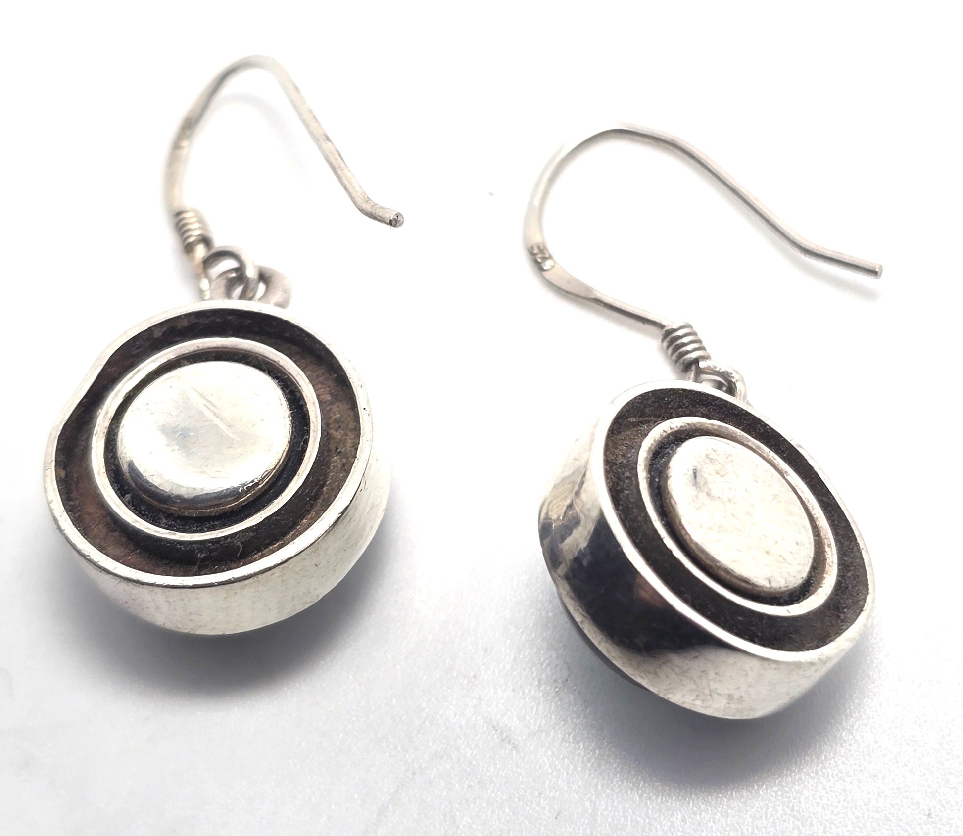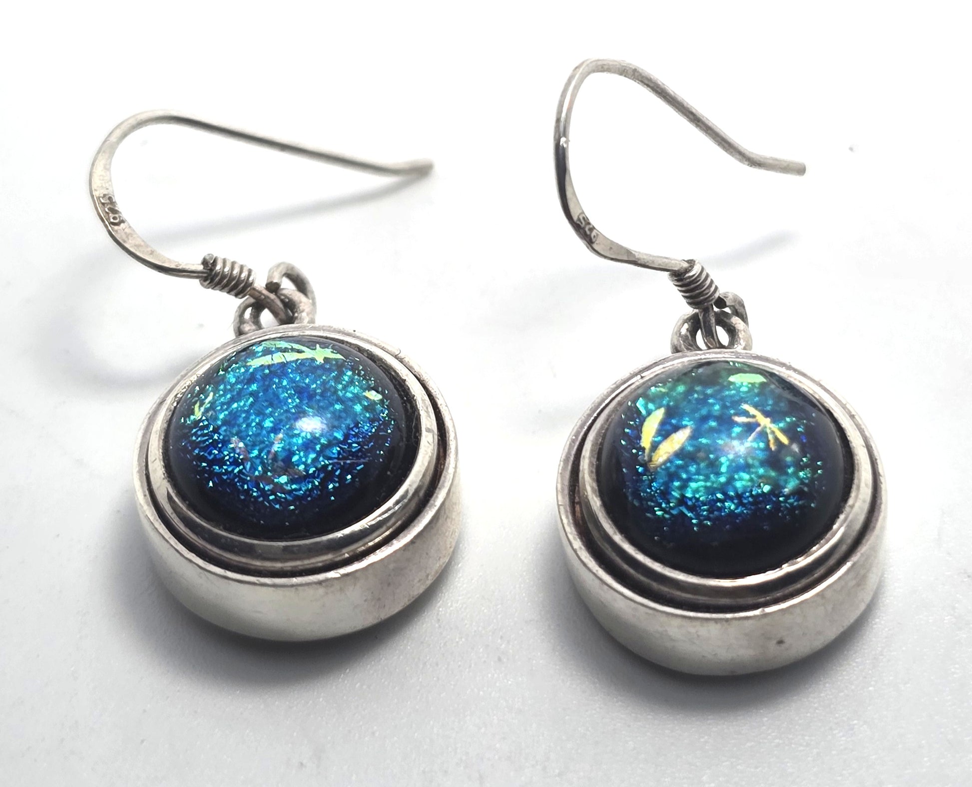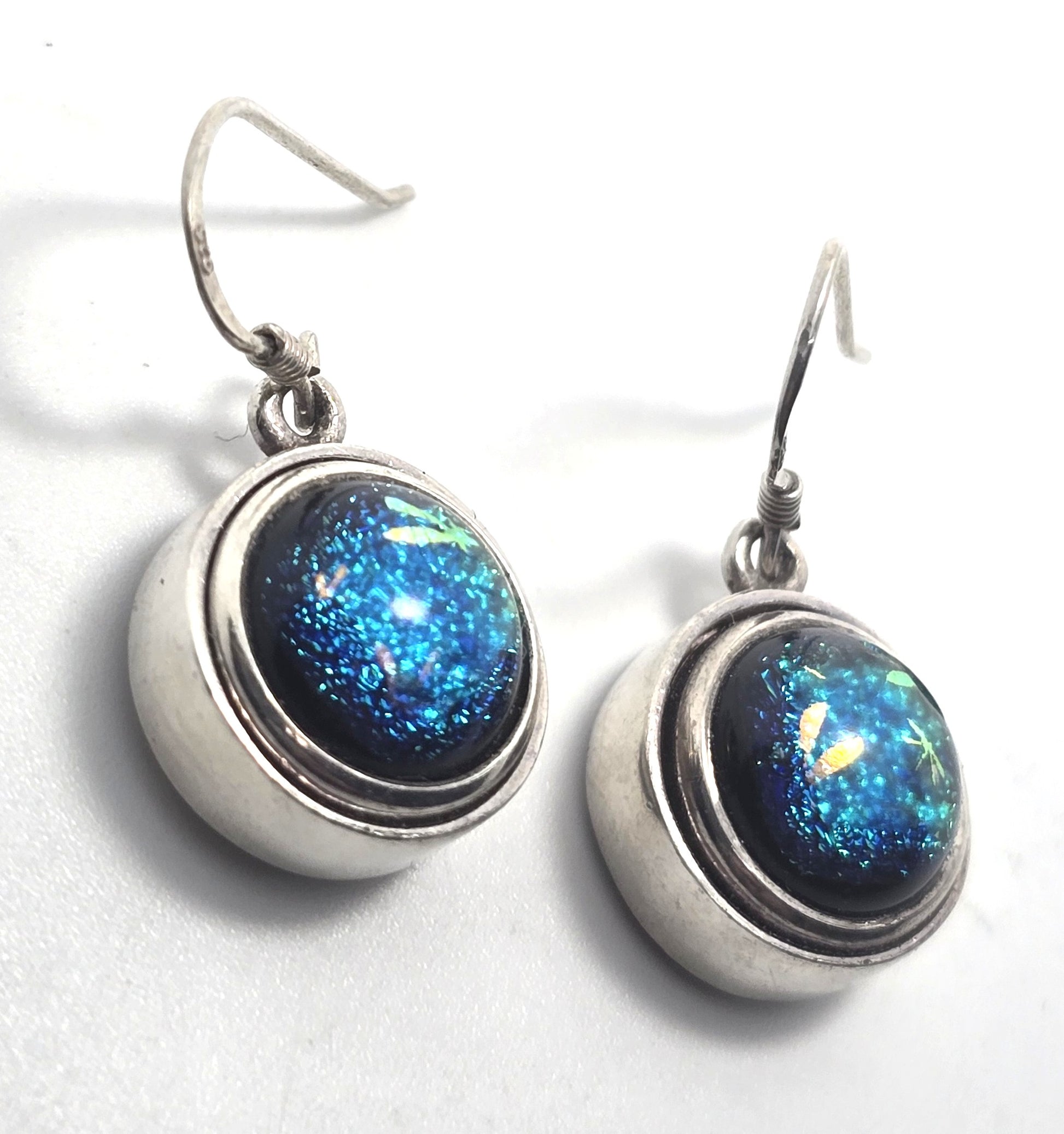 Blue Dichroic Glass gold painted vintage drop artisan sterling silver earrings. Good used condition with little to no signs of normal wear. Hook fastening. Stamped 925 on the hook fastening. Each cab is set in a very solid sterling silver setting. The face is painted with beautiful gold accents.