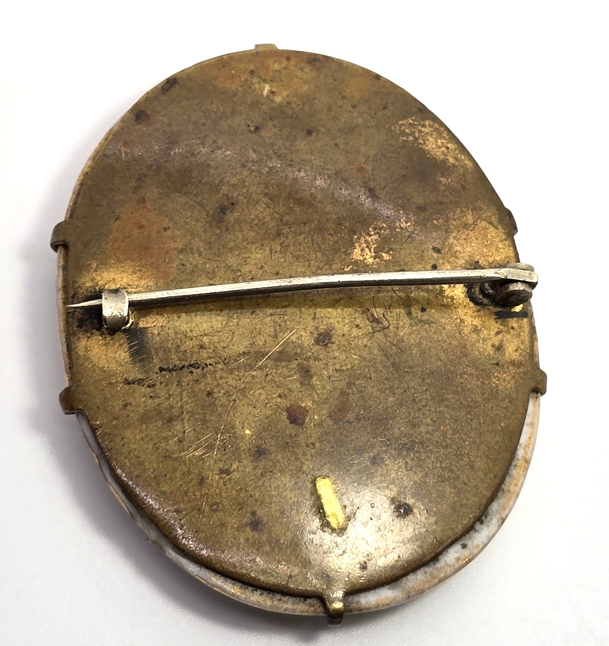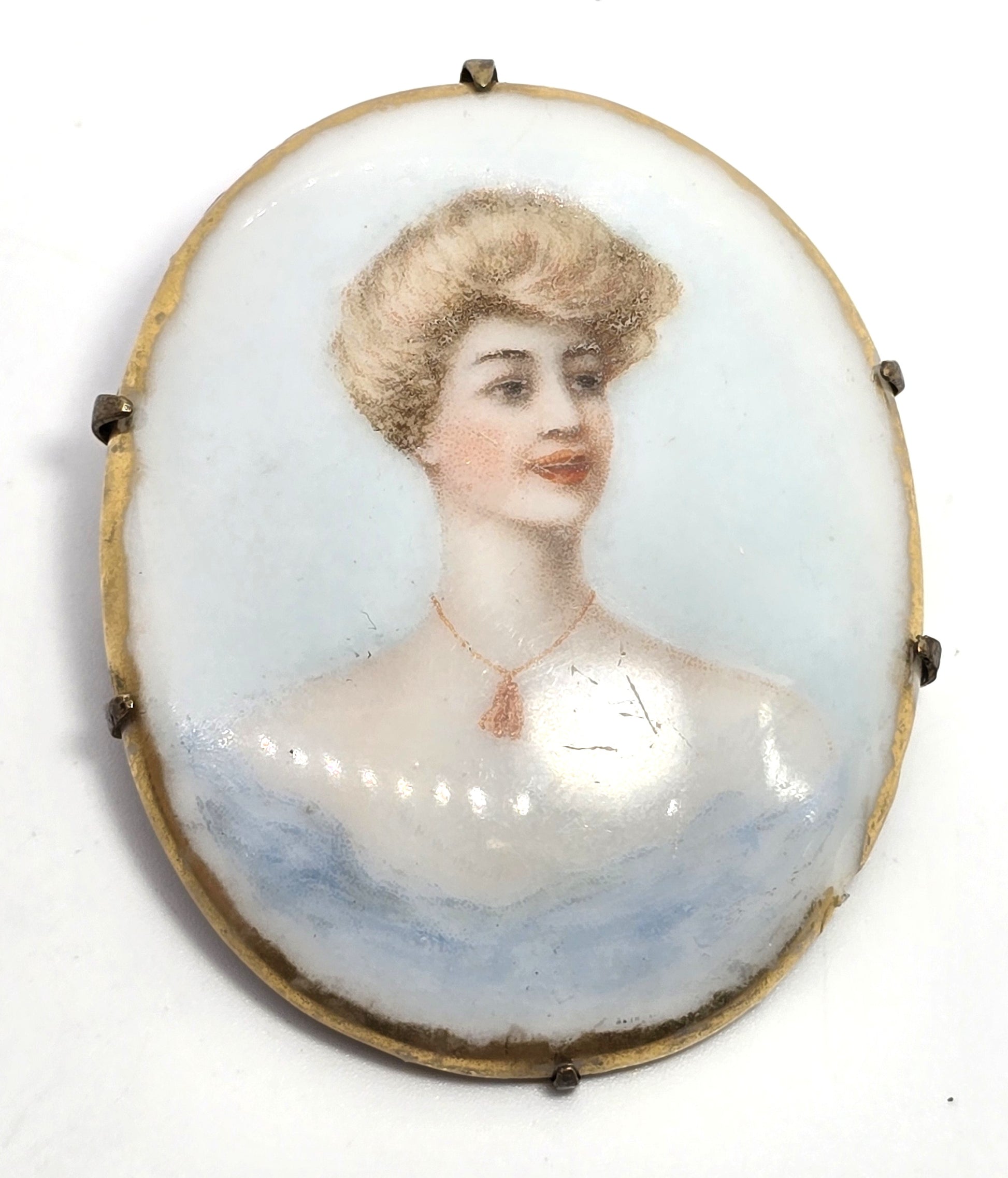 Blue Cameo women Painted Porcelain gold rimmed antique Victorian brooch. Good used condition with little signs of normal wear. Brooch fastening has C clasp. Beautiful bright colors with textured gold painted frame. Framework shows small signs of wear to paint.