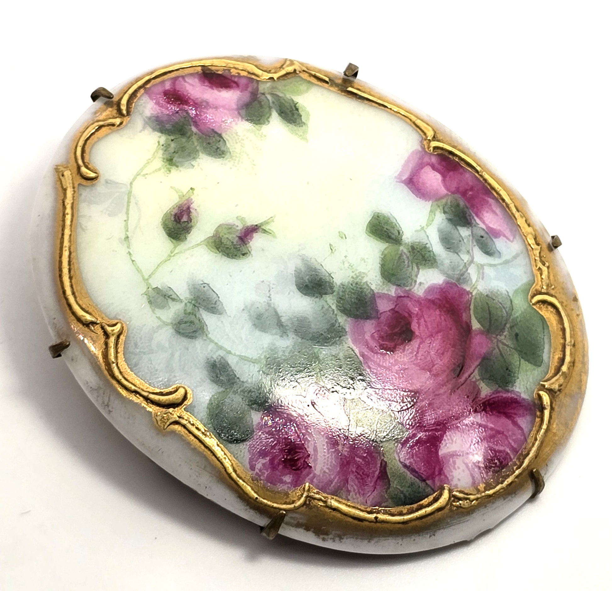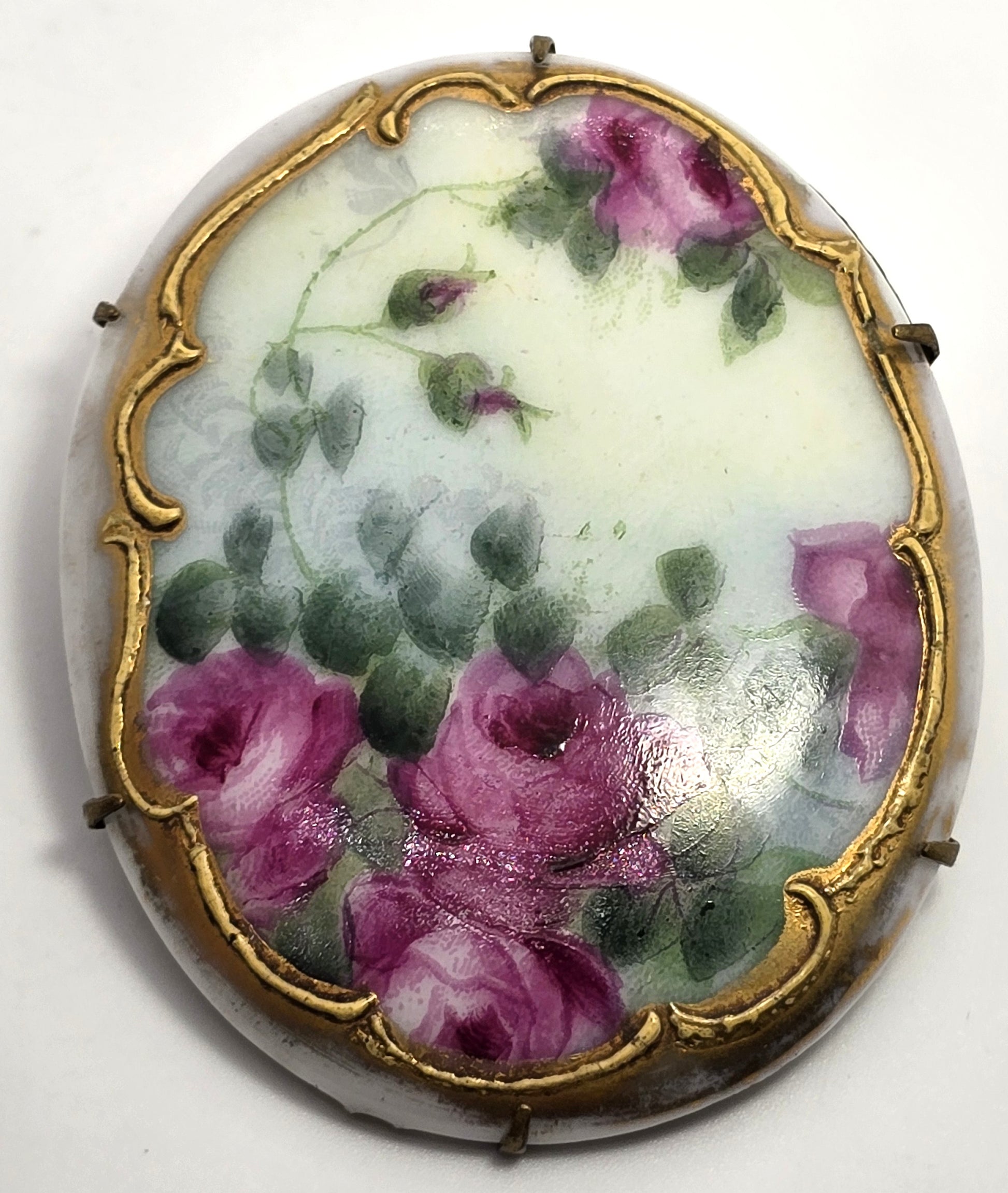 Pink Roses Painted Porcelain gold rimmed antique Victorian brooch. Good used condition with little signs of normal wear. Brooch fastening has C clasp.. Beautiful bright colors with textured gold painted frame. Framework shows signs of wear to paint around the edges.