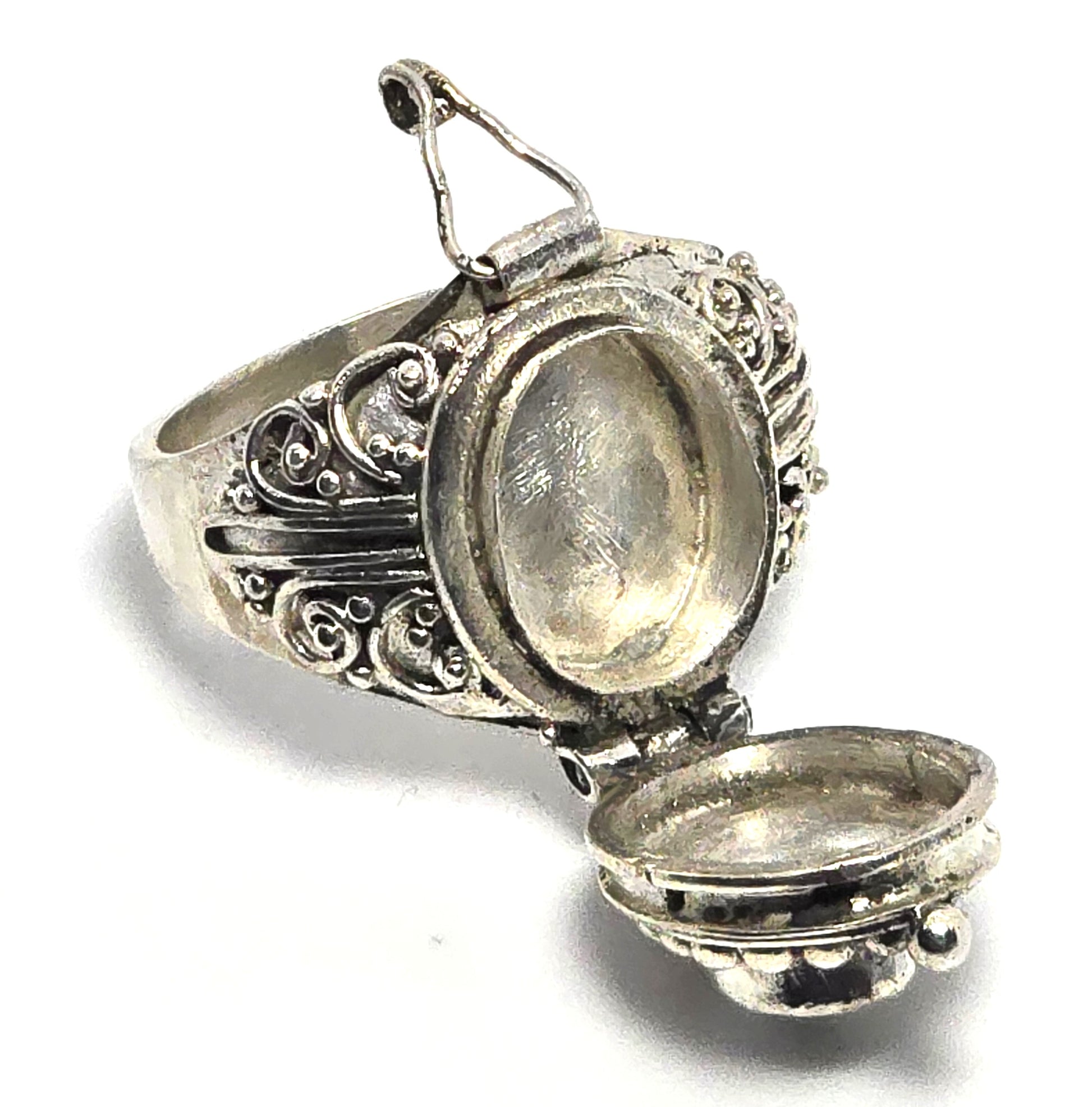 Blue topaz large Bali Balinese sterling silver vintage Poison ring. Good vintage condition with little to no signs of normal wear. Great vintage patina. Stamped 925 on the inside of the band. Solid sterling silver construction. Door opens with hinge and lock.