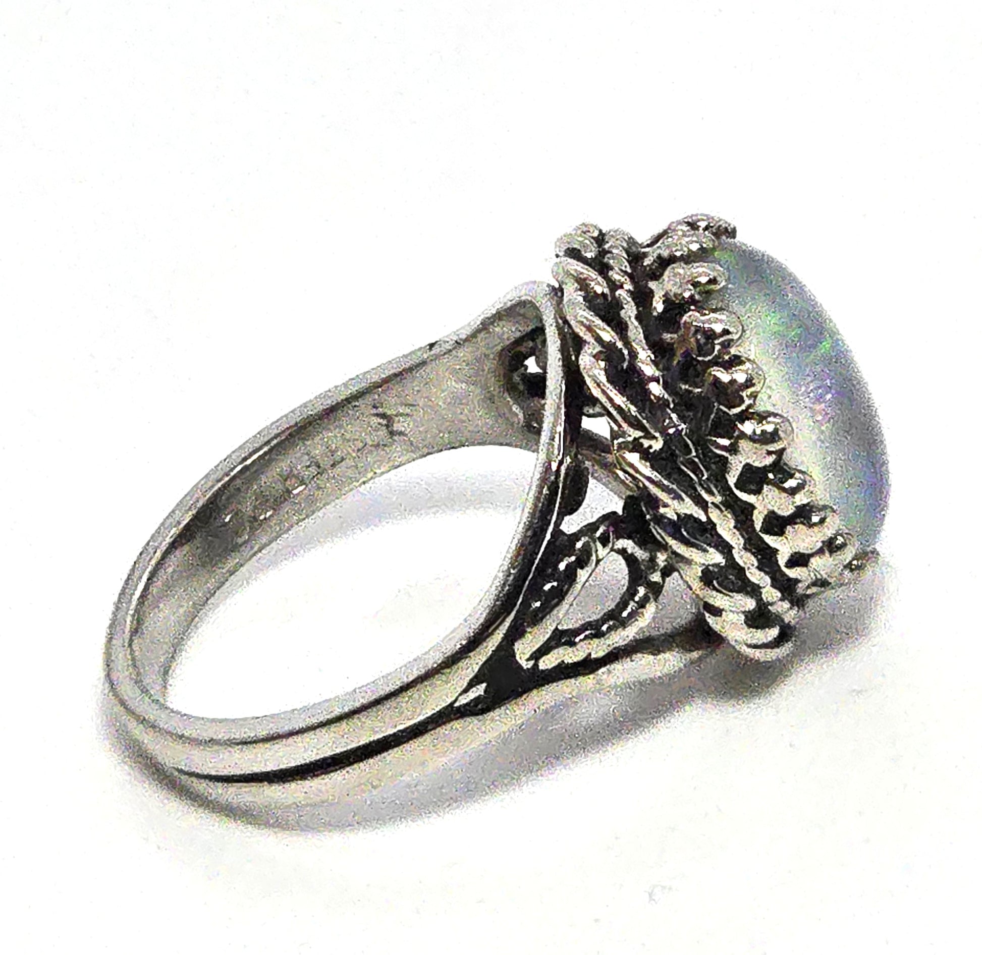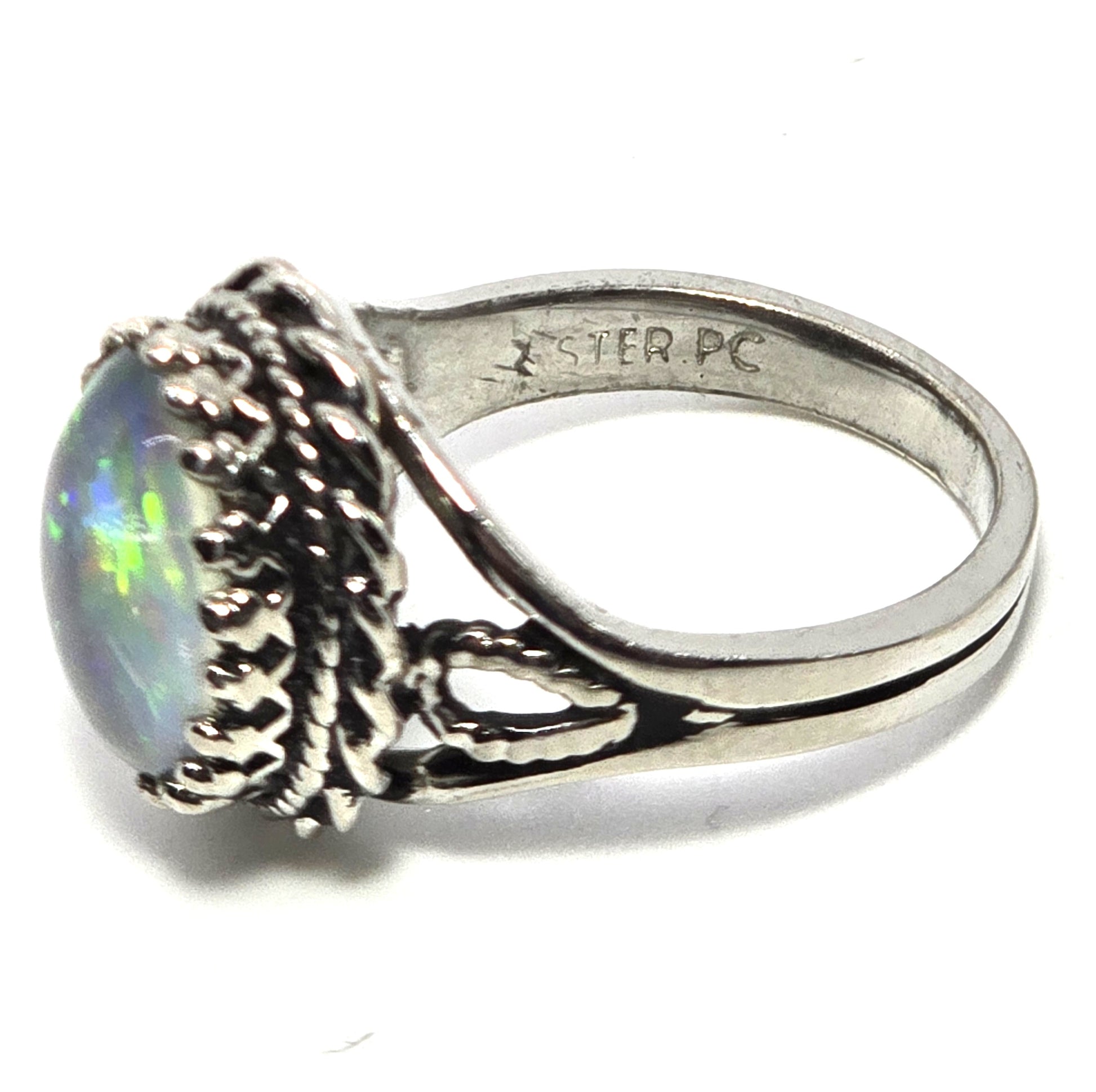 PC Black opal twisted halo signed vintage sterling silver ring. Good used condition with little to no signs of normal wear. Stamped Ster PC on the inside of the band.