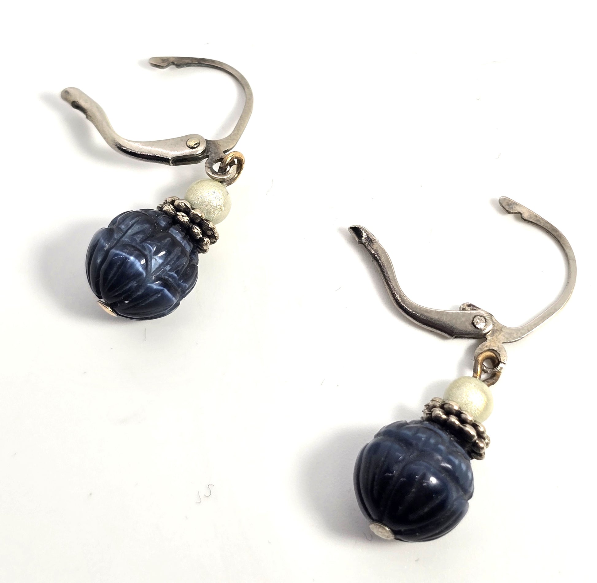 Blue tiger's eye carved beaded silver plated gemstone vintage earrings