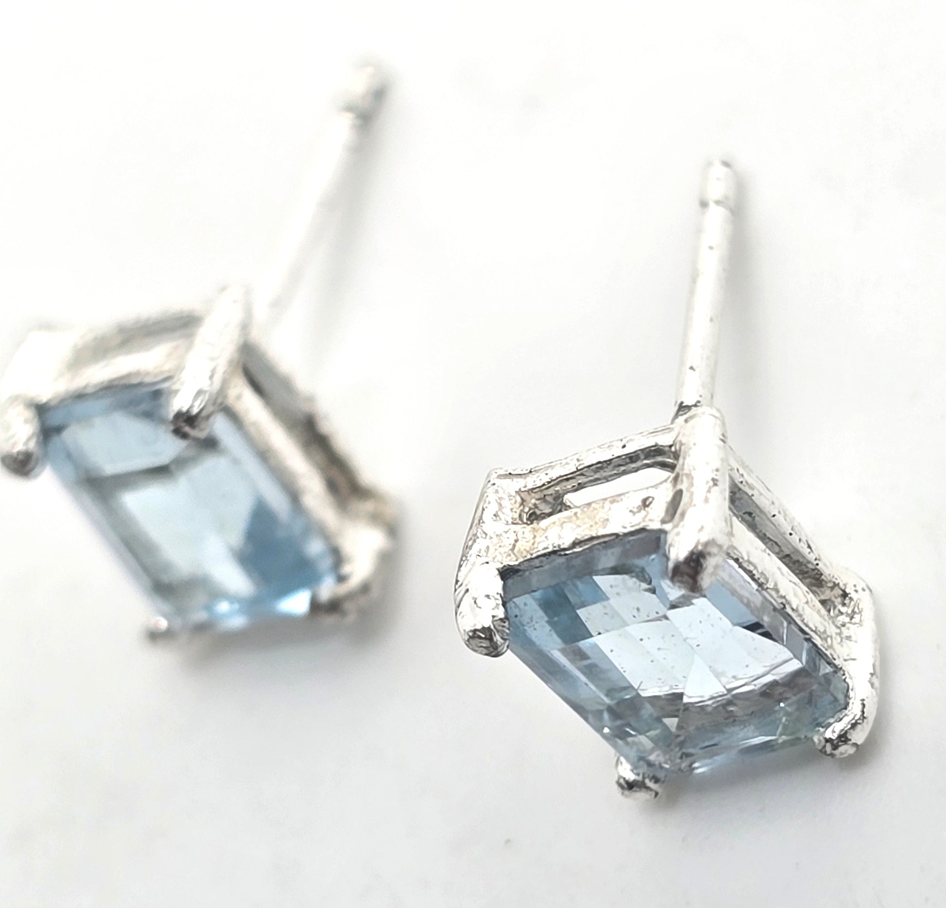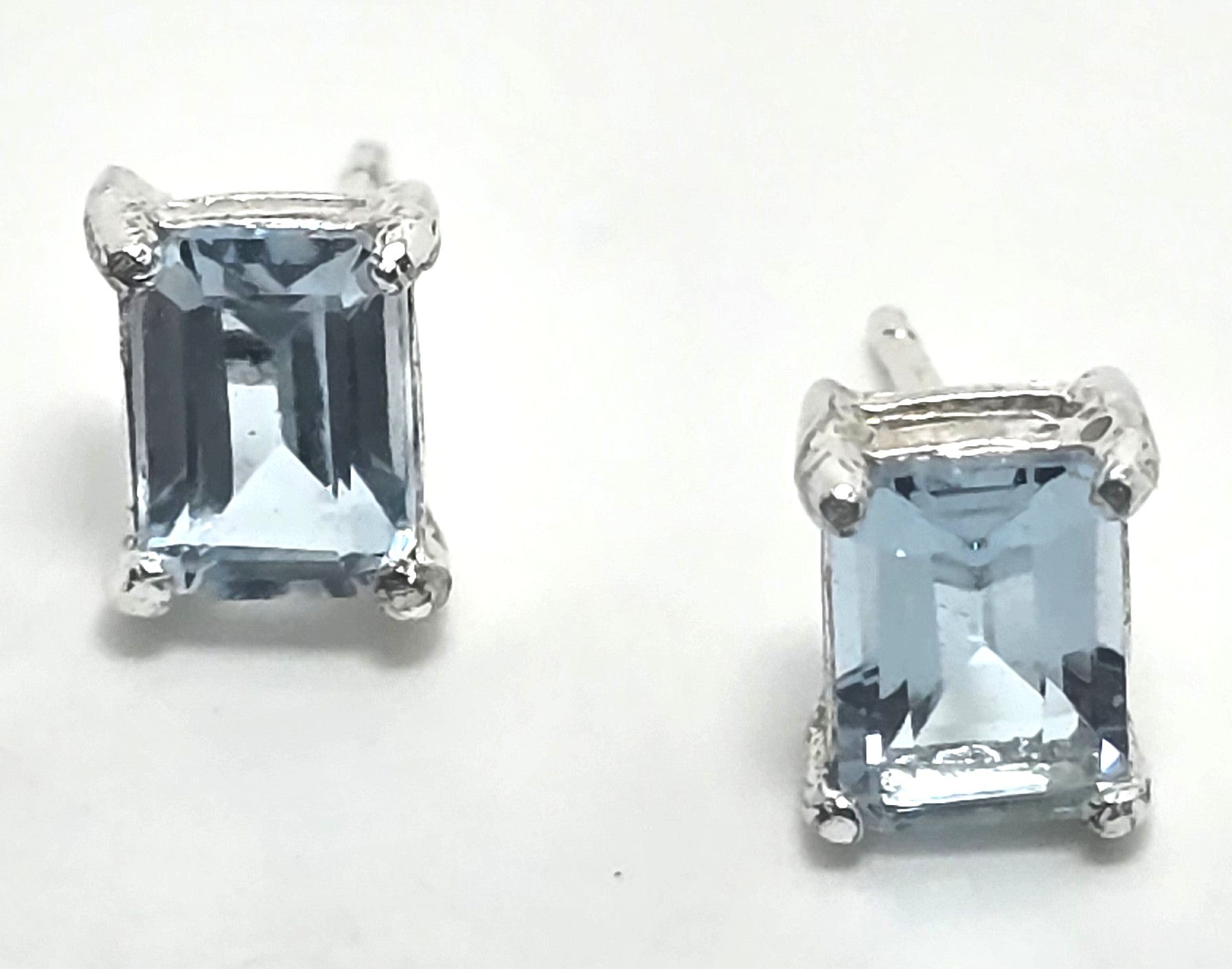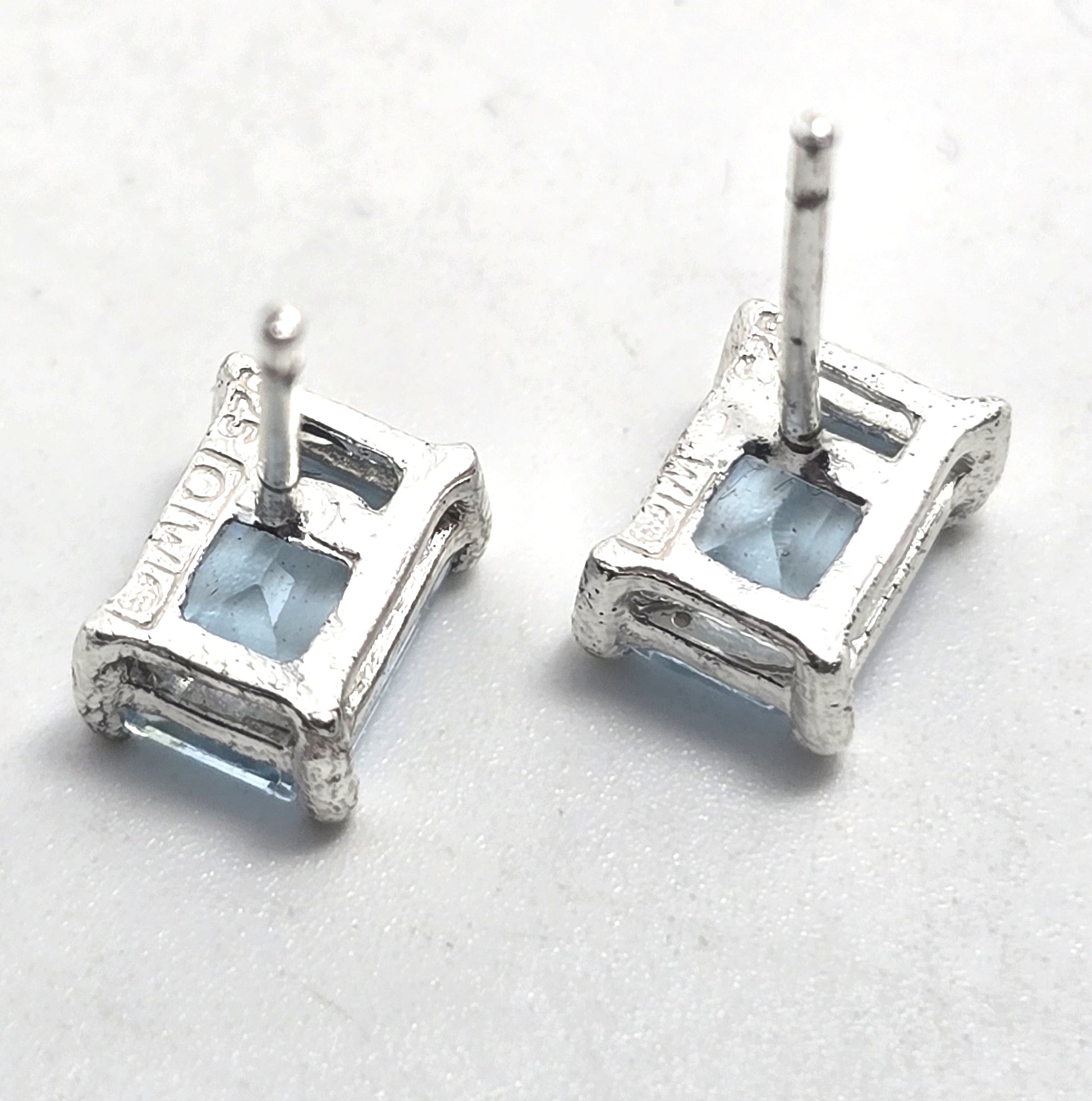 Blue Topaz 1.4 Ct sterling silver emerald cut stud earrings. Good used condition with litle to no signs of normal wear. Earrings are stamped 925 and what looks like OTW for a hallmark on the back of the stud earrings. All post earrings come with new sterling silver earring backings.