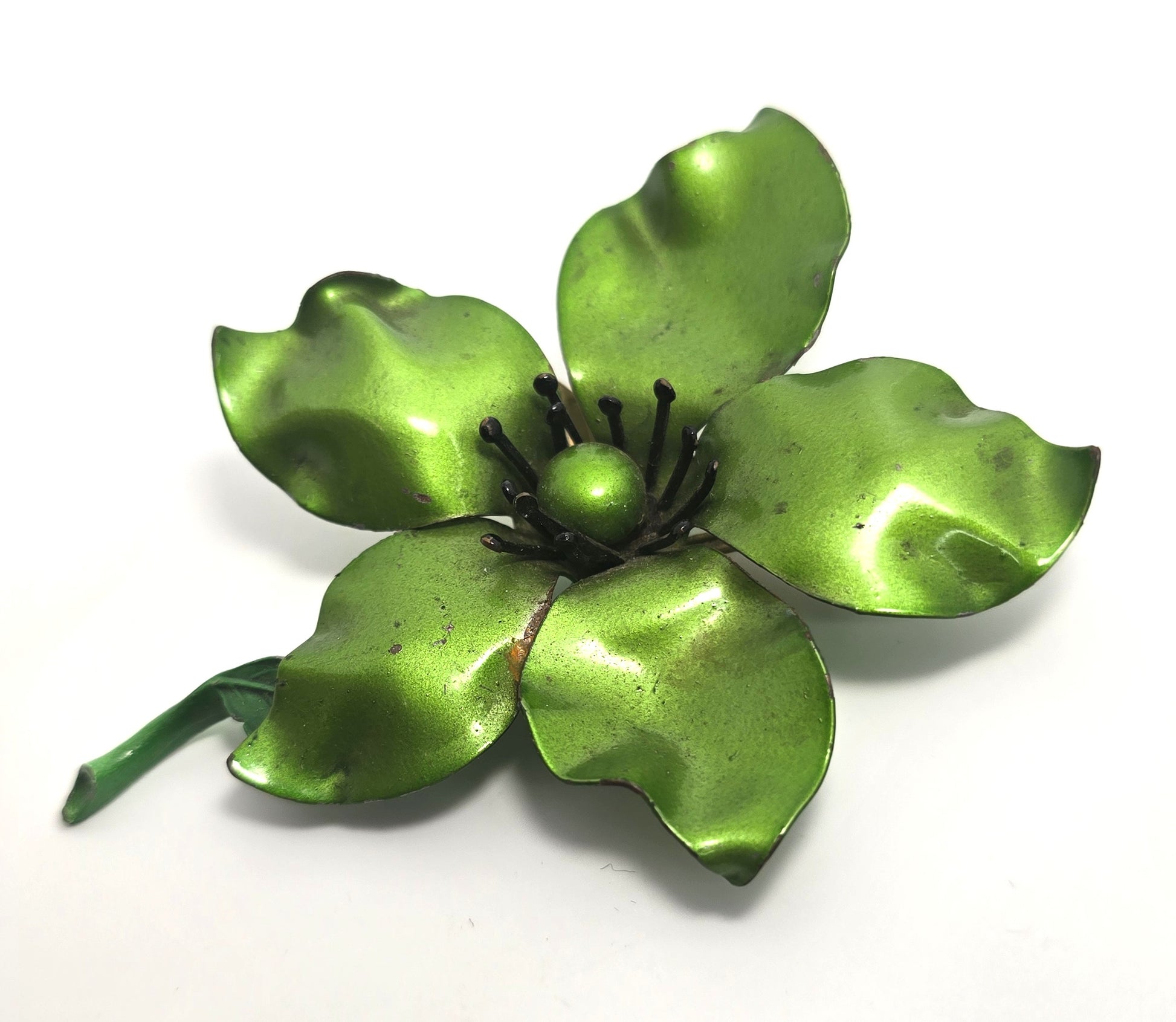 Green vintage Large retro enamel flower tin pin flower bouquet mid century brooch. Good used condition with some signs of wear. Enamel has small chips on some of the large 3D petals, Green stem is in good shape.