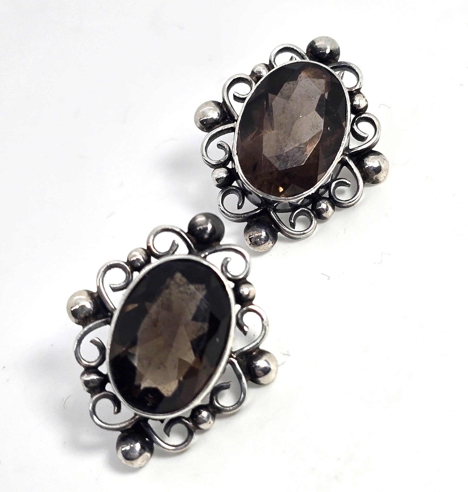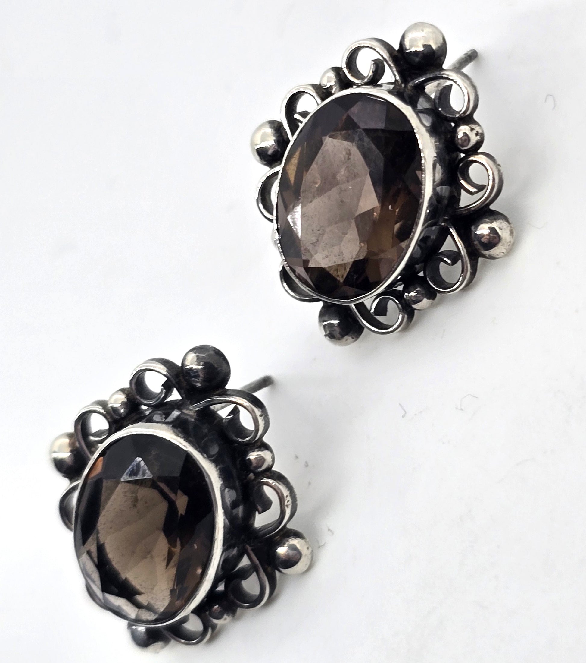 Brown smokey quartz vintage filigree sterling silver stud earrings. Good used condition with little to no signs of normal wear. Stamped 925 with an unidentified hallmark on the back of the earrings. Post fastening. All post earrings come with new sterling silver butterfly earring backings.
