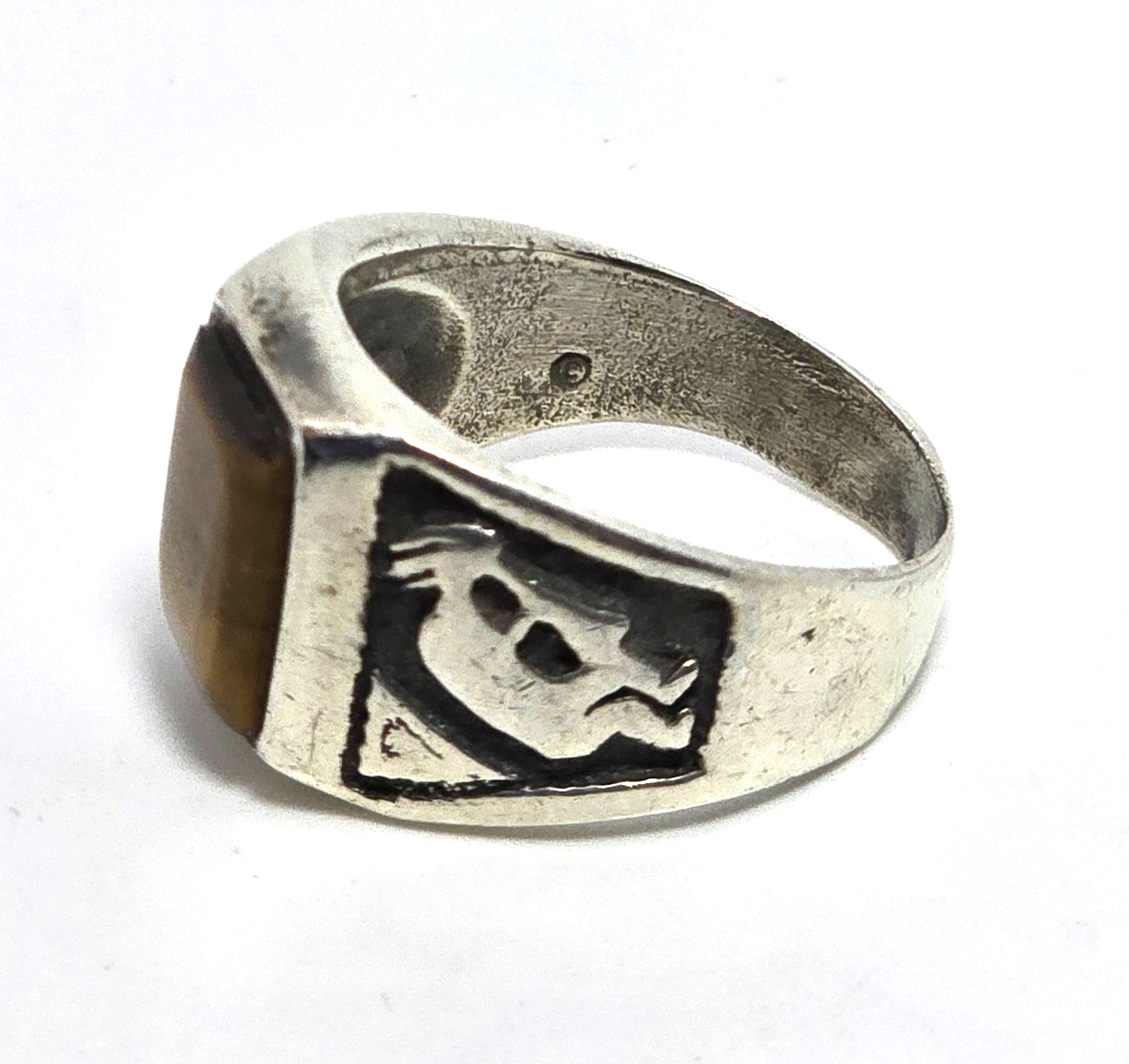 Brown Tiger's eye Kokopelli Native American sterling silver ring. Good used condition with little to no signs of normal wear. Stamped on the inside of the band Sterling 7.