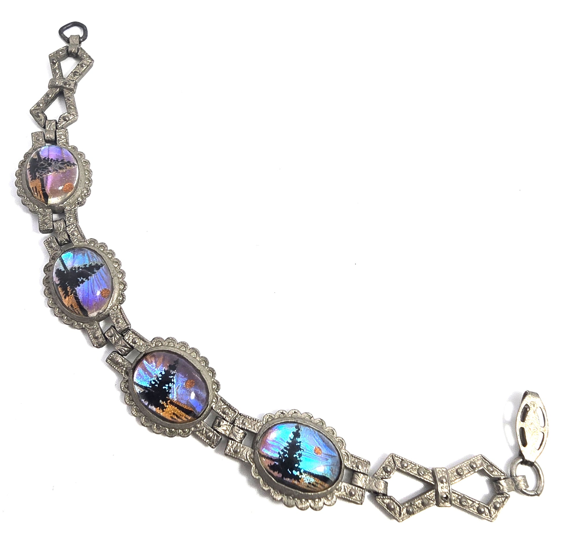 Butterfly wing silhouette landscape vintage Art Deco tennis bracelet. Good vintage condition with little signs of normal vintage wear. Butterfly wings are in good condition with bright colors. Art Deco pot metal setting with fold over clasp.
