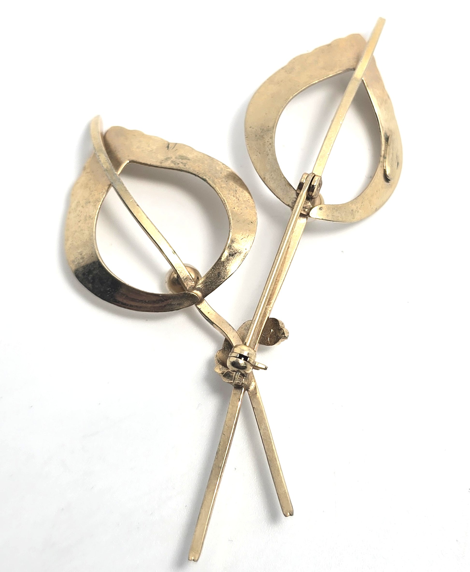 Brooch measures 2 and 7/8ths of an inch tall and 1 and 3/4ths of an inch wide.
