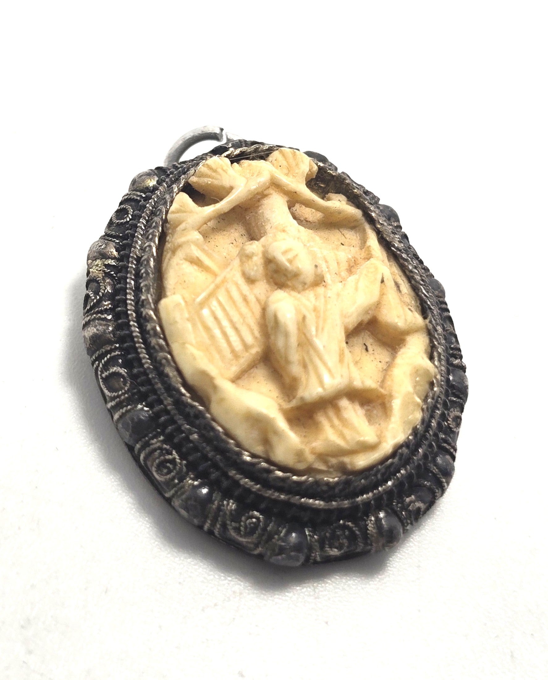 Carved Chinese Export antique sterling silver filigree geisha pendant.
