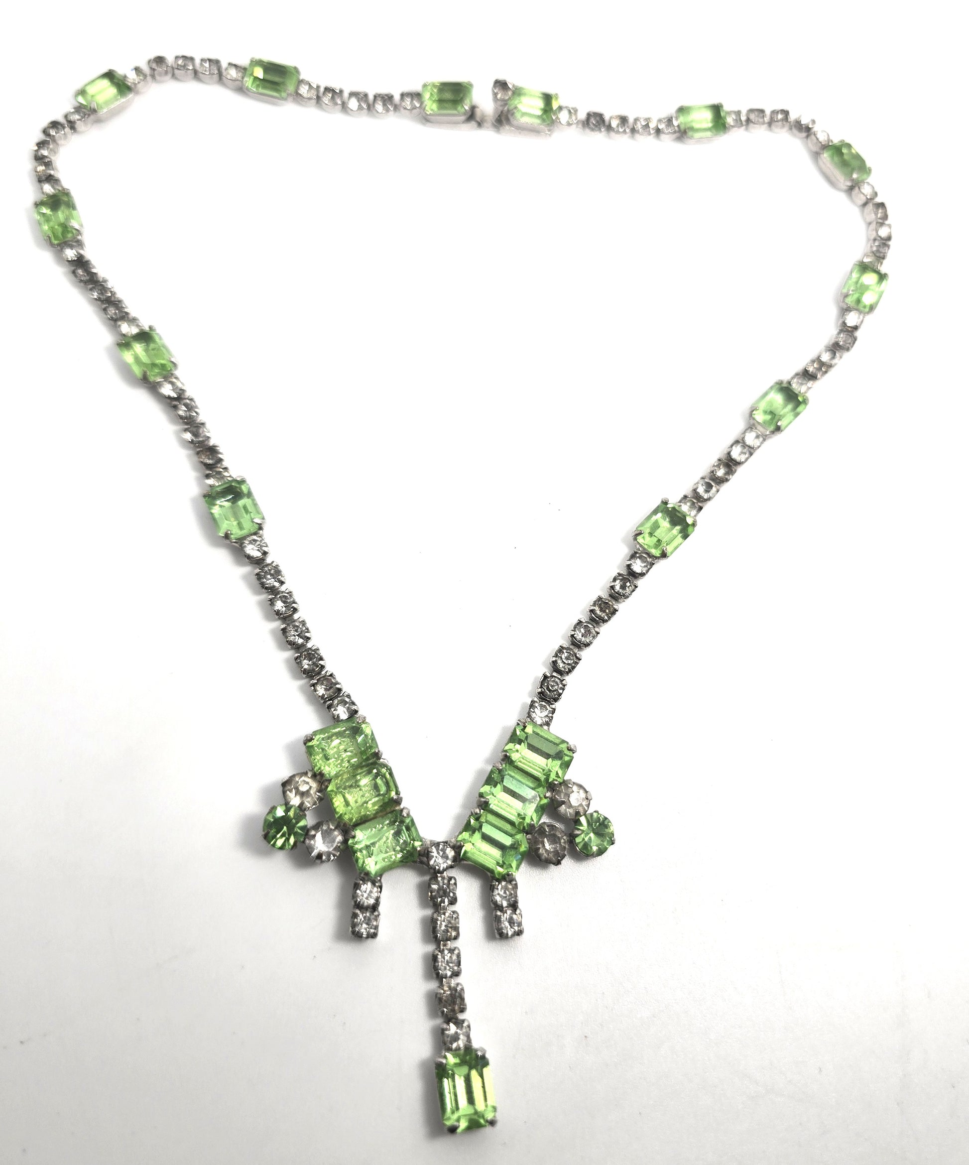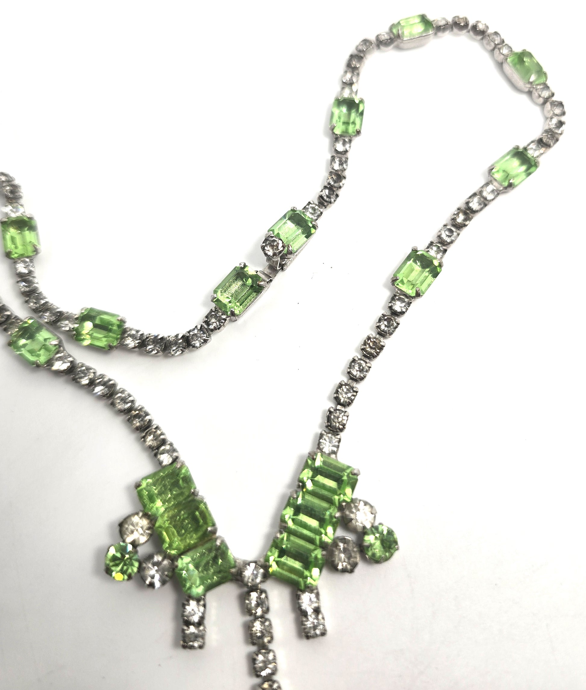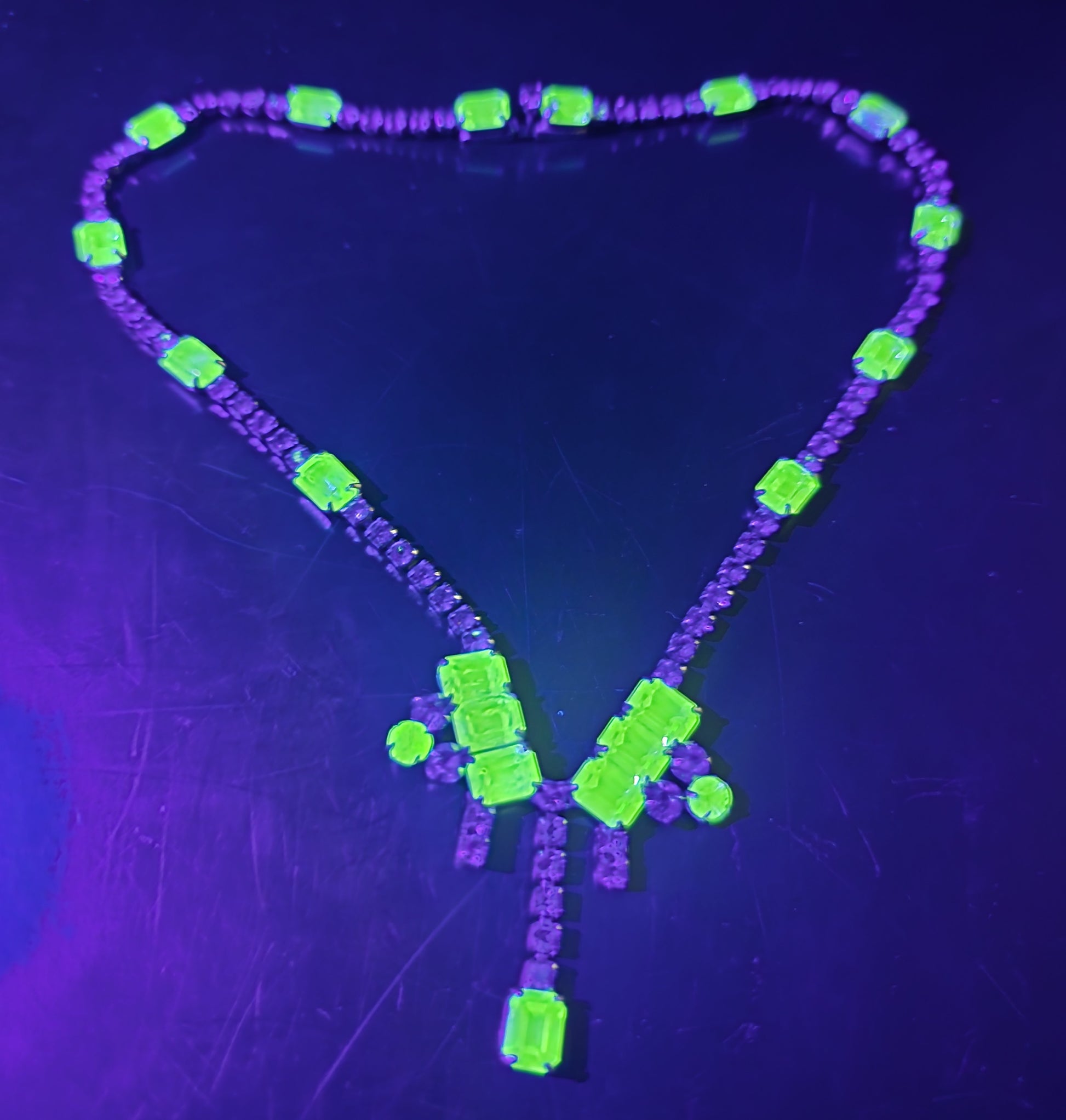 Uranium Glass and clear rhinestone drop vintage choker Necklace Beautiful faceted uranium glass rhinestones. Good vintage condition with little to no signs of normal wear.. Prong set in silver toned setting. Clasp has rhinestone accents.