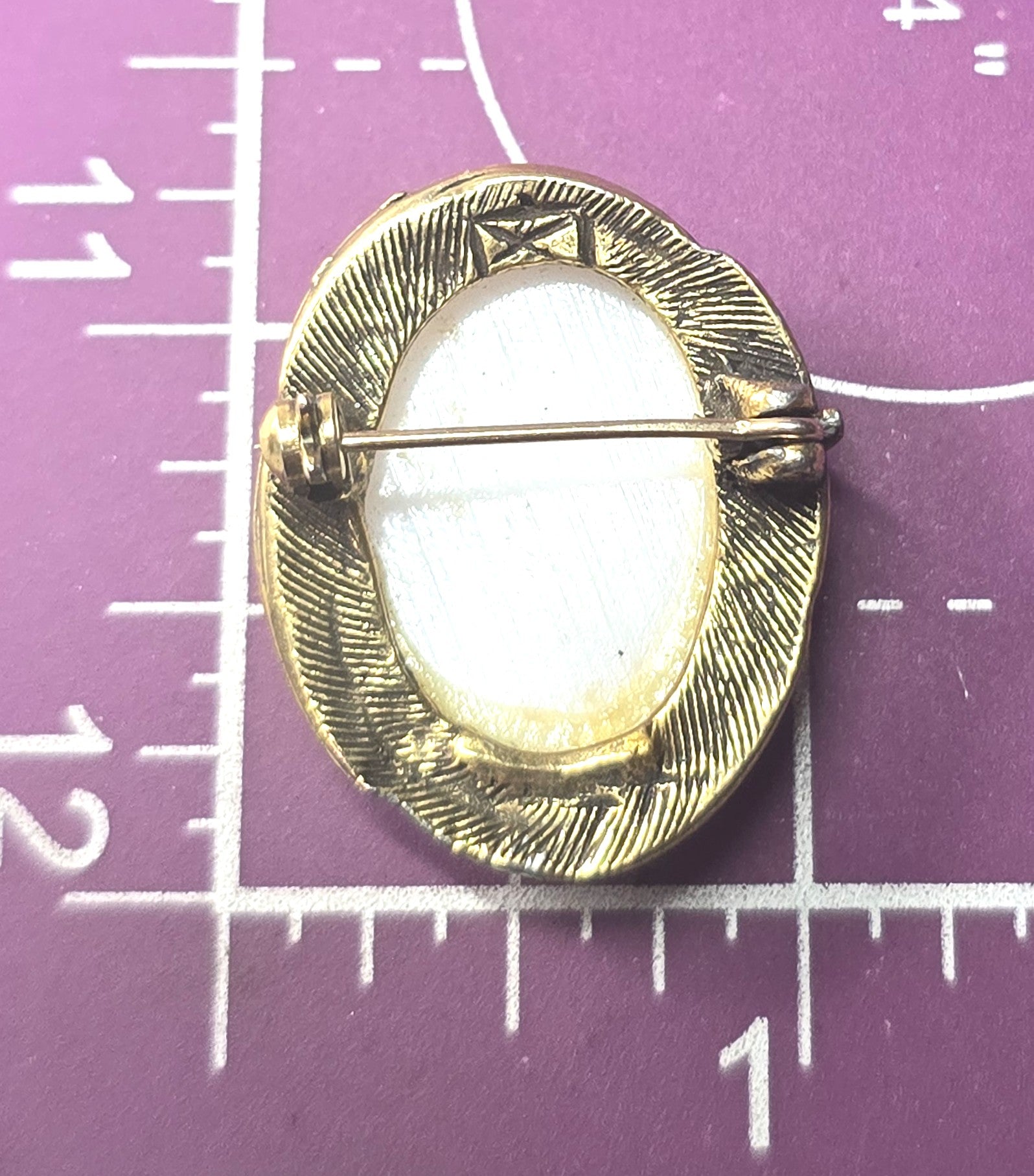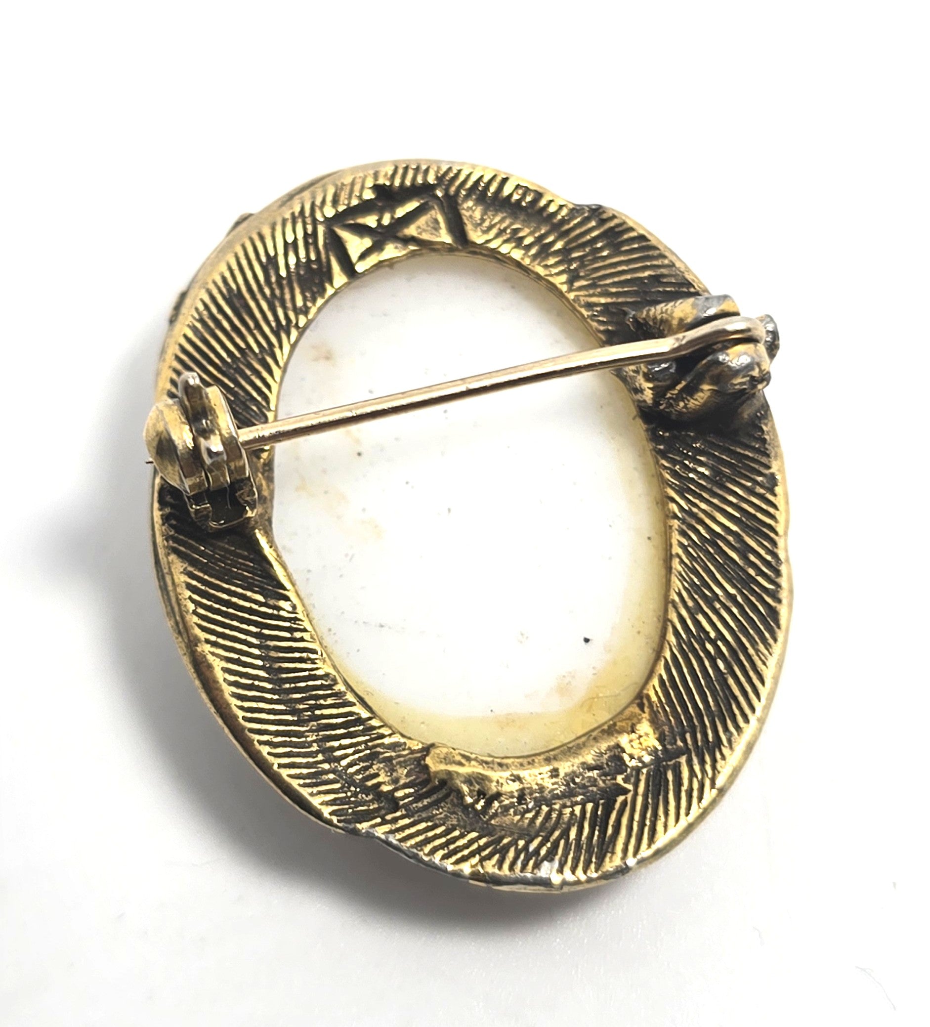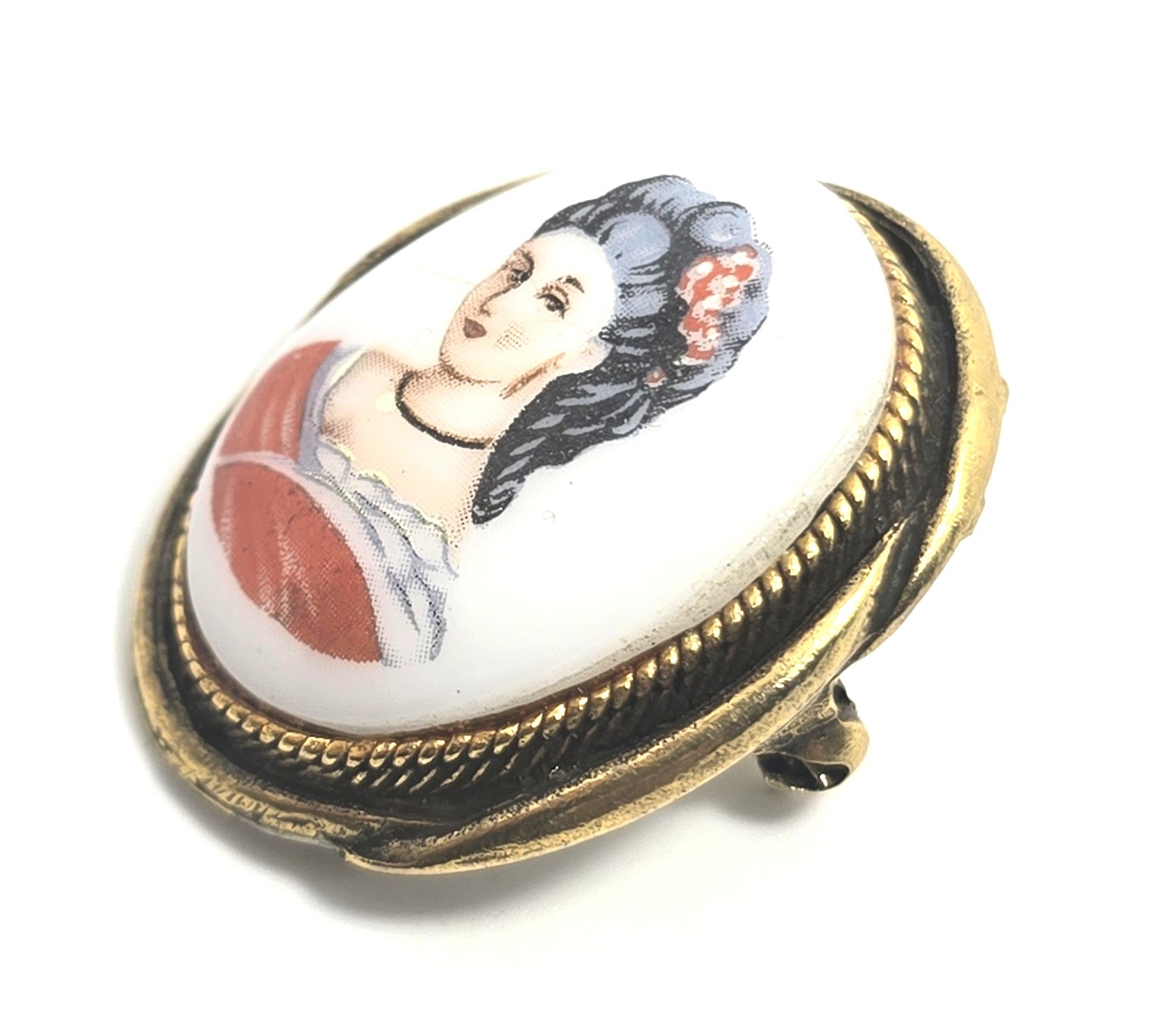Cameo red woman porcelain transferware mid century vintage cameo brooch. Good vintage condition with little signs of normal wear. Beautiful detailed gold toned frame with twisted rope halo.