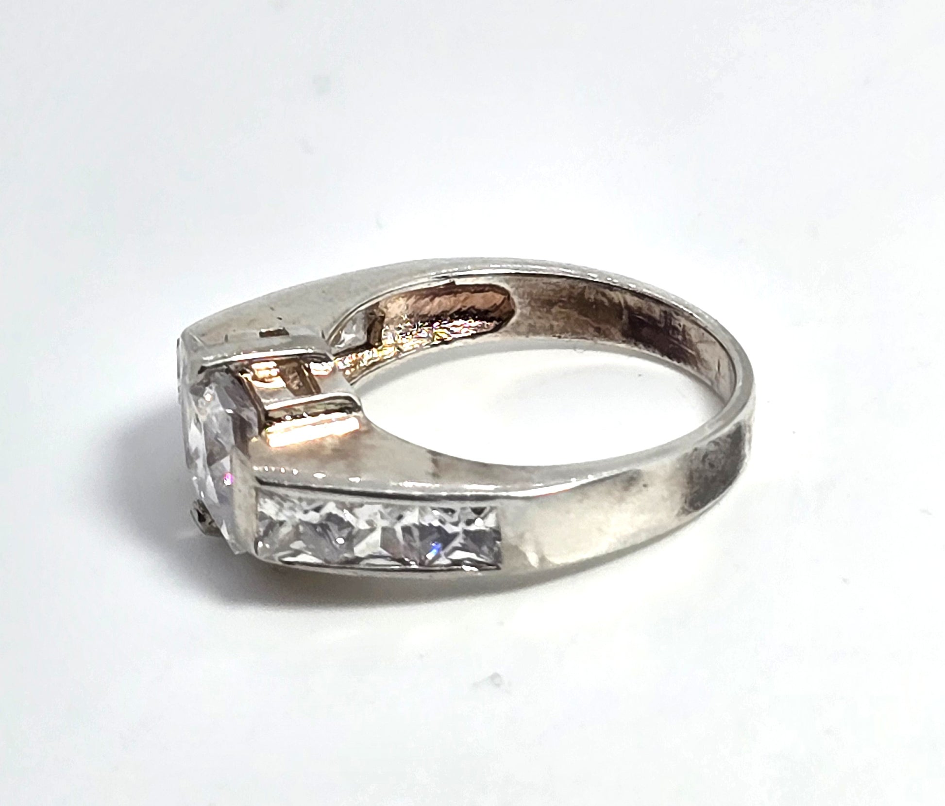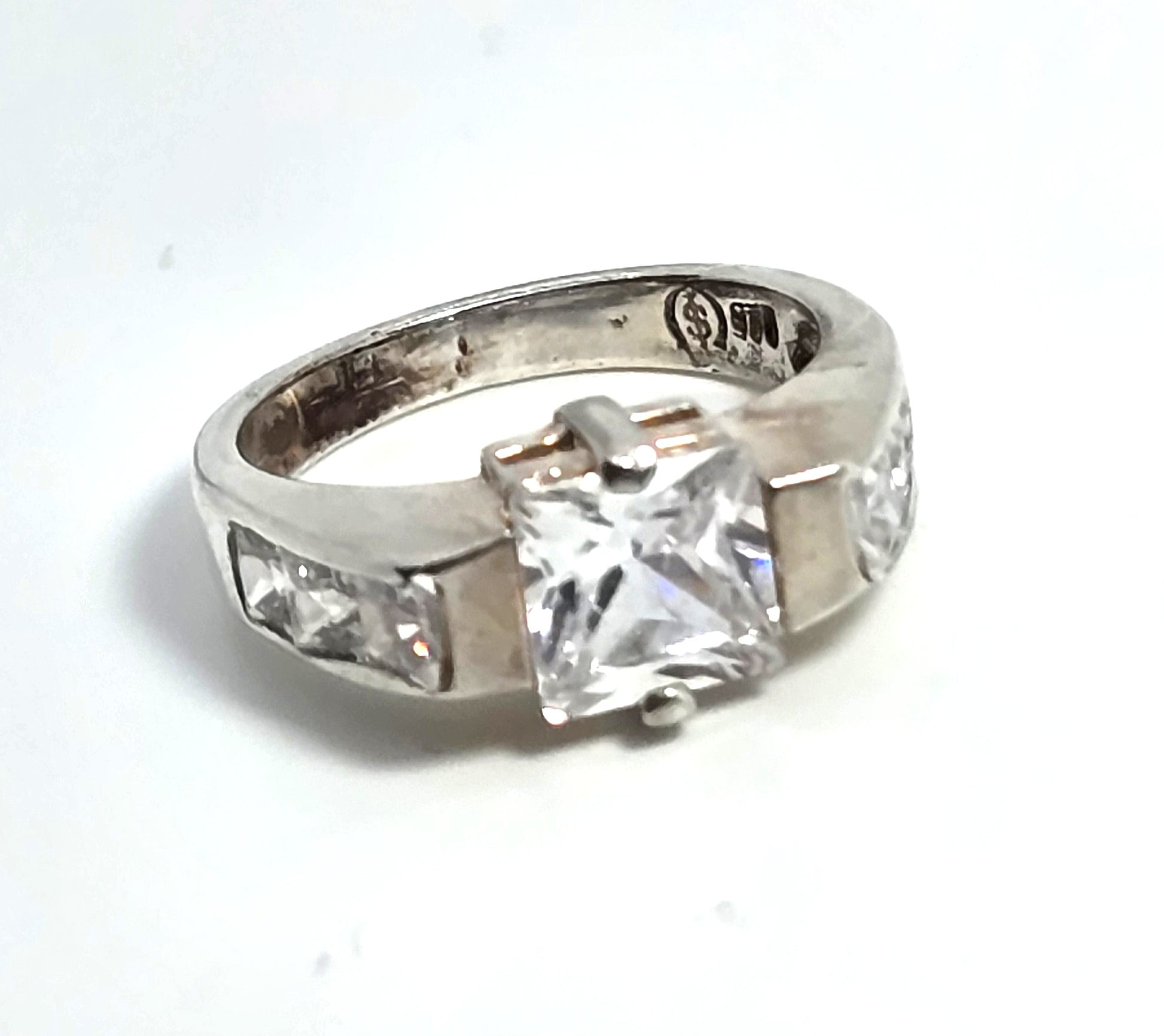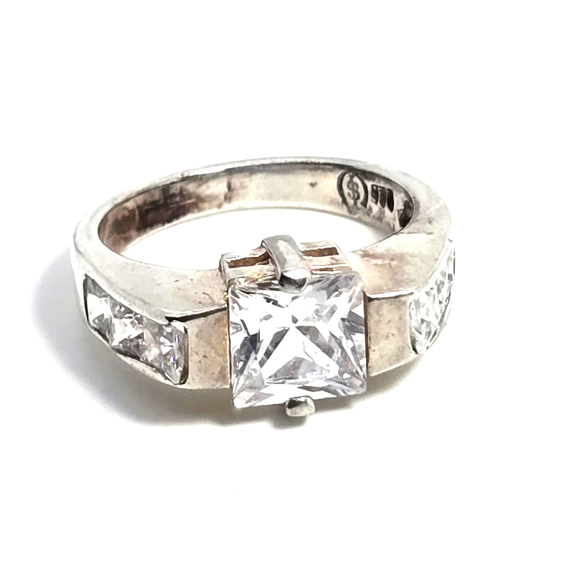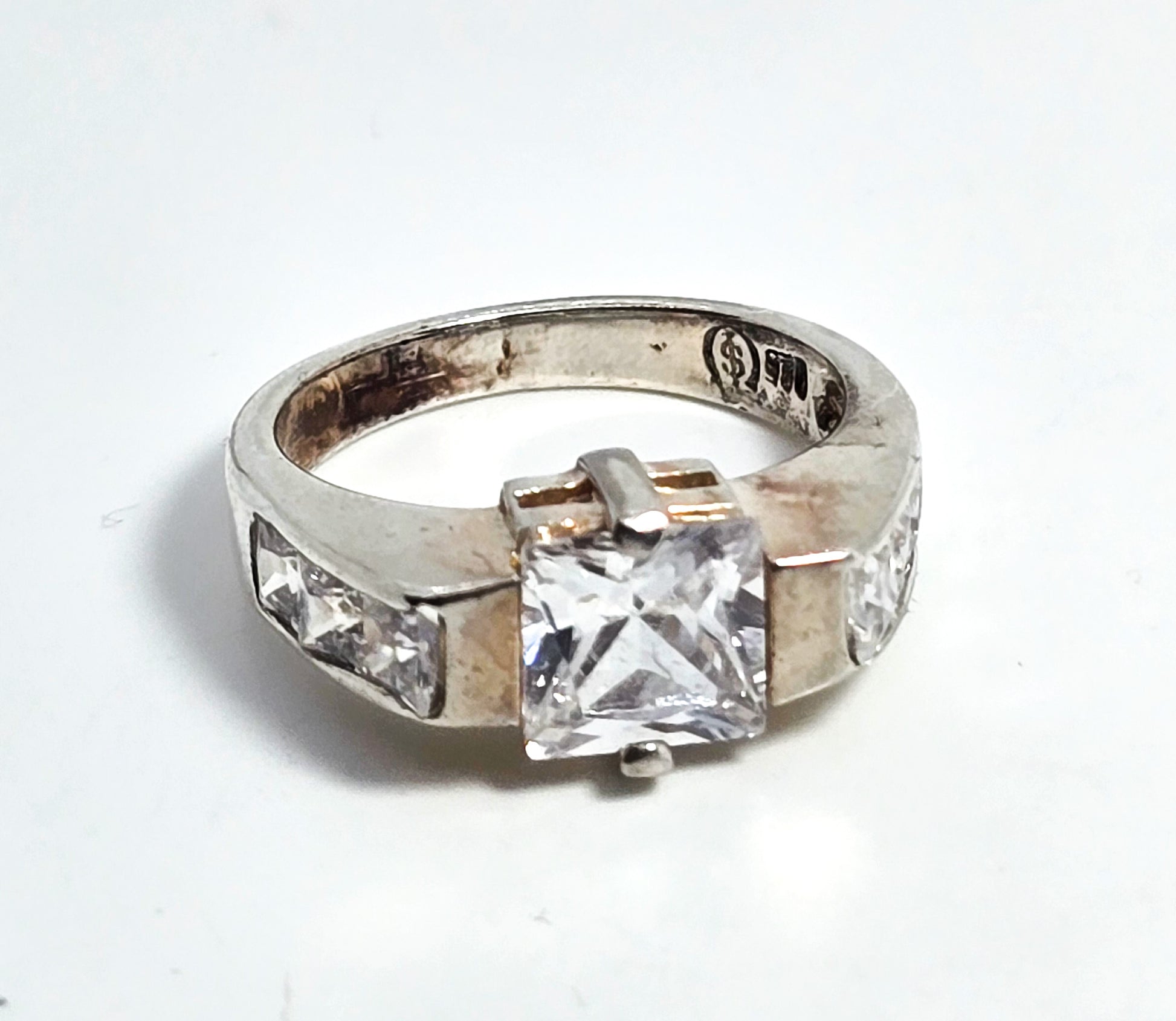 Cubic Zirconia multi 7 stone sterling silver channel set engagement ring. Good used condition with little to no signs of normal wear. Stamped on the inside of the band 925 and the $ hallmark for Shube which is now Dakota West. No missing stones.