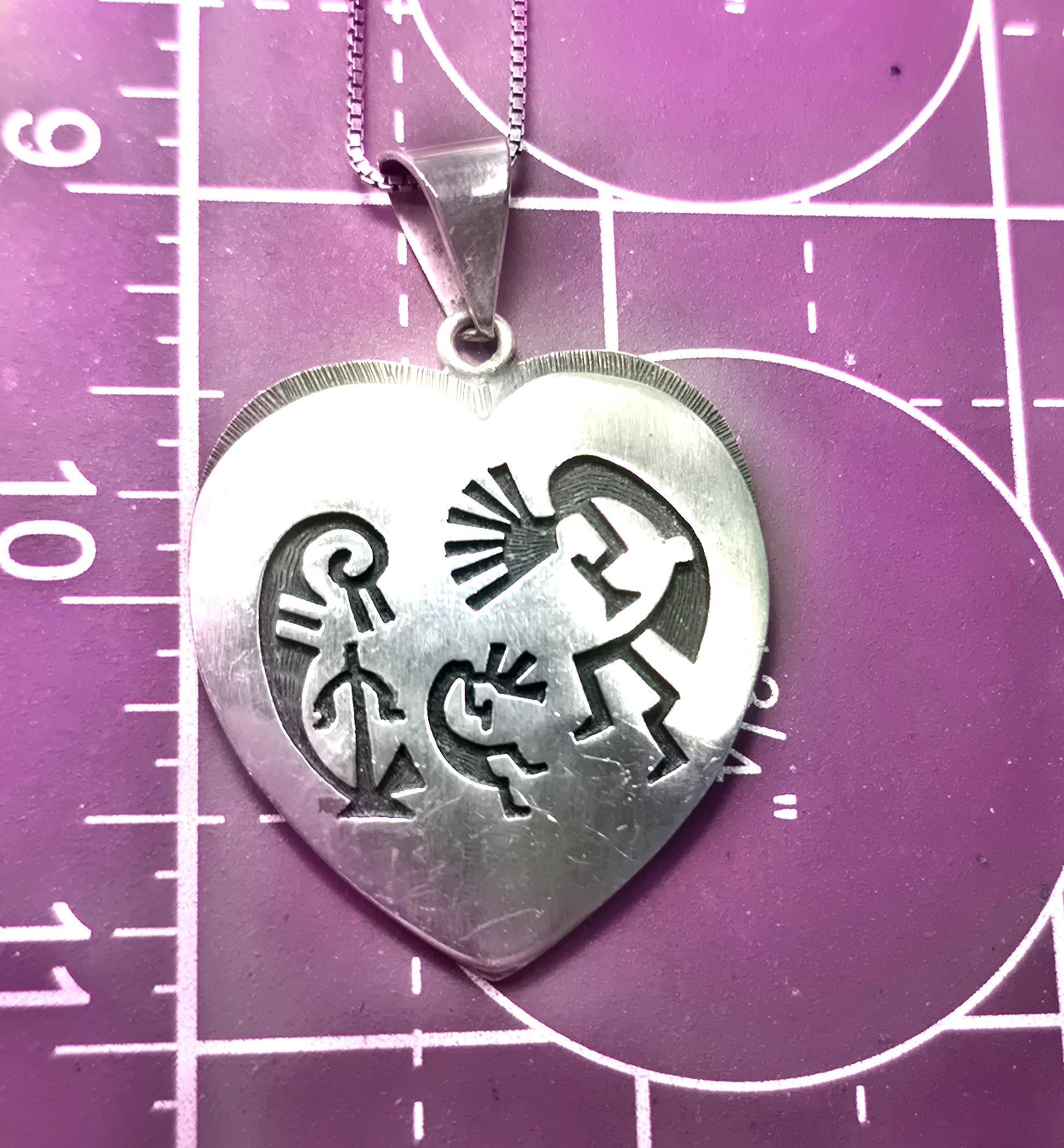 Dancing Kokopelli Vintage Native American Sterling Silver heart pendant necklace