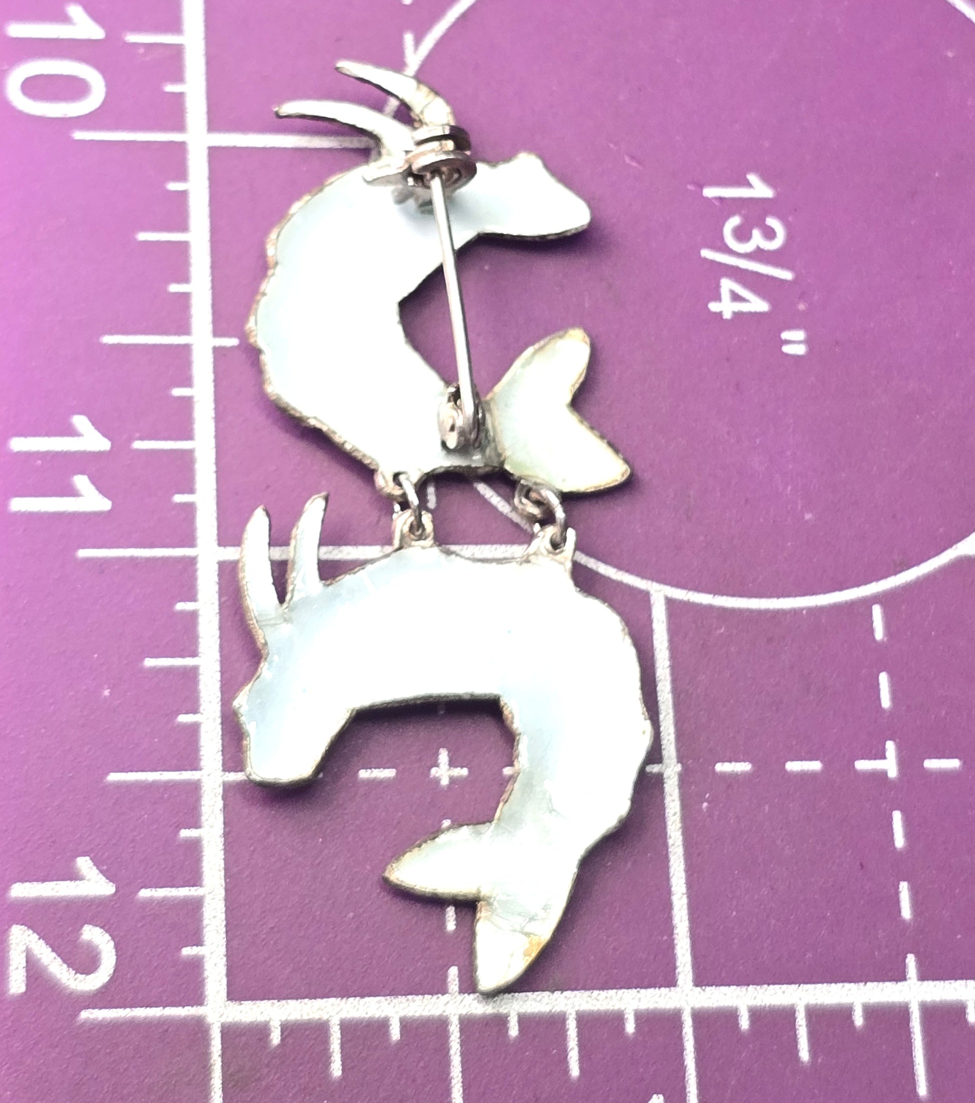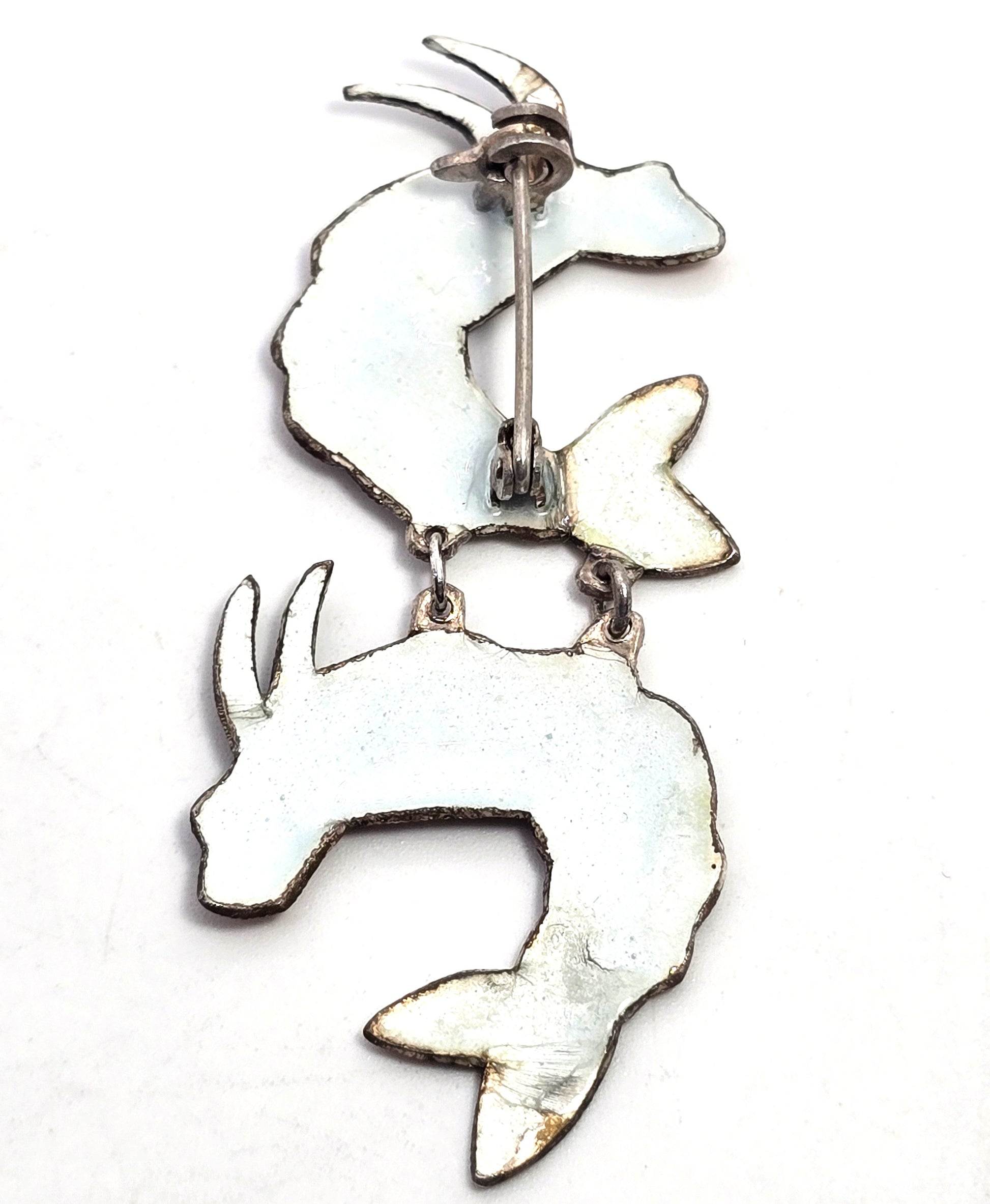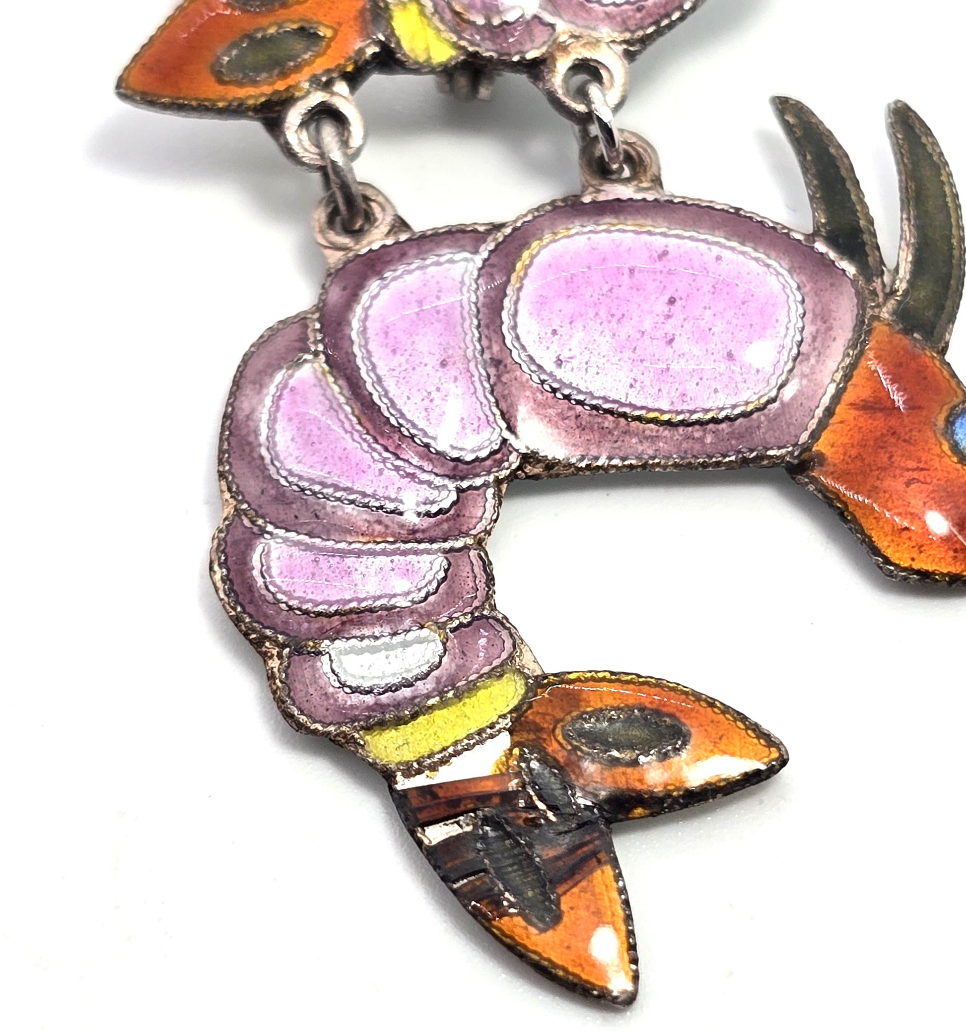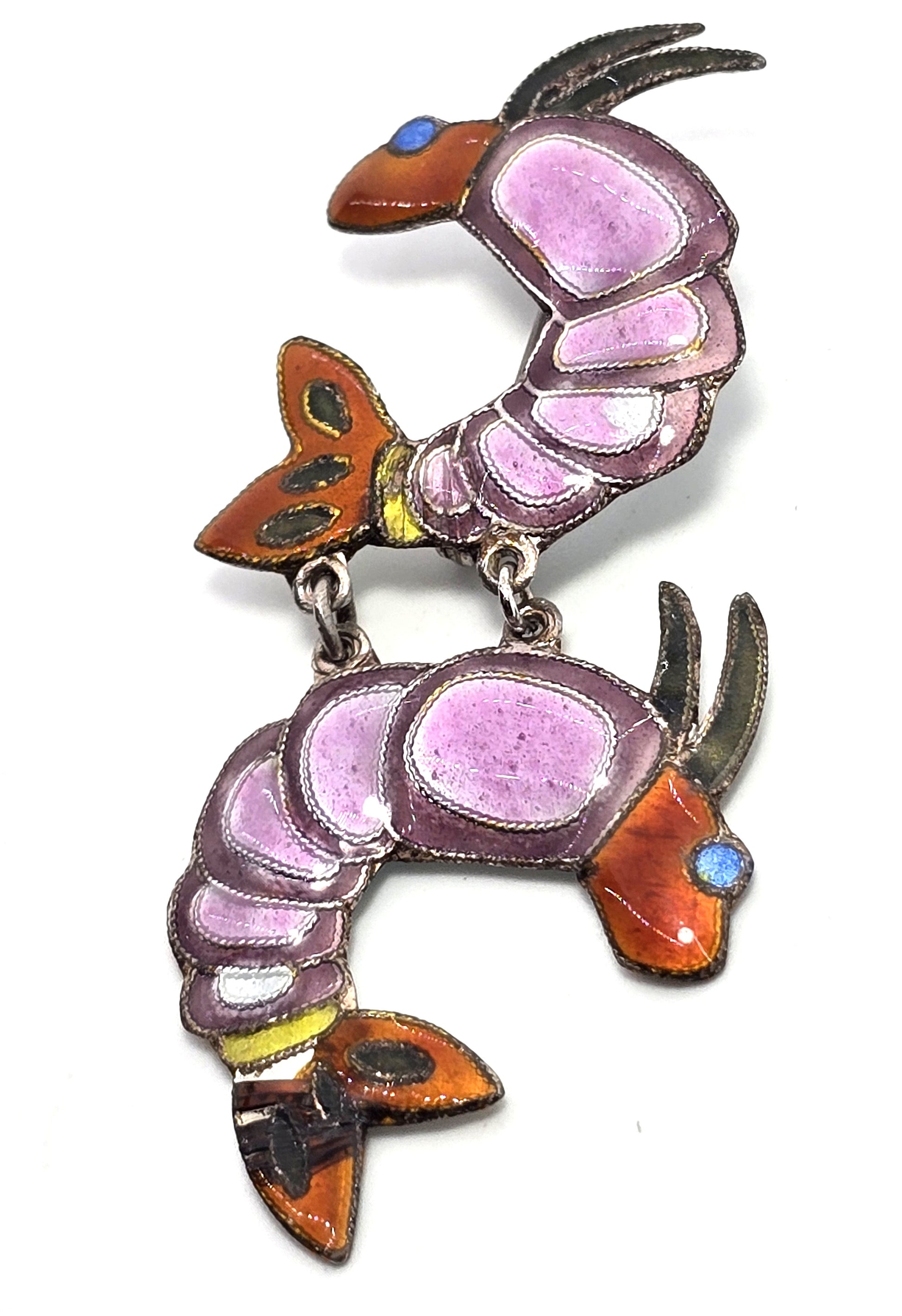 Double pink shrimp articulated whimsical vintage sterling crustacean pin brooch. Good used condition with little signs of normal wear. Great patina present. The enamel has some chipping around the bottom tail as seen in pictures.