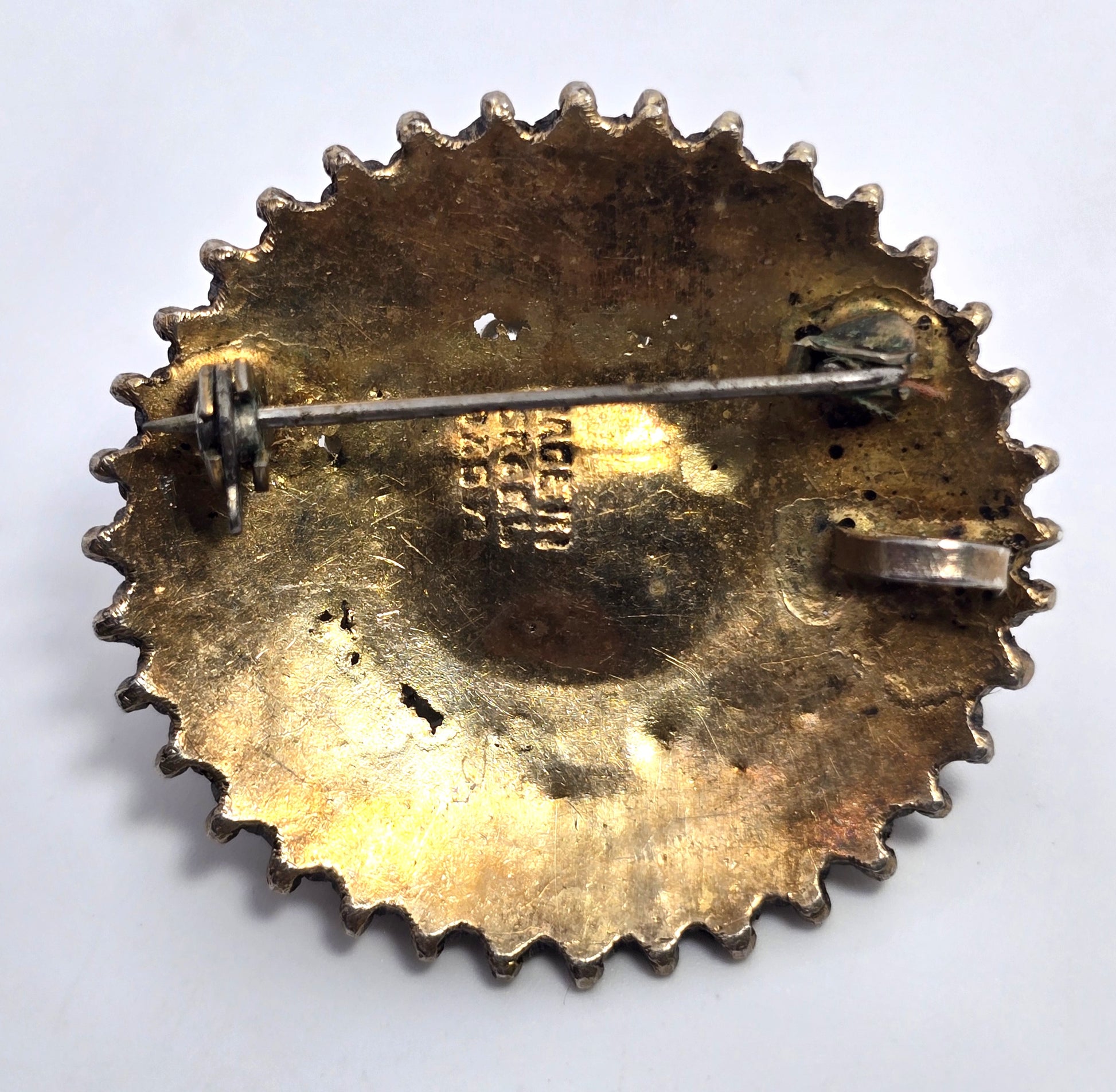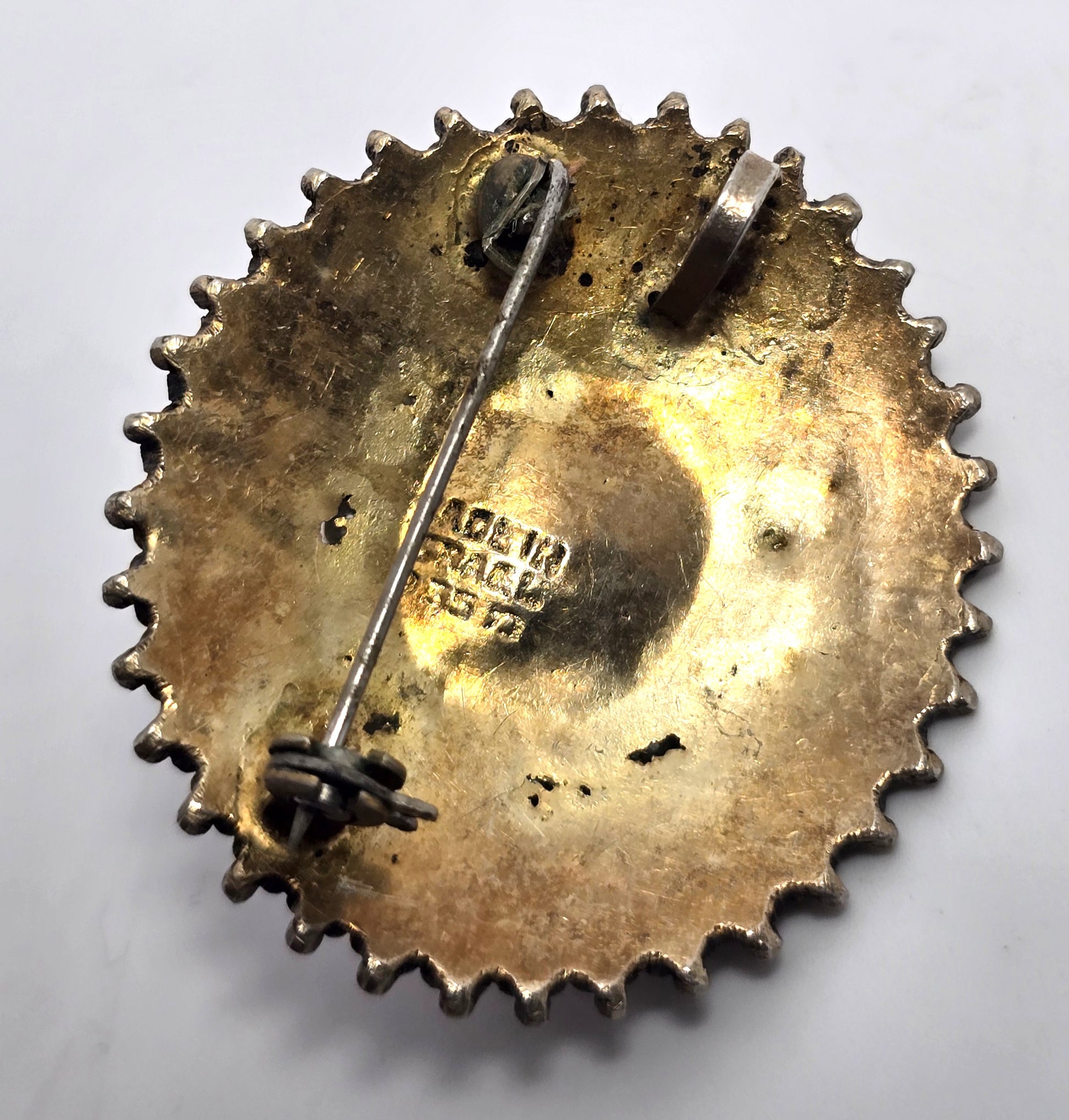 Eilat Stone white pearl Israel vintage vermeil gold over sterling silver brooch. Beautiful large sterling silver filigree setting with gold over sterling silver. The Eilat stone is raised with a halo of small white pearls. Stamped on the back Made in Israel 925 and a hallmark on the back.