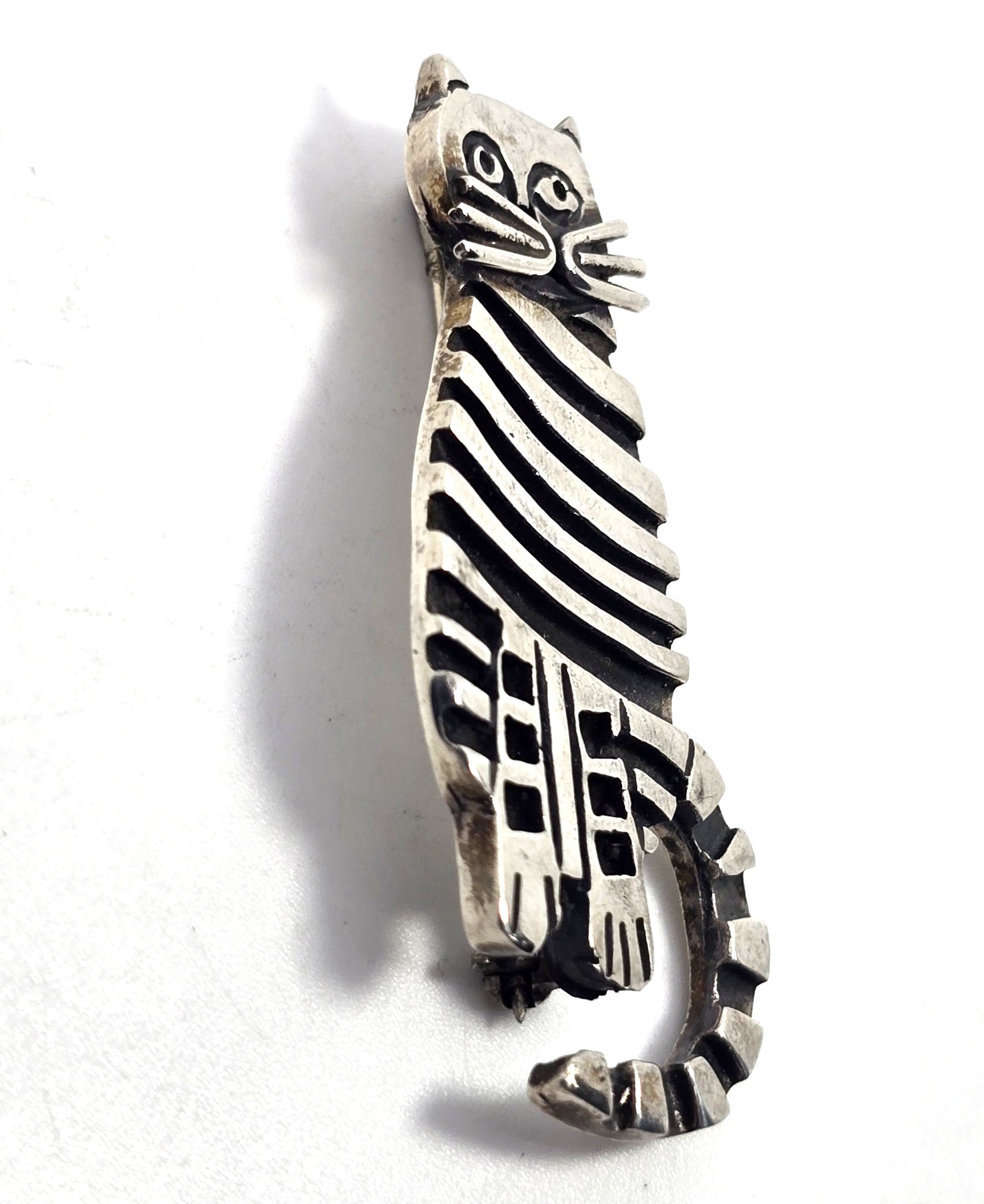 Stripped Kitty Cat sitting kitten vintage sterling silver feline brooch