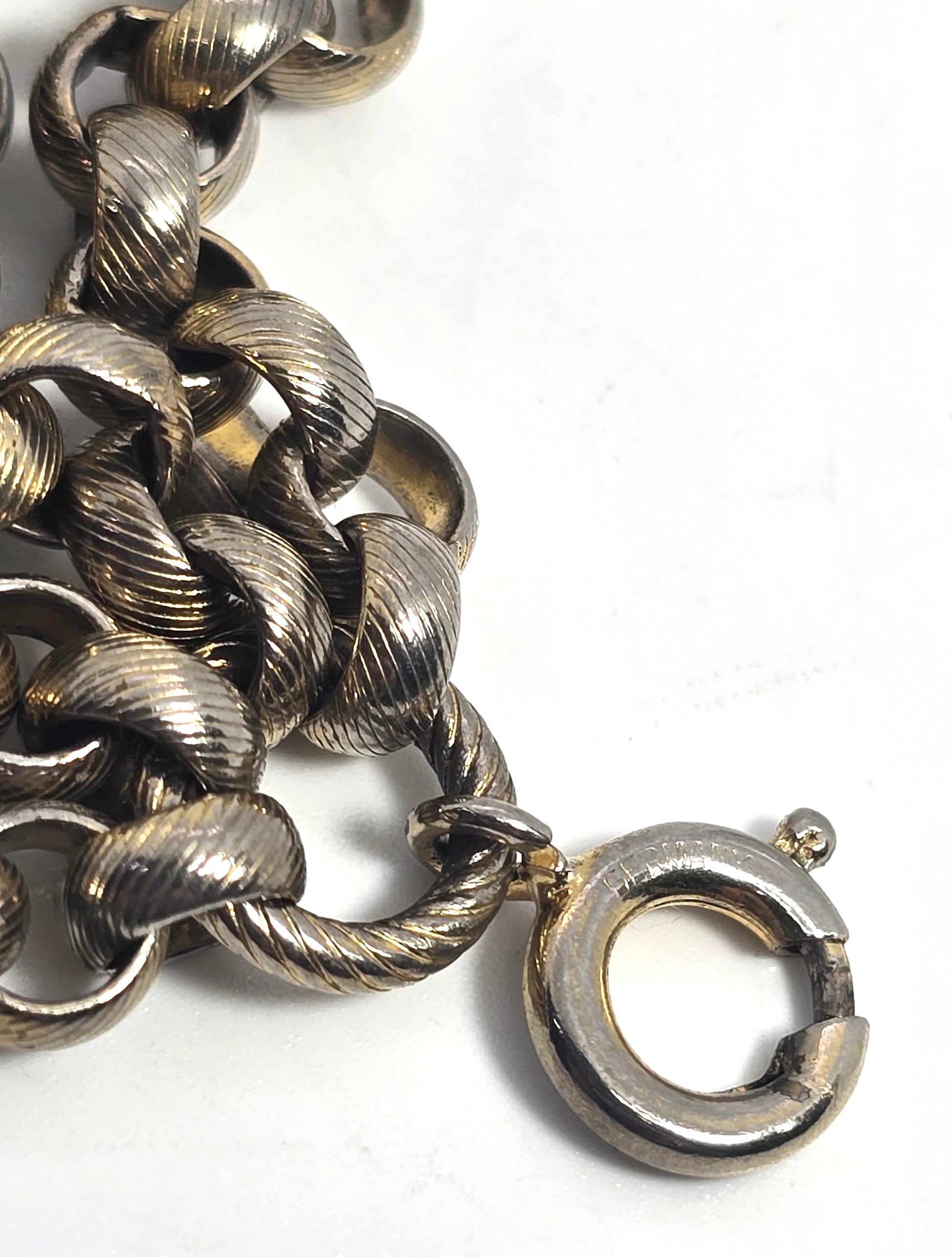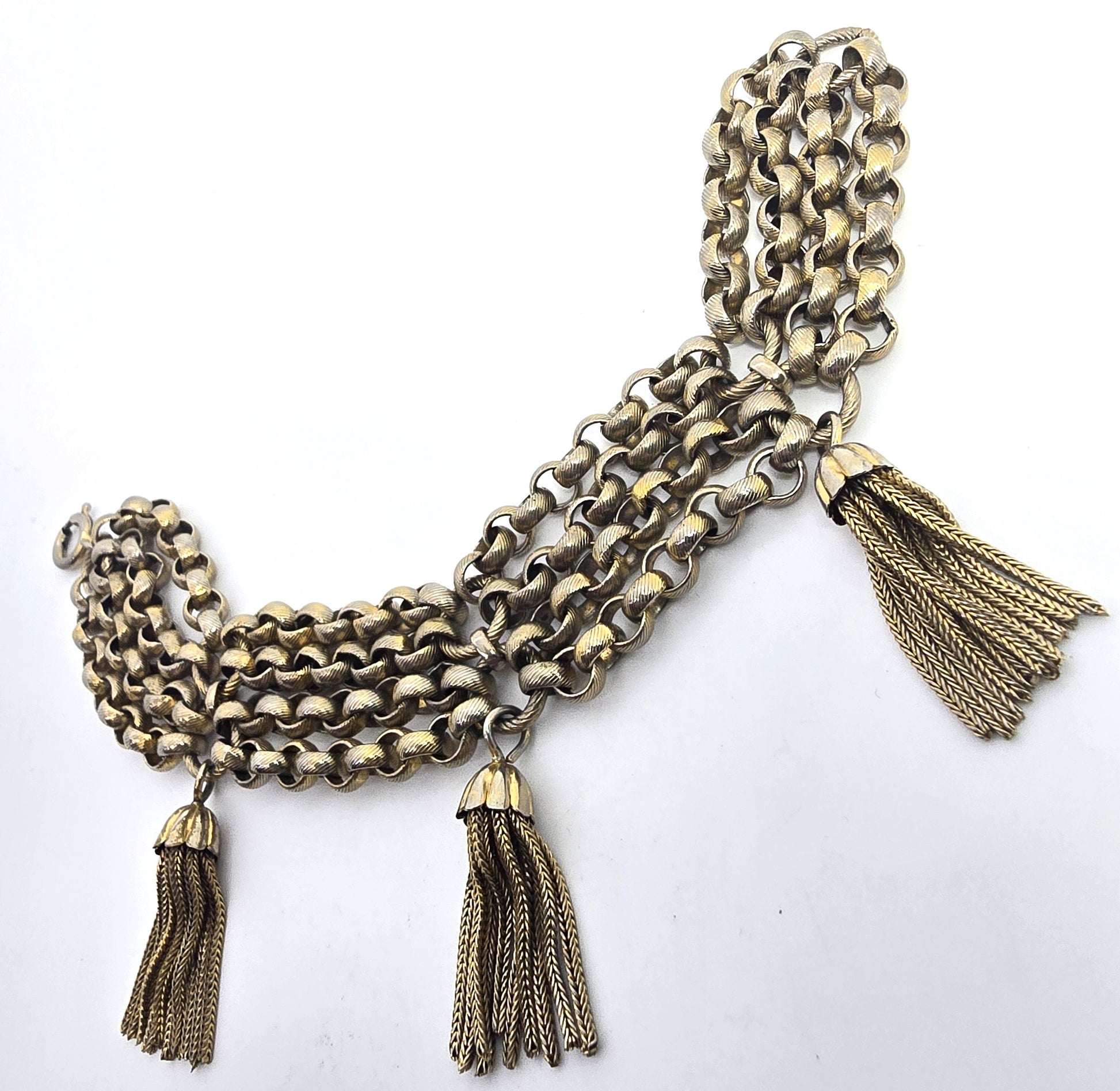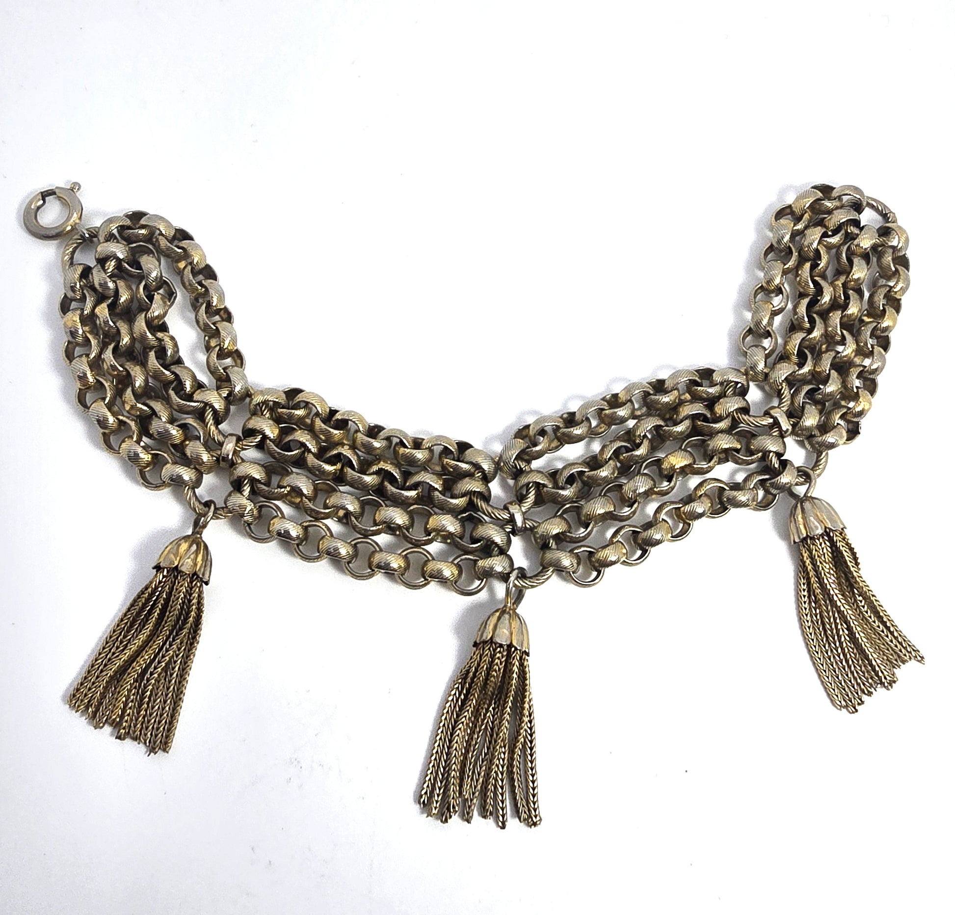 Germany Gold toned link vintage three tassel chain bracelet. Good used condition with little signs of normal wear. The inks of the chain are unique with and etched design. There are three breaks in the pattern where there are larger links and three tassels with foxtail chains. The clasp is spring ring stamped Germany.