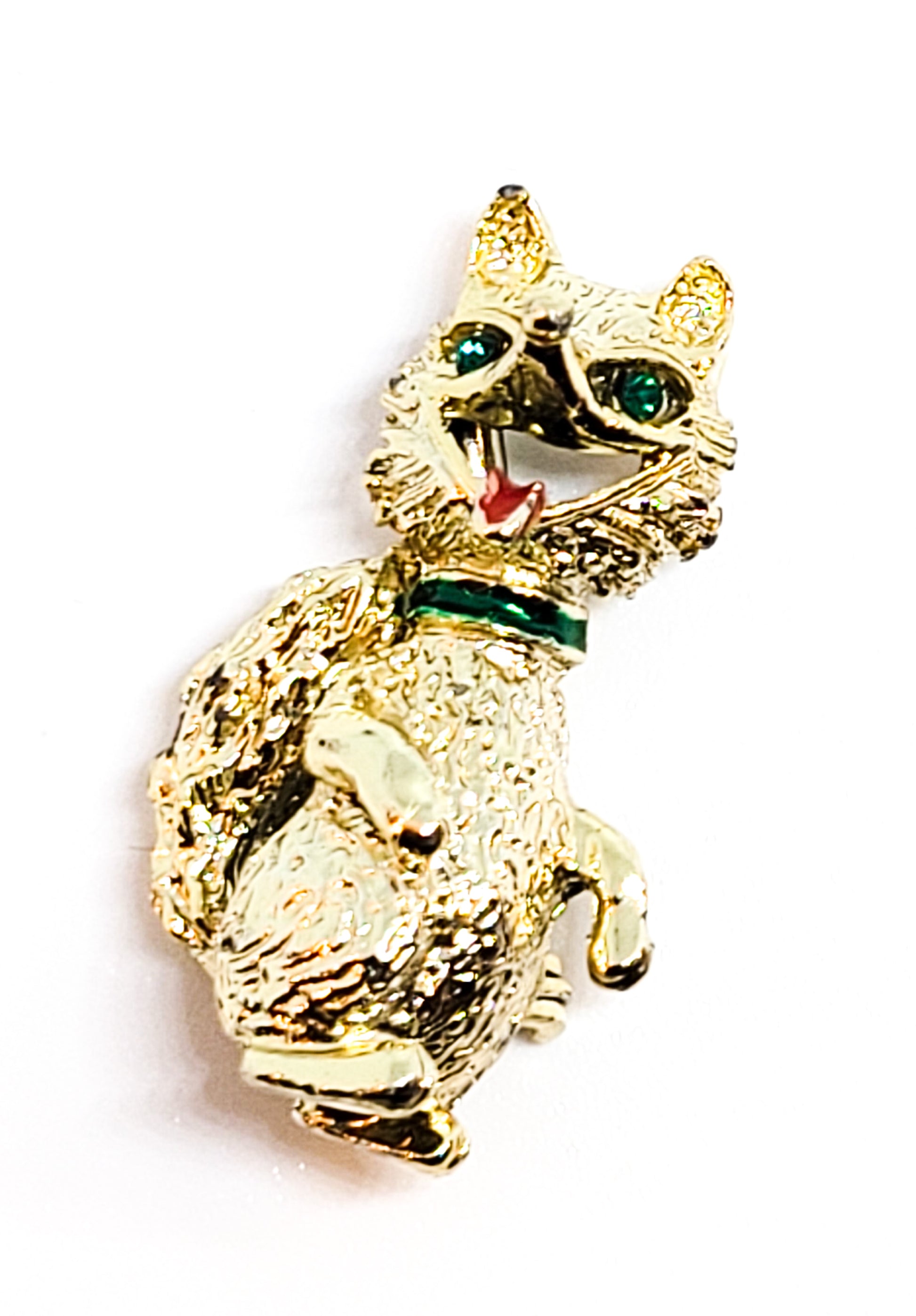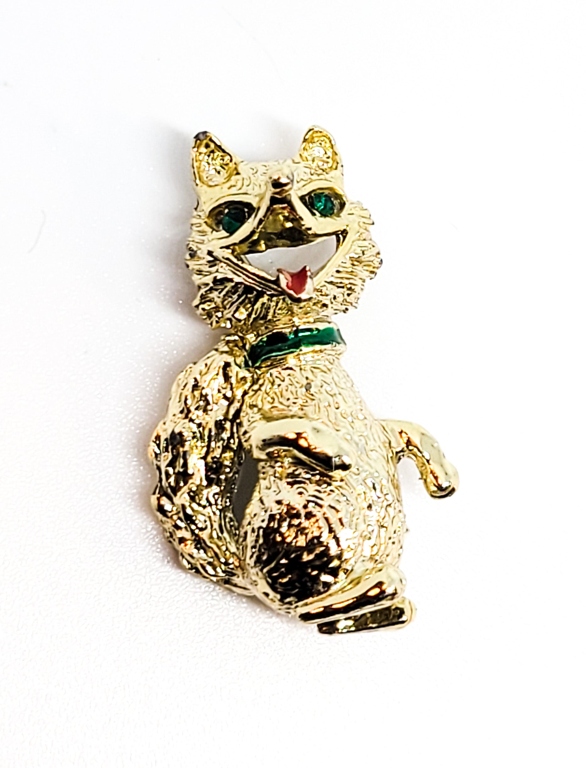 Gerry's signed vintage baby fox brooch with green rhinestone eyes figural pin. This sassy little baby fox is super cute and fun with his happy face and red tongue. He has a green enamel color and green rhinestone eyes. Good vintage condition with little signs of normal vintage wear.