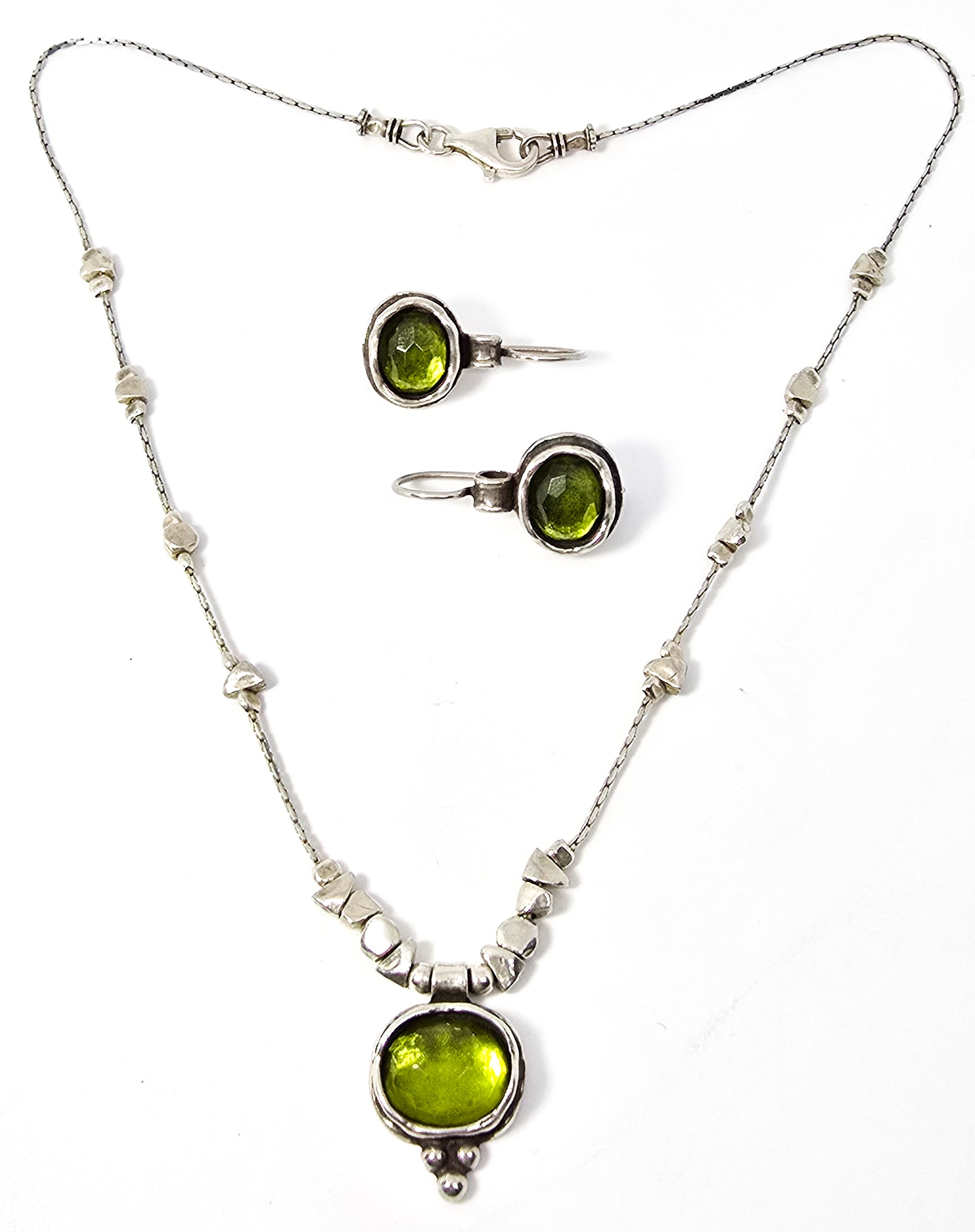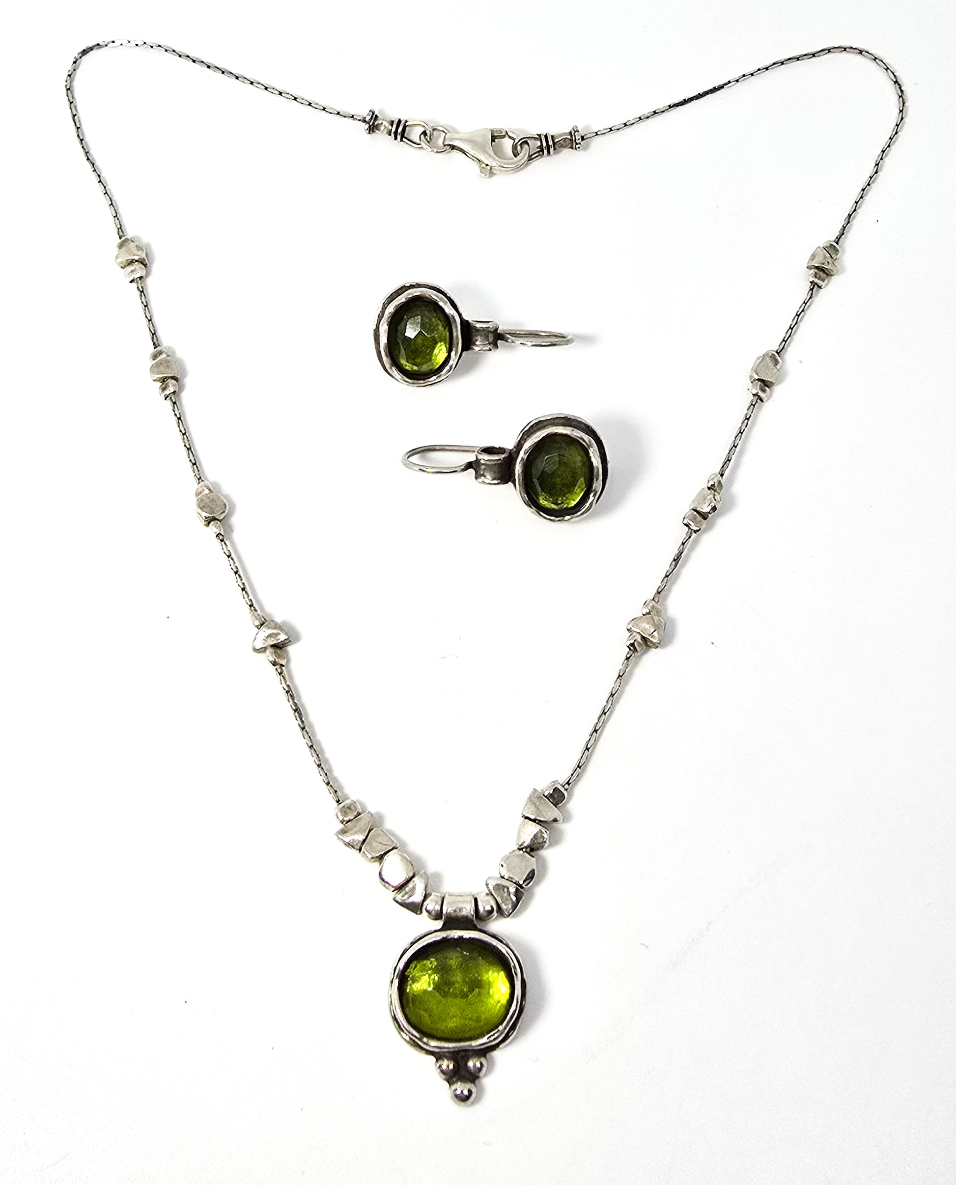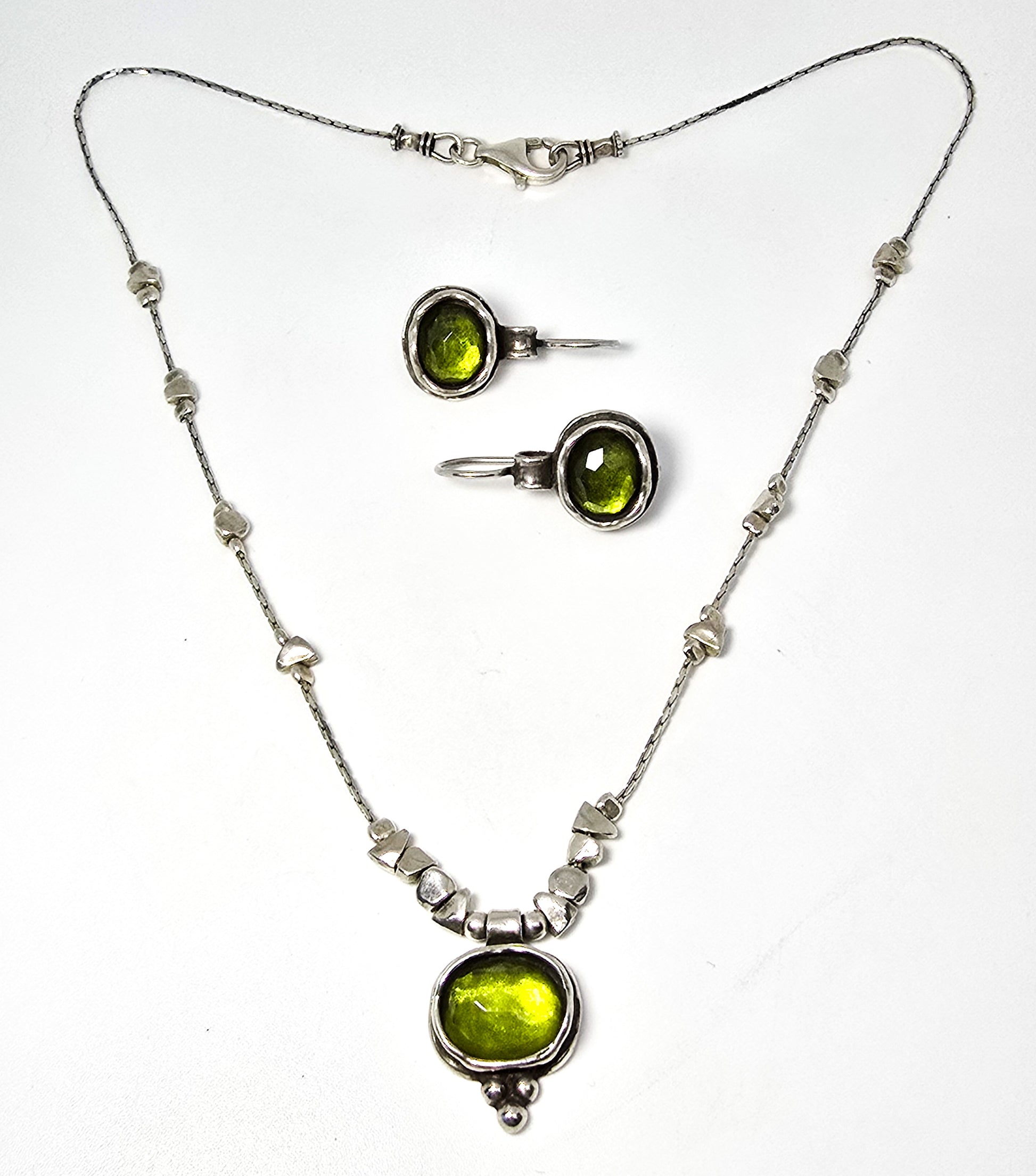 Silpada Green Hammered Sterling Silver Earrings and necklace set. Good used condition with small signs of normal wear. Great patina present. Set comes with matching necklace and earrings. Earrings are stamped 925 with the Silpada hallmark. Necklace has same stamps behind the pendant. Faceted green stones are glass with a beautiful peridot color.