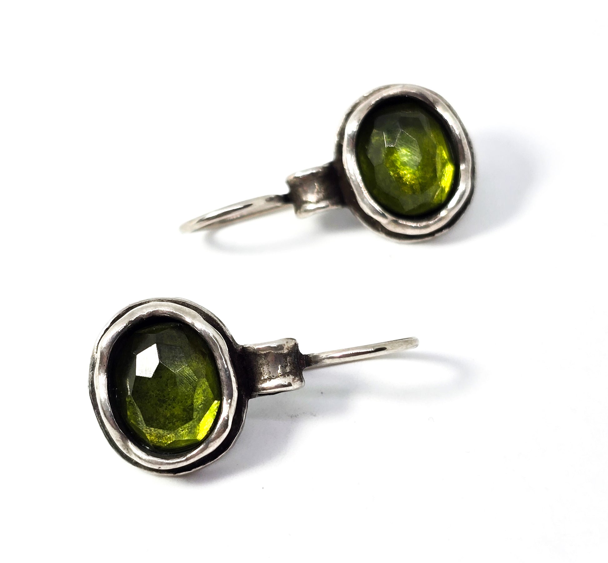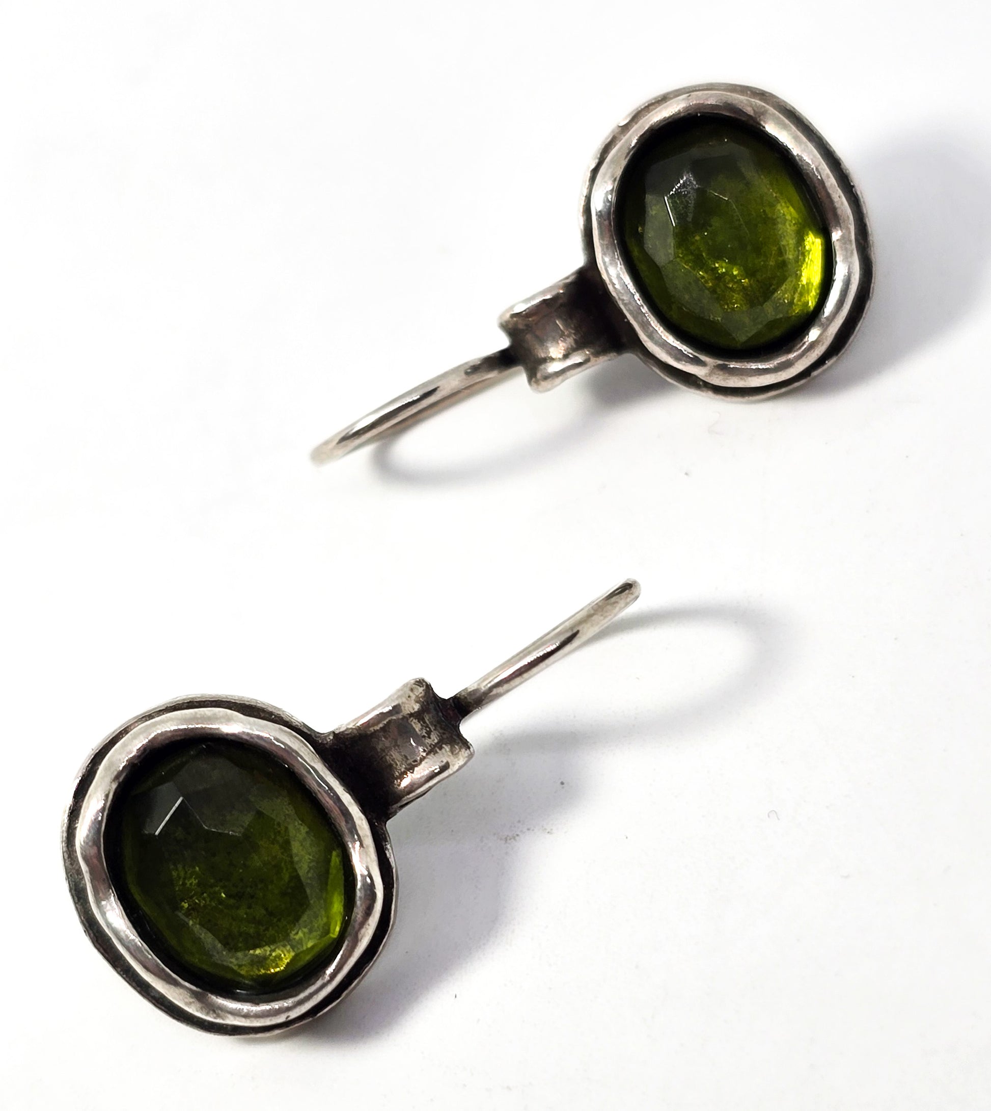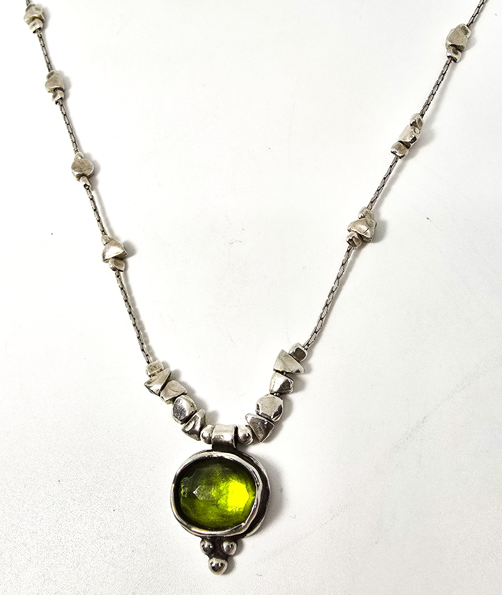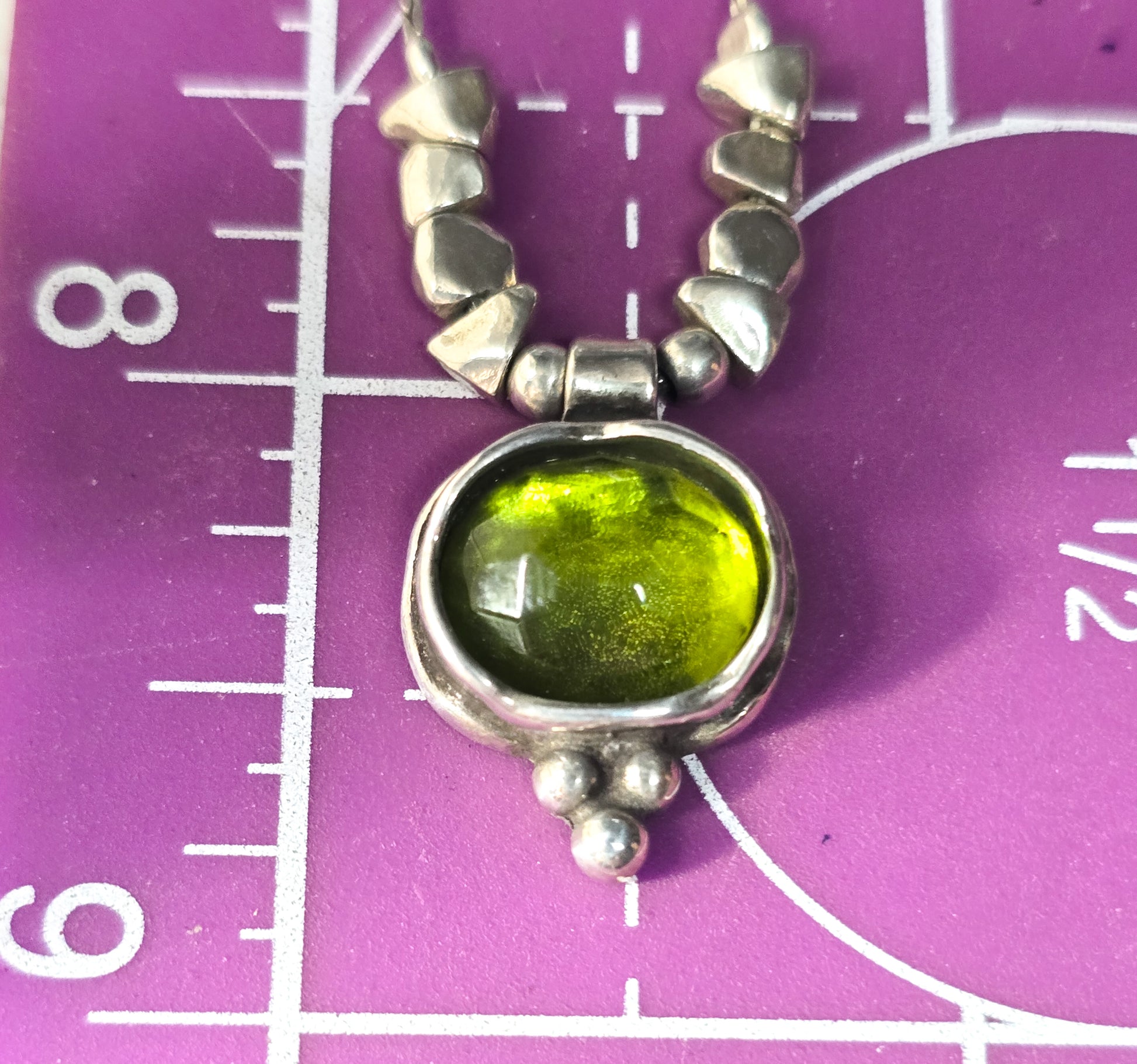 Silpada Green Hammered Sterling Silver Earrings and necklace set. Good used condition with small signs of normal wear. Great patina present. Set comes with matching necklace and earrings. Earrings are stamped 925 with the Silpada hallmark. Necklace has same stamps behind the pendant. Faceted green stones are glass with a beautiful peridot color.
