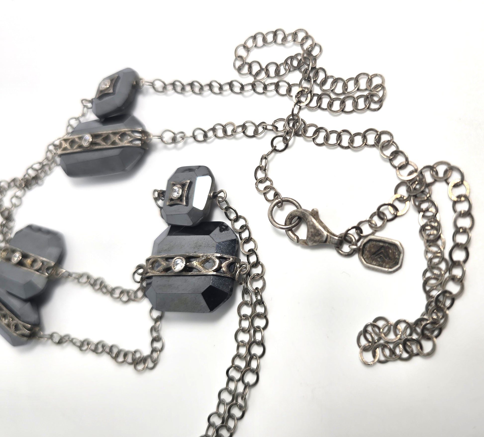 Silpada Sterling Silver Hematite Cubic Zirconia Vision 40” Necklace N2924 Retired. Good used condition with small signs of normal wear. Great patina present. Long sterling silver links with custom sterling accents on the large faceted hematite beads. The beads have small CZ accent stones. Silpada Vision Necklace reference number N2924. Stamped on the lobster clasp 925. Silpada hallmark has hangtag next to clasp.