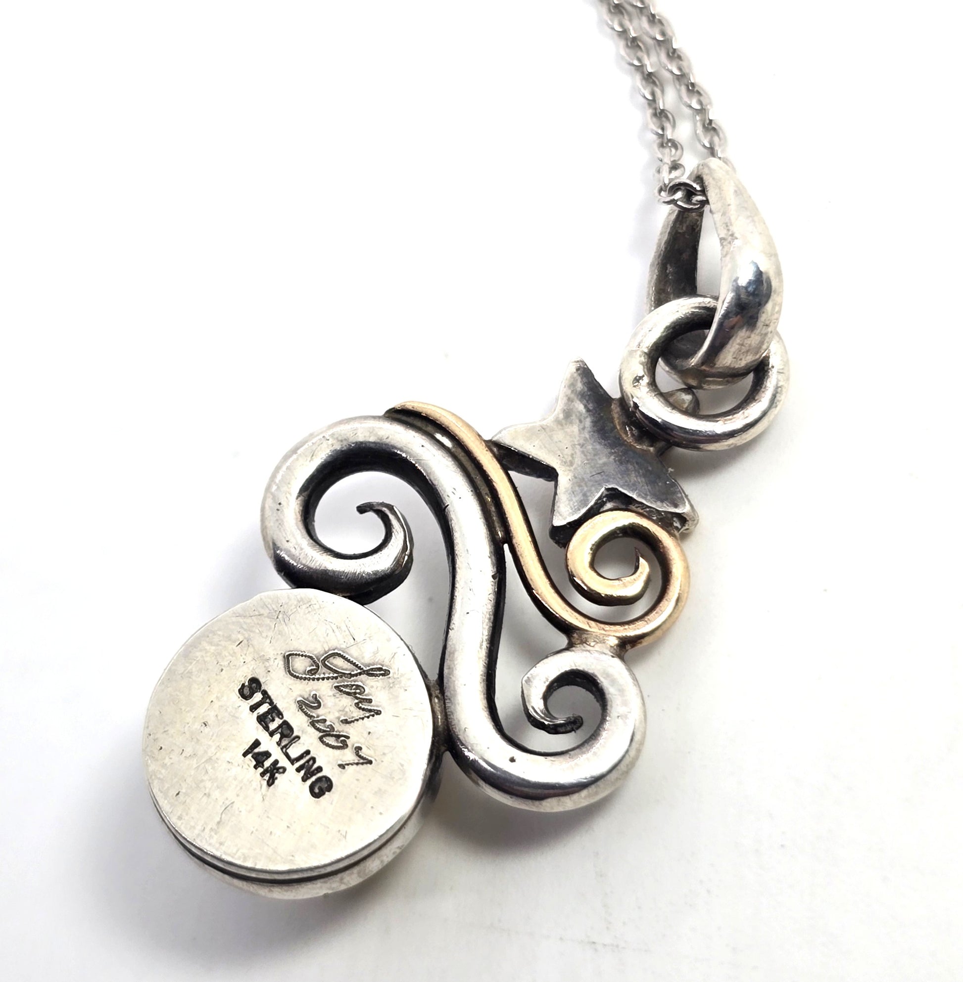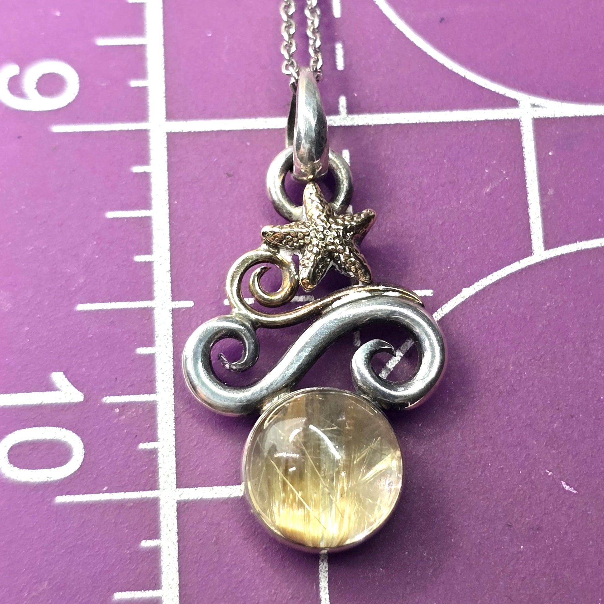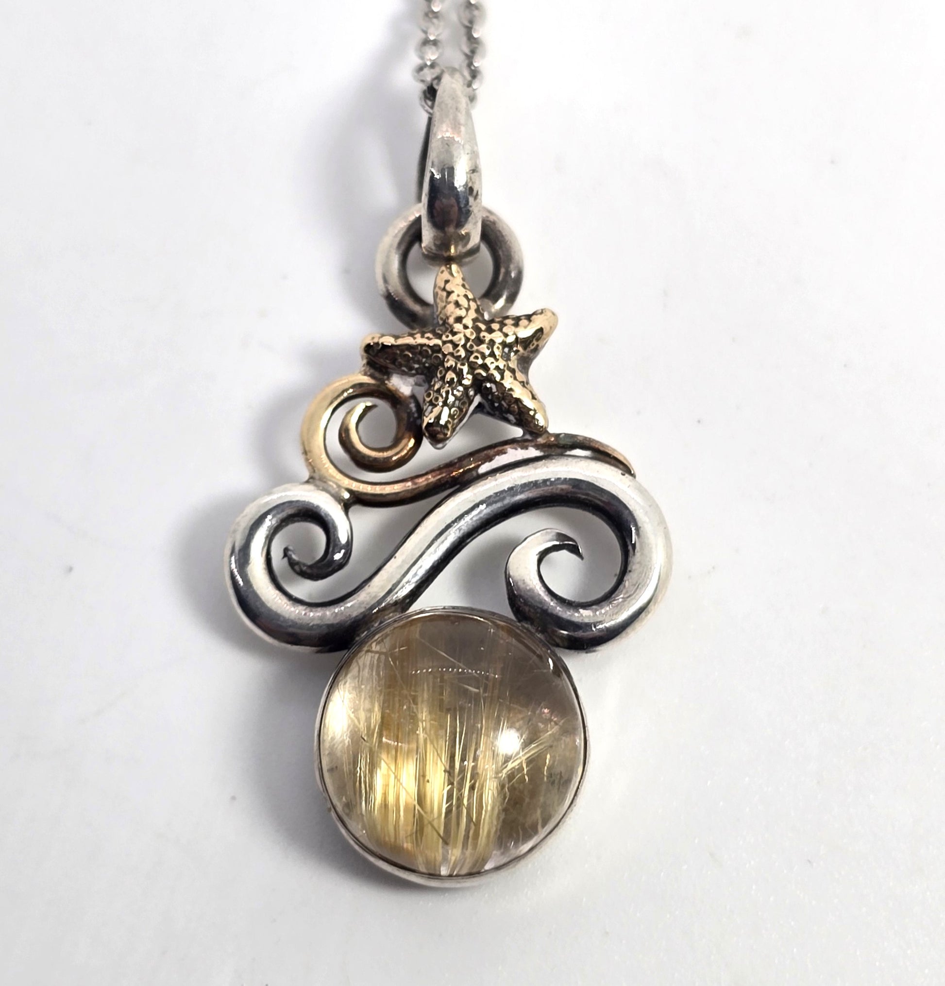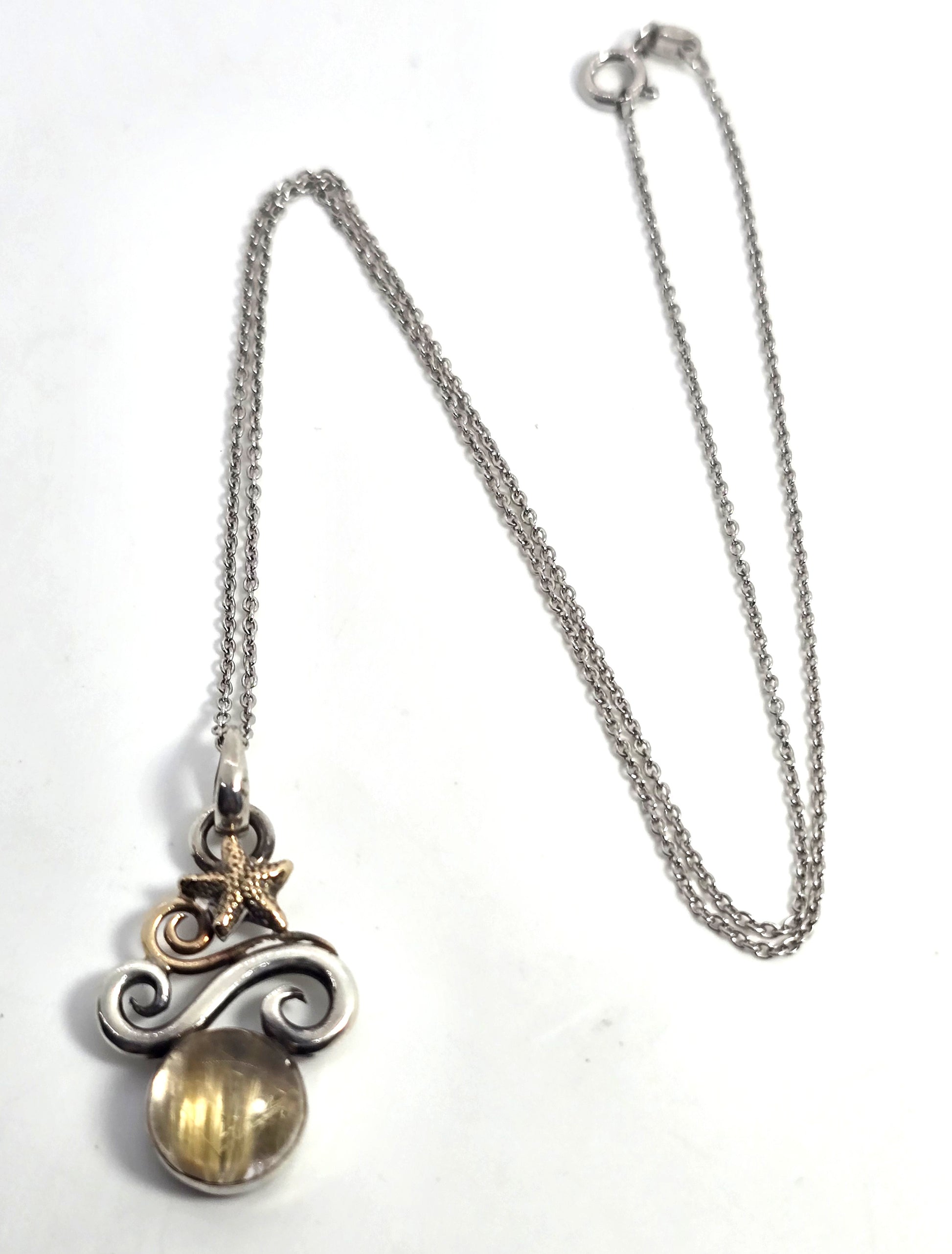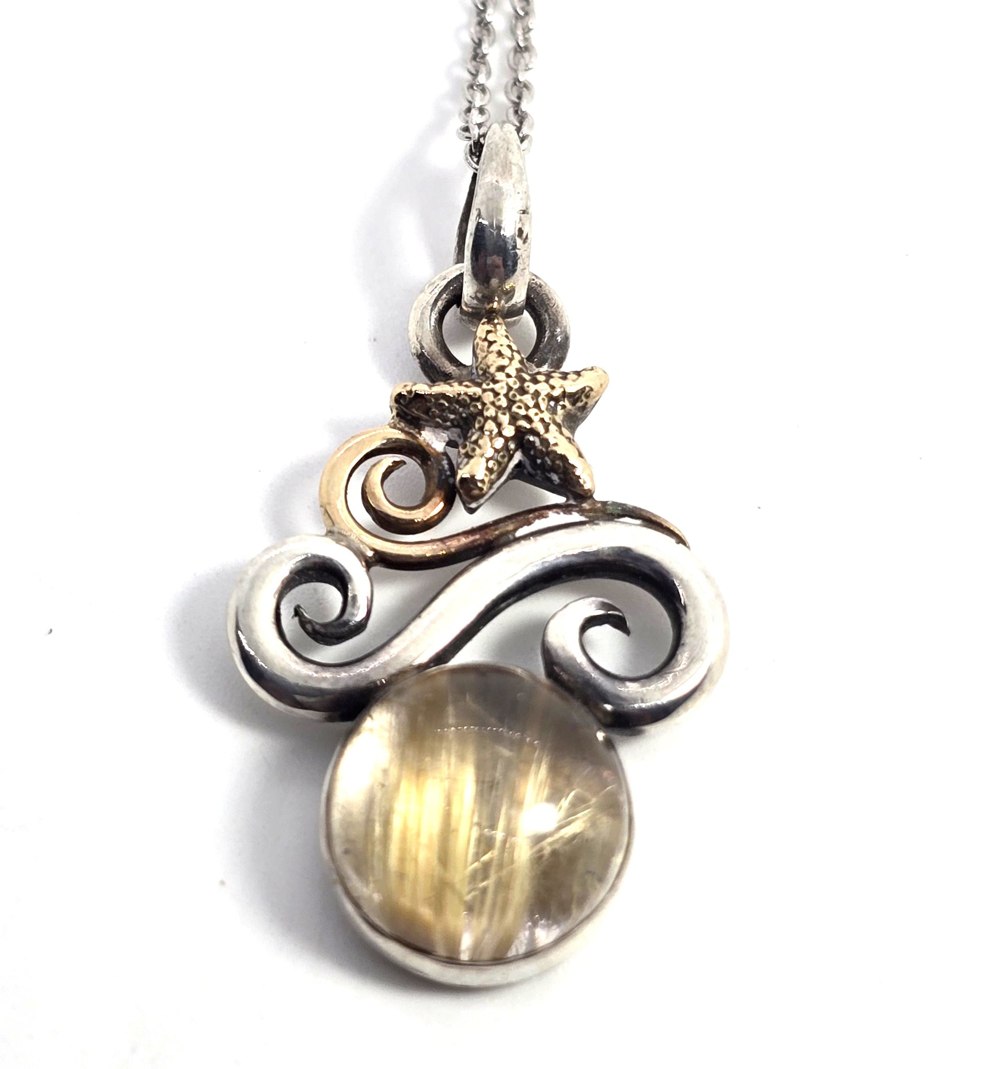 Golden Rutilated Quartz Jewelry of Joy 14k gold sterling silver beach comber necklace. Good used condition with little to no signs of normal wear. Beautiful sterling silver base with 14k gold accents and stunning rutile quartz. Stamped on the back Joy 2007 925 14k. Comes with sterling silver chain. Artist is known for combining silver and gold with beautiful gemstones.
