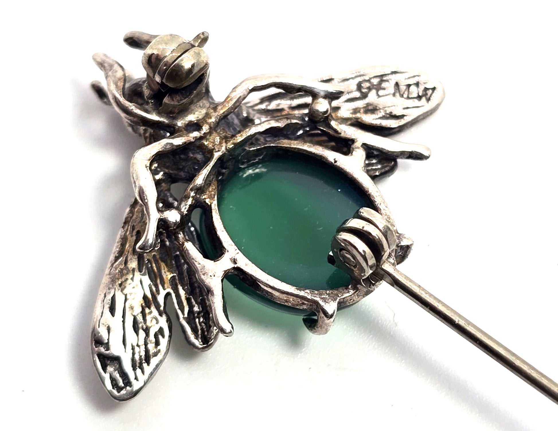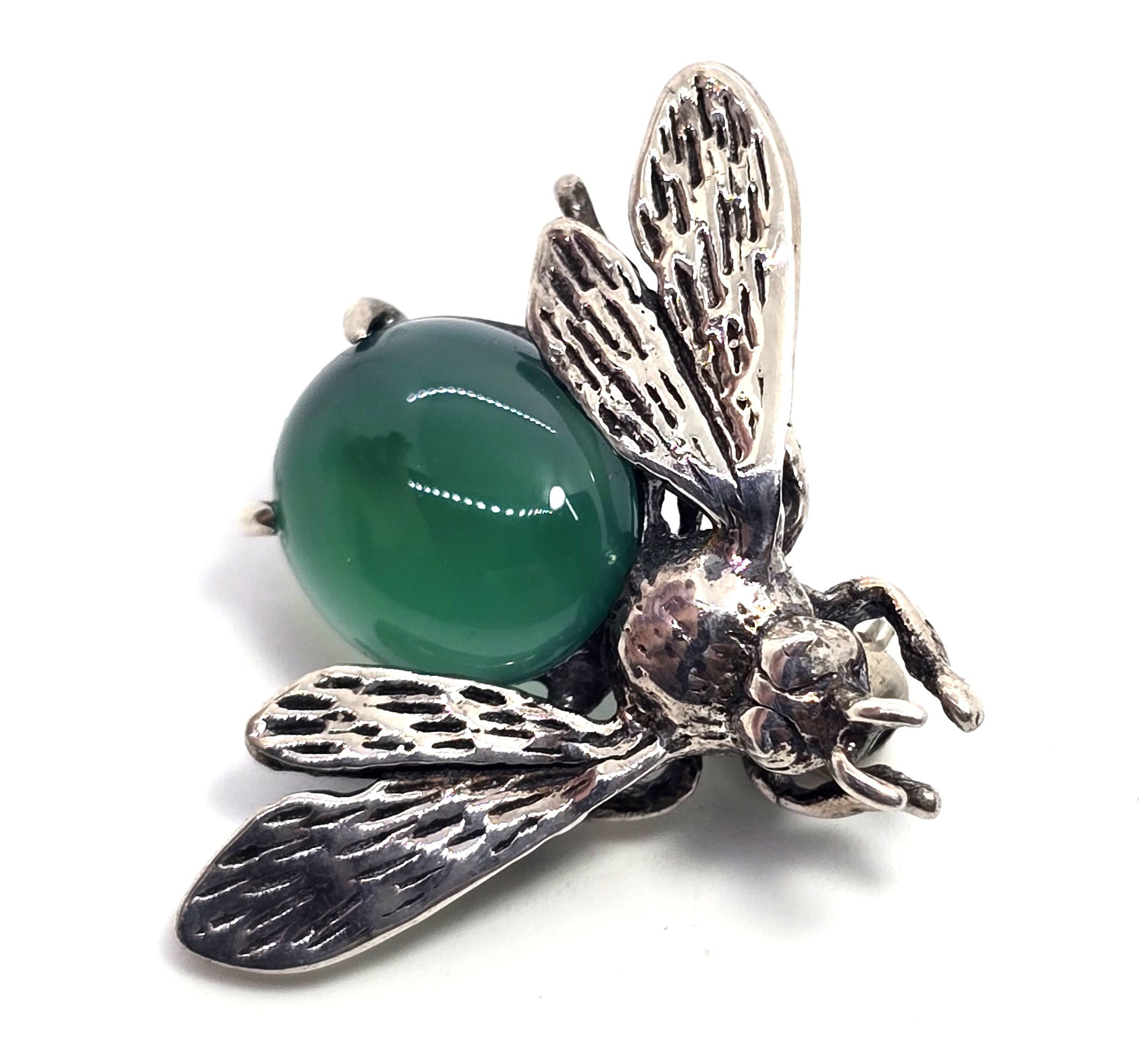 Green Chalcedony flying insect vintage sterling silver lapel brooch