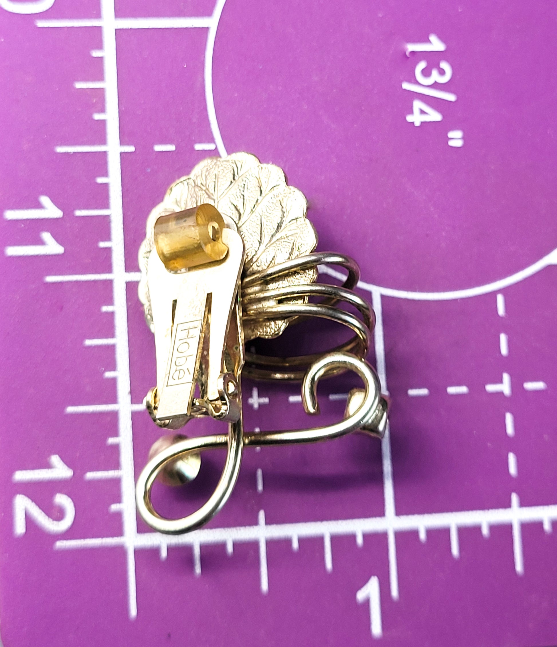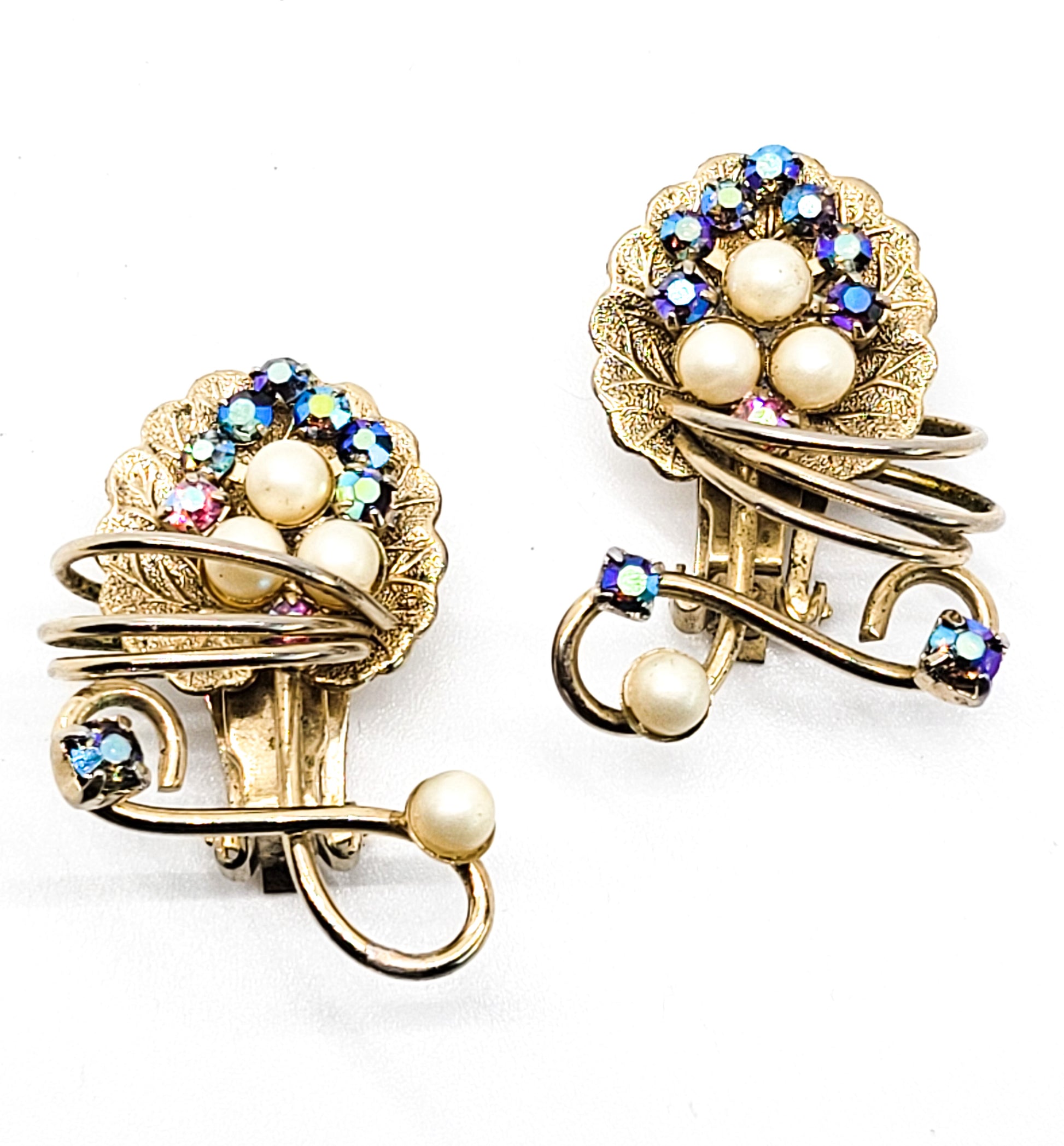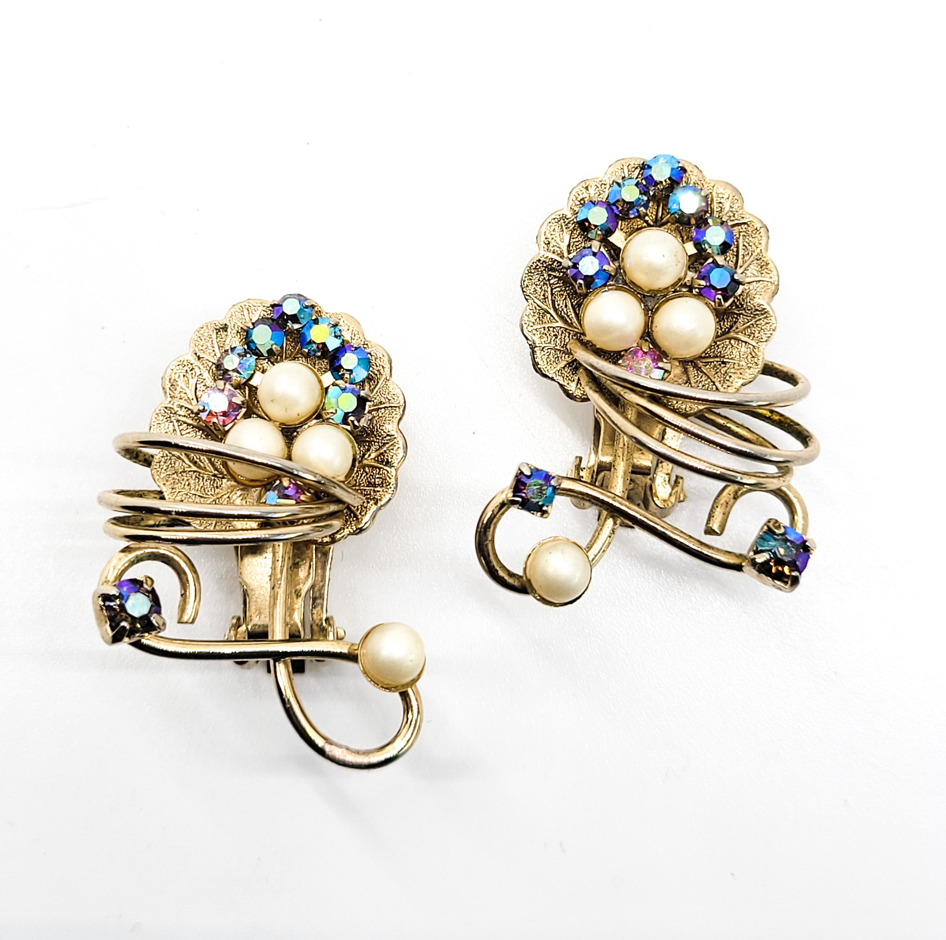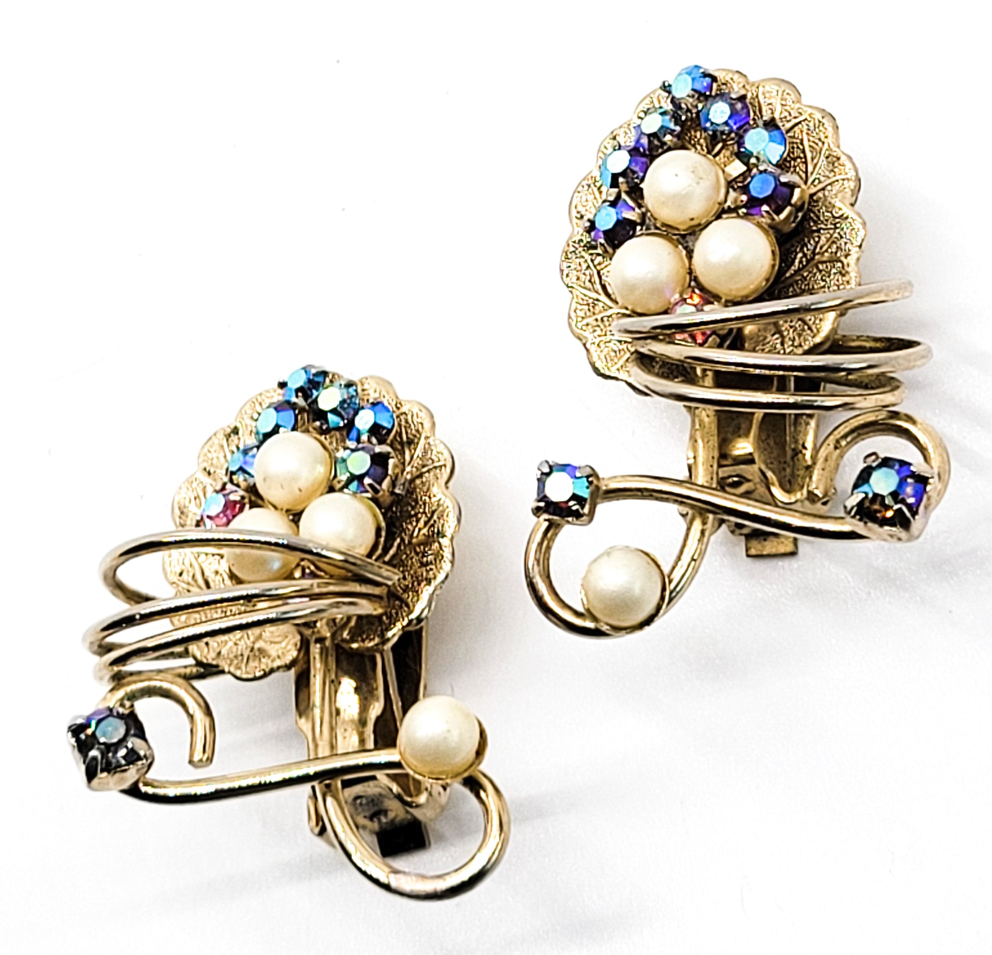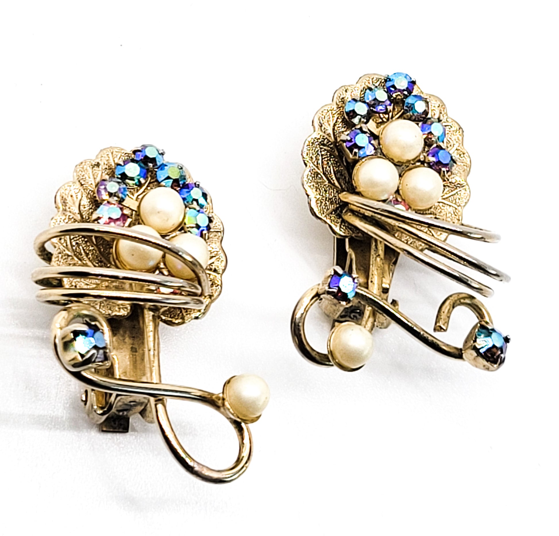 Hobe signed Aura Borealis faux pearl grape leaf vintage rhinestone clip on earrings
