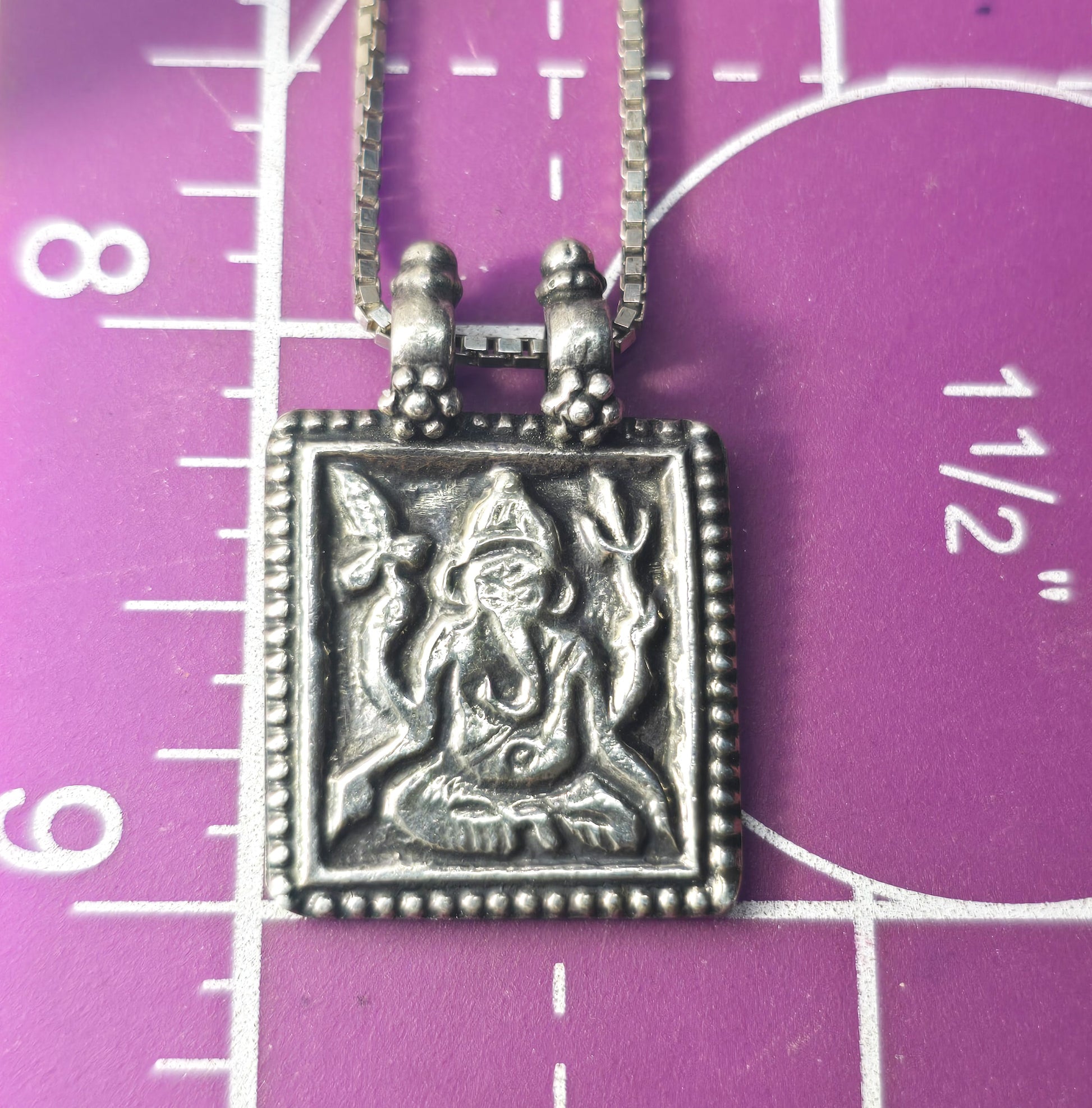 Ganesha Hindu Elephant God Sterling Silver Deity pendant amulet Necklace. Good used condition with little to no signs of normal wear. Stamped on the back of the pendant 925. Comes with sterling silver box chain.