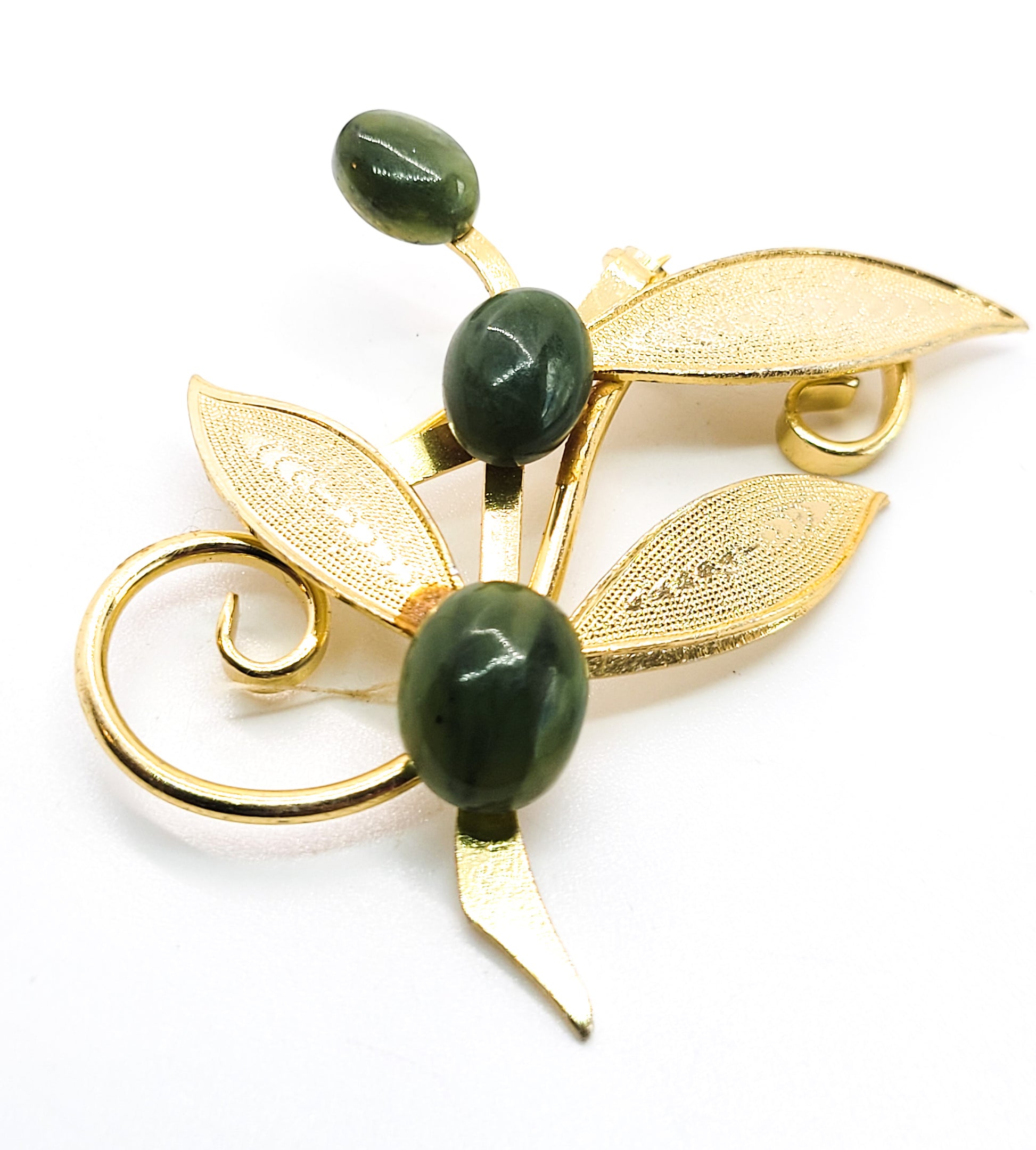 Jade glass vintage gold toned leave mid century brooch. Great vintage condition with little to no signs of normal vintage wear.