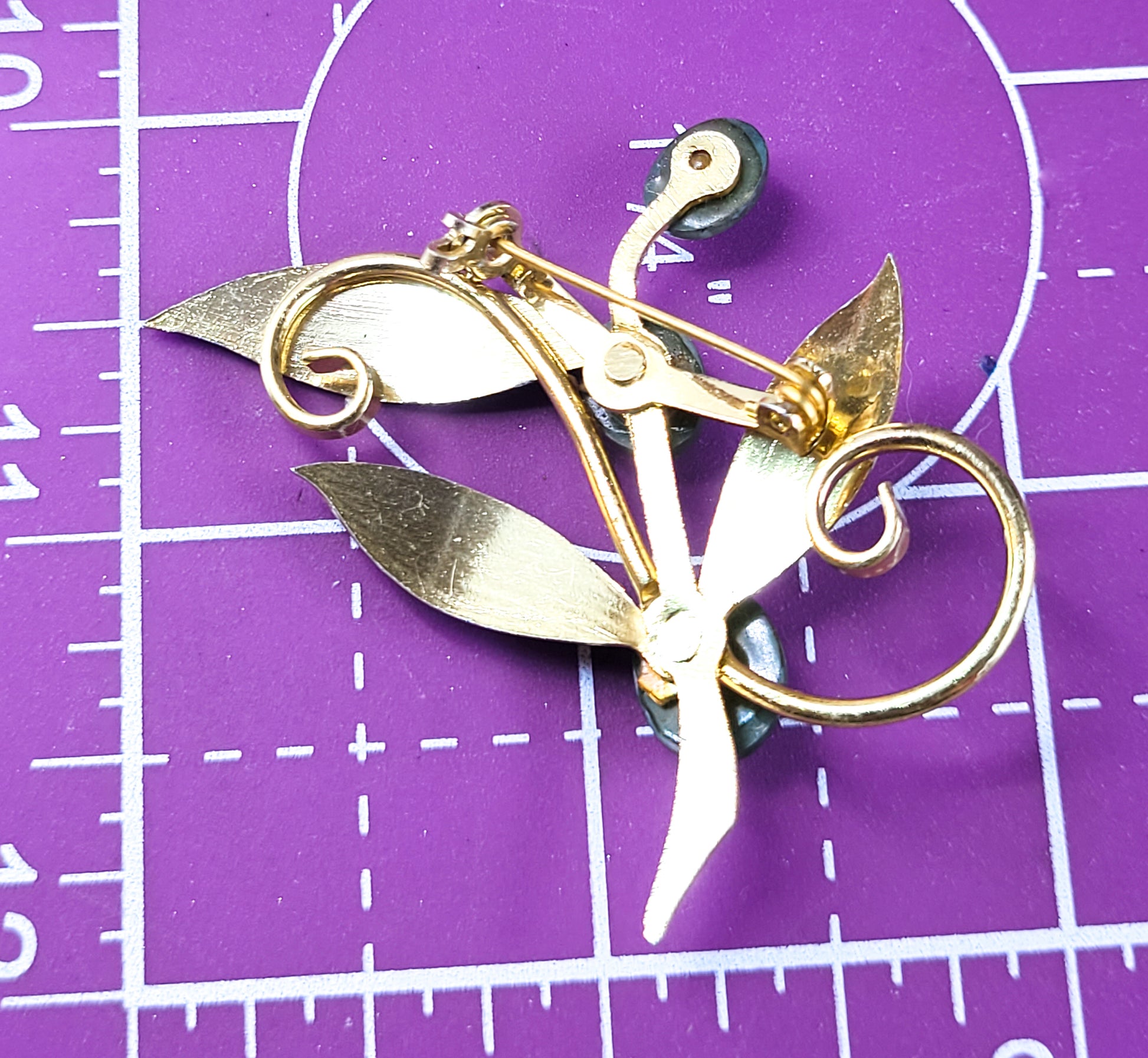 Brooch measures 1 and 7/8ths of an inch tall and 2 inches wide.