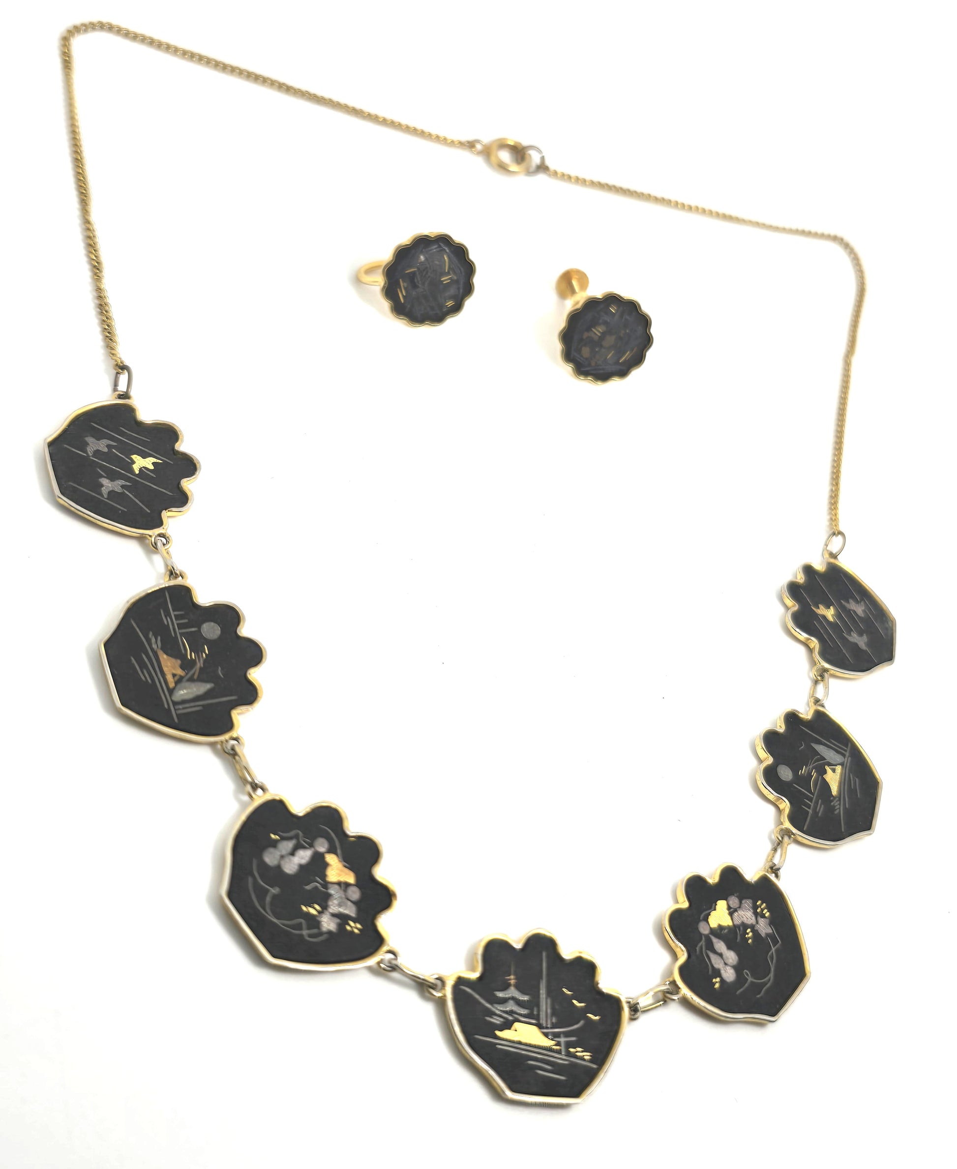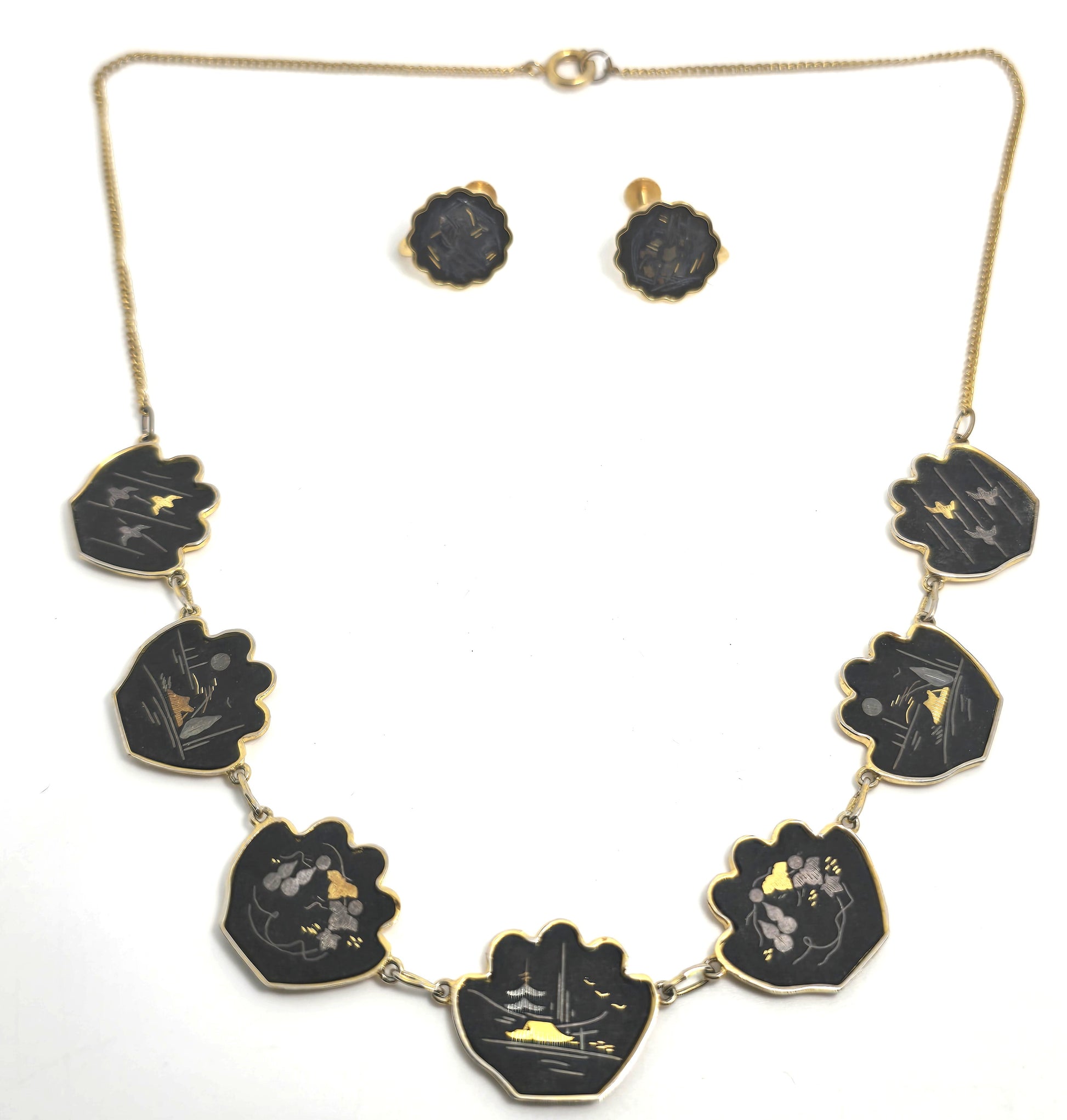Japanese Damascene etched gold filled vintage necklace earrings Amita jewelry set