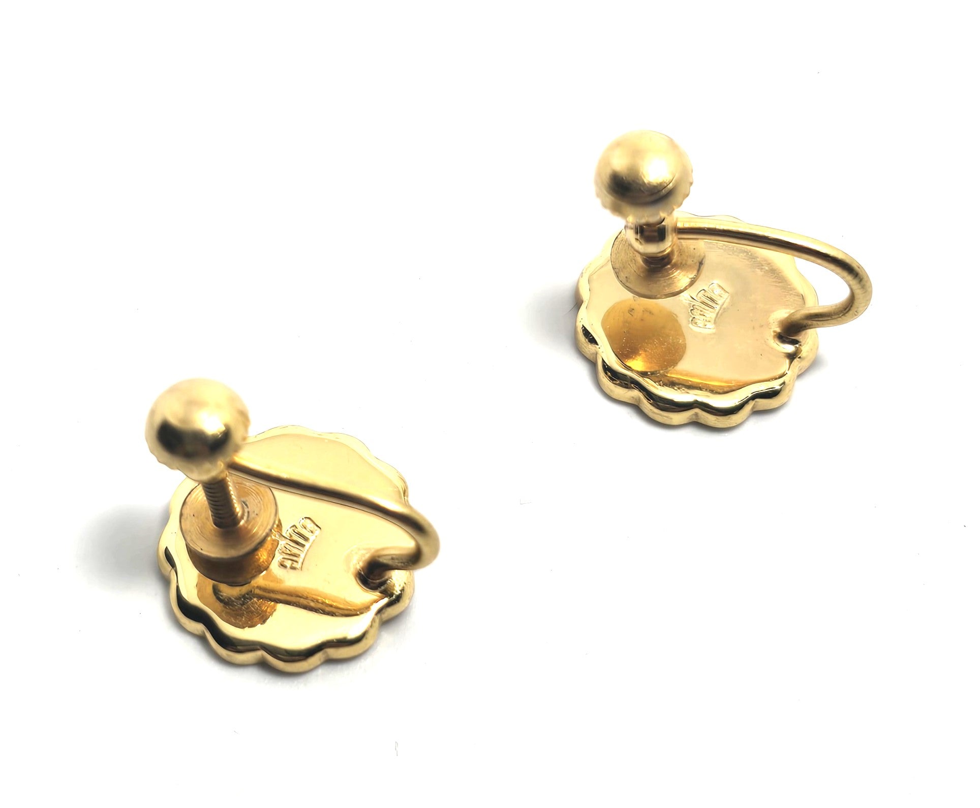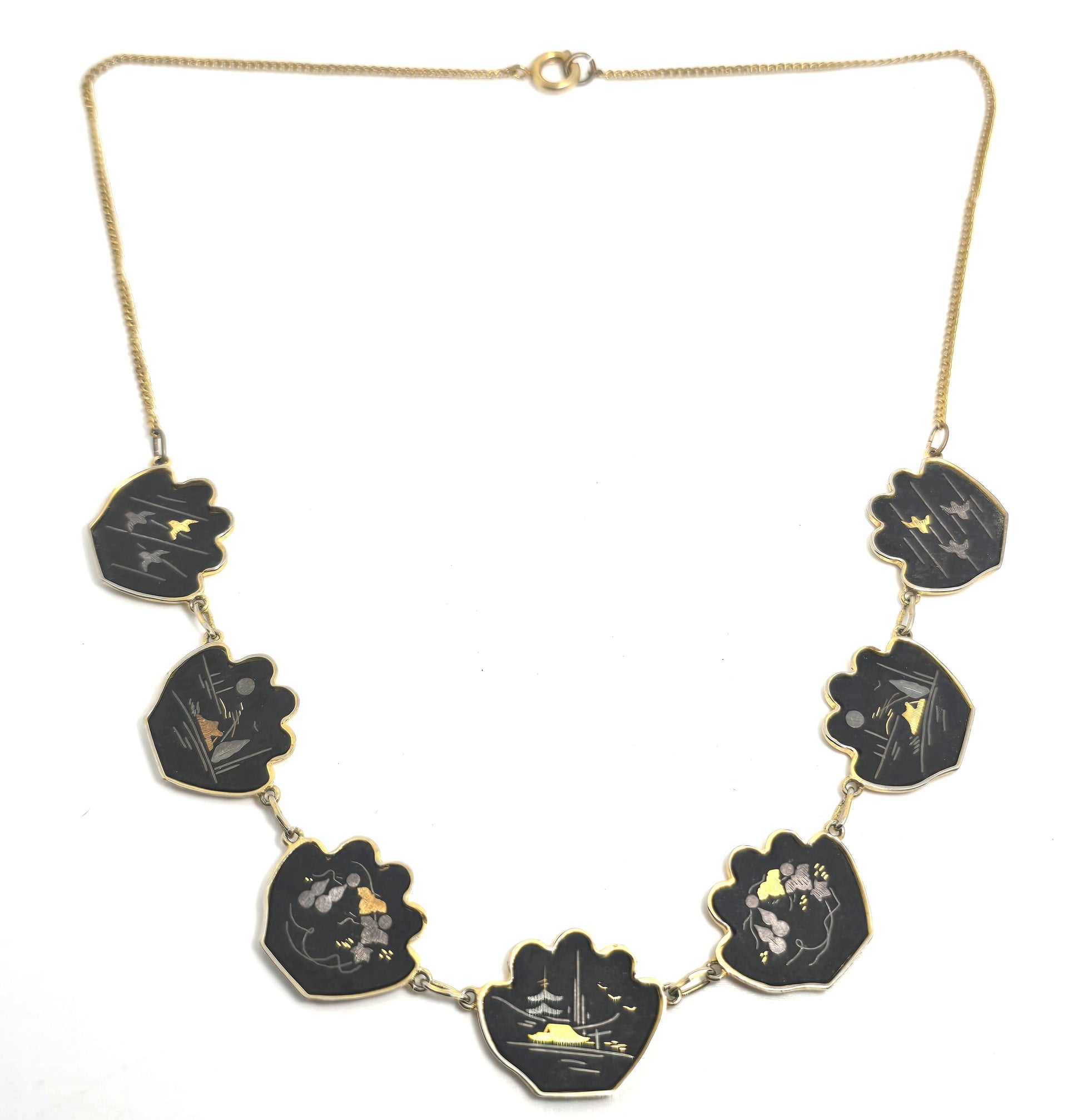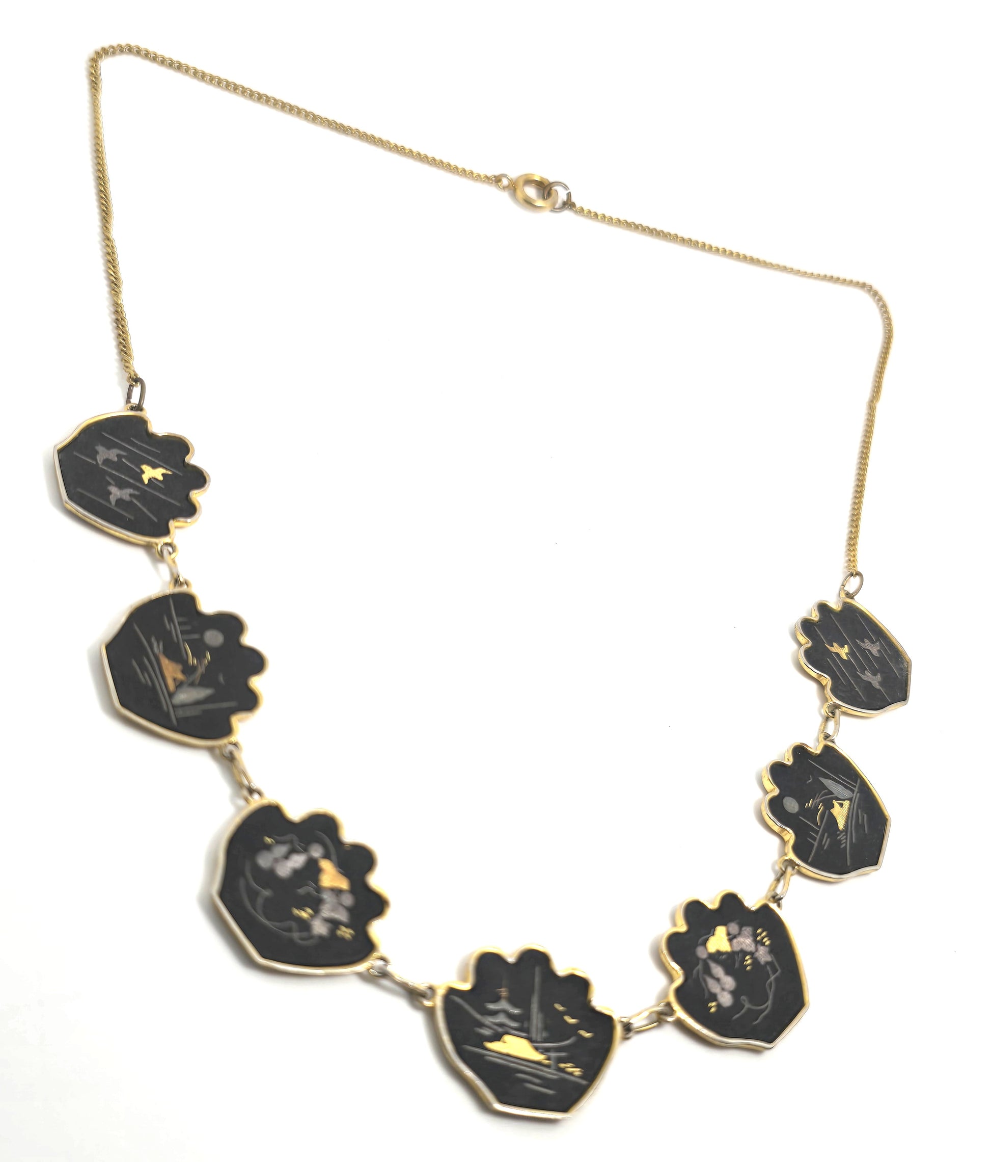 Japanese Damascene etched gold filled vintage necklace earrings Amita jewelry set.. Good vintage condition with little signs of normal vintage wear. Japanese damascene is unique in white there is a matte black base with 14k gold and sterling silver designs. Back of the earrings are stamped Amita . Earrings have screw back fastening.
