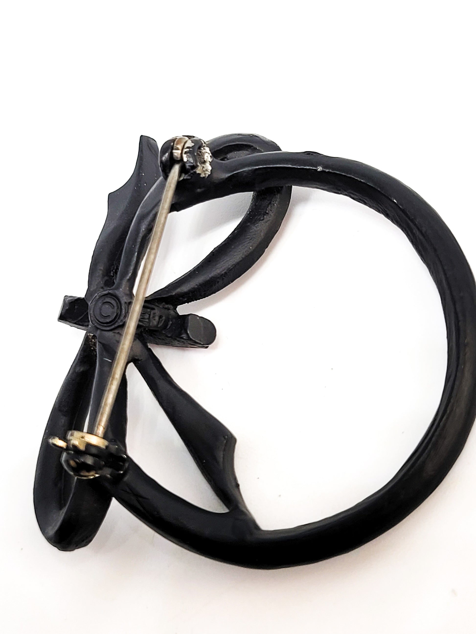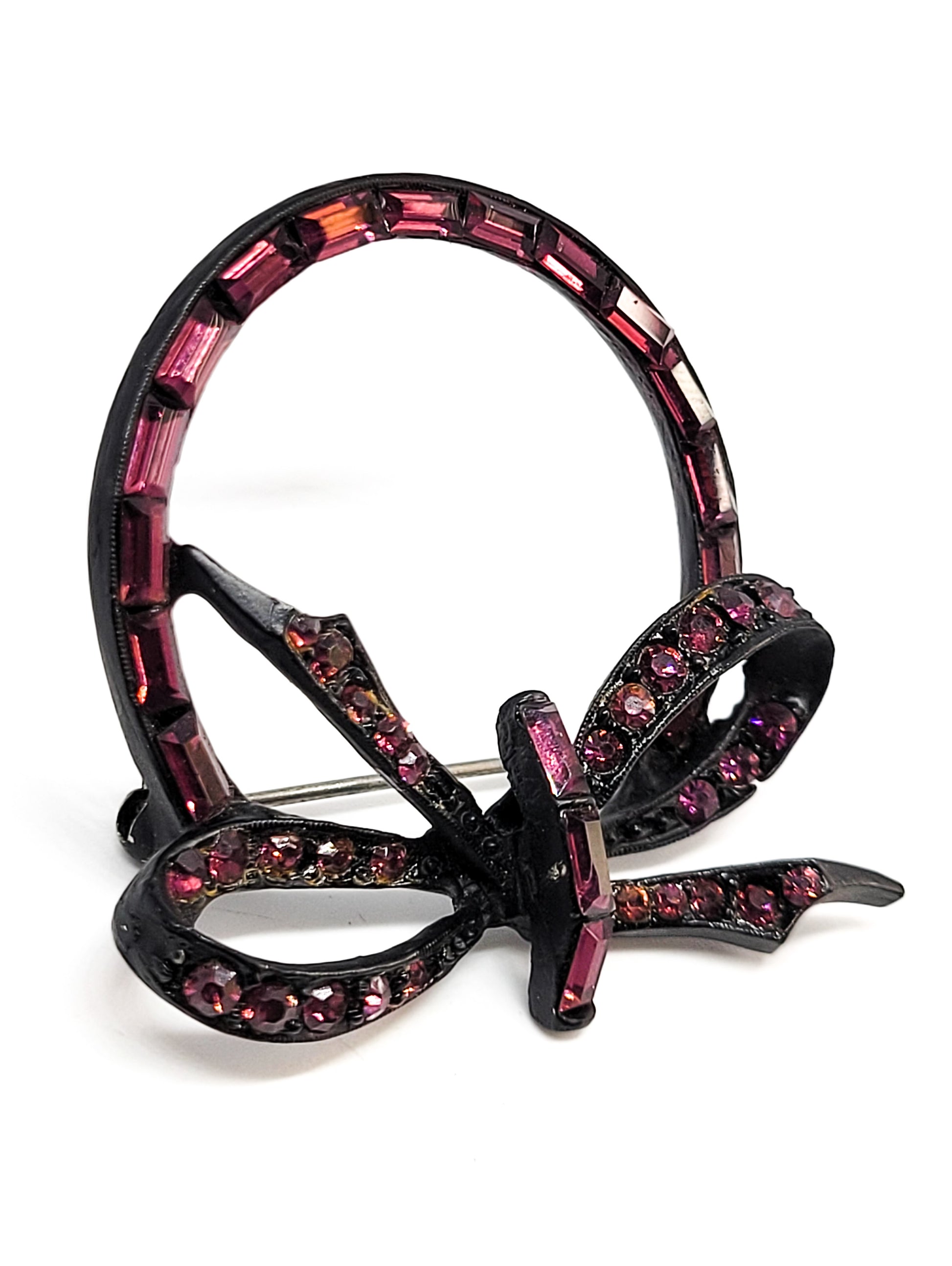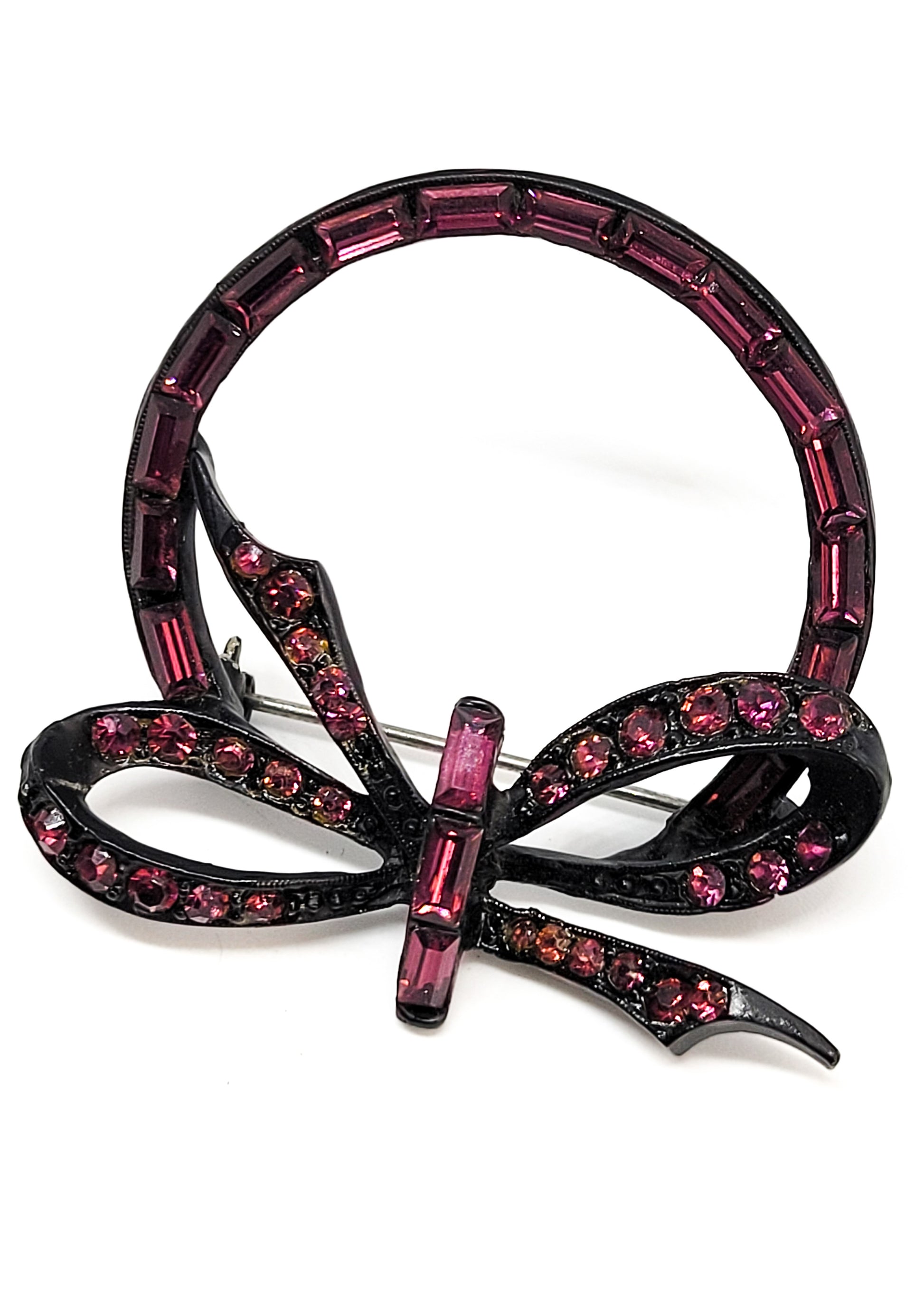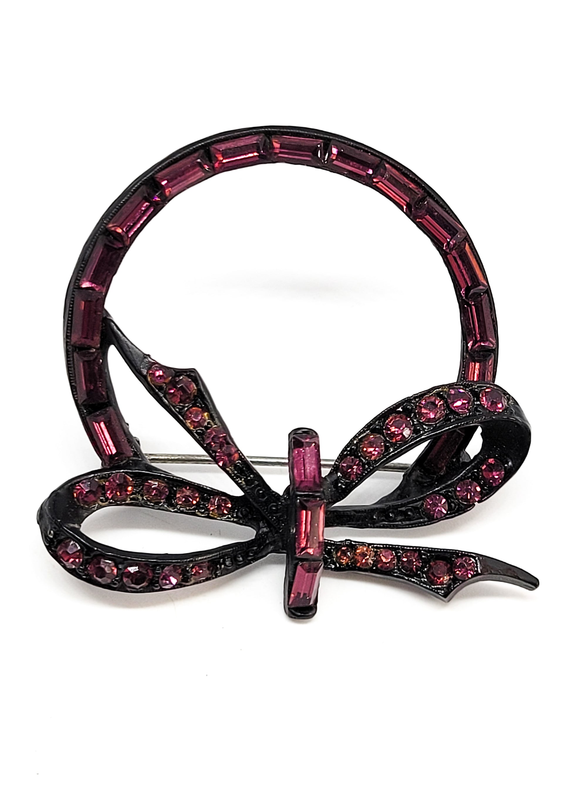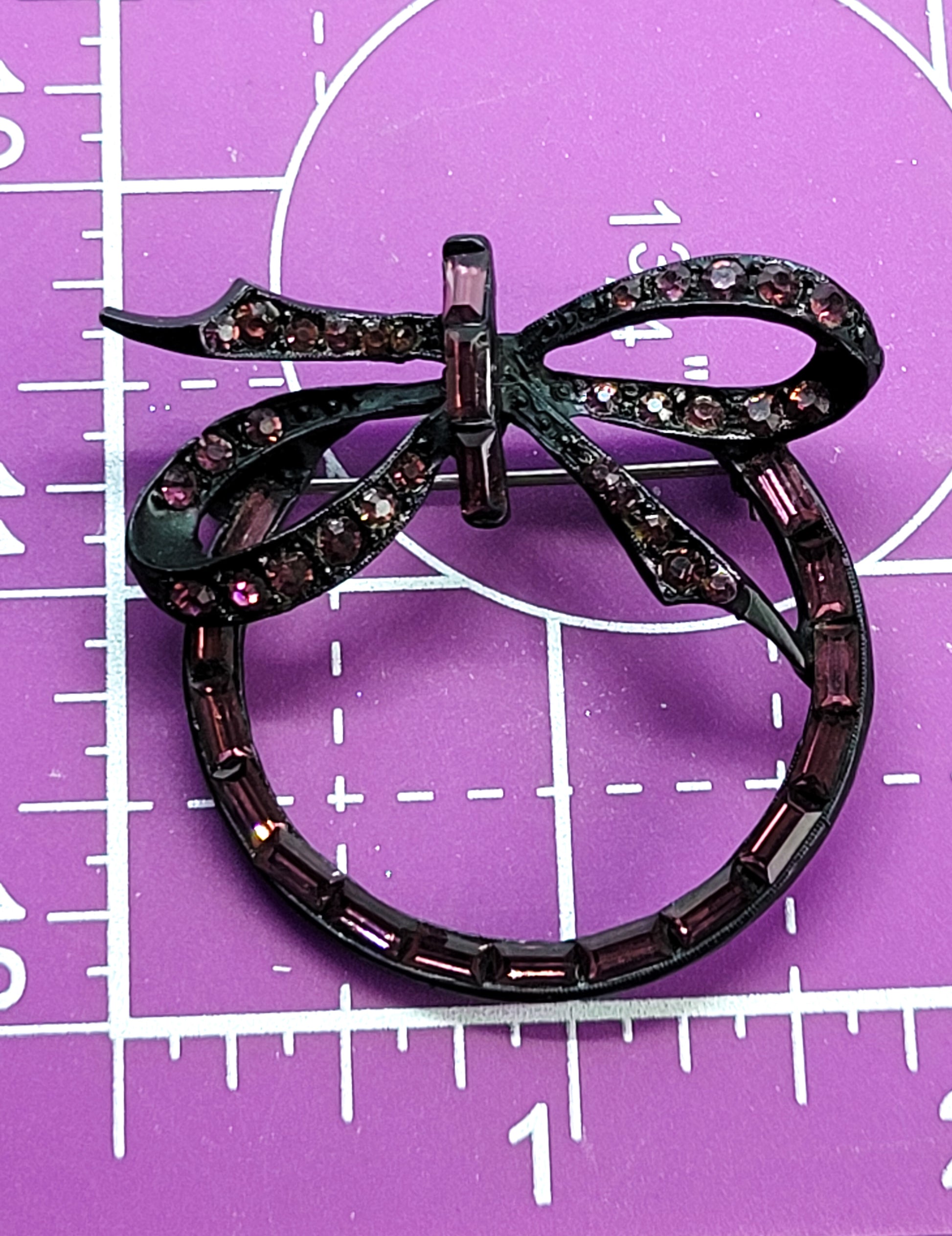 Japaned black and purple rhinestone circle bow vintage brooch. This unique brooch has been jappaned which is a technique of coating the brooch in a black finish. It has emerald cut rhinestone encircling the brooch with a purple chaton bow. Great vintage condition with little signs of normal vintage wear. Stamped with a P58 on the reverse. It was a bad strike on the back of the bow as the numbers for the patent were cut off.