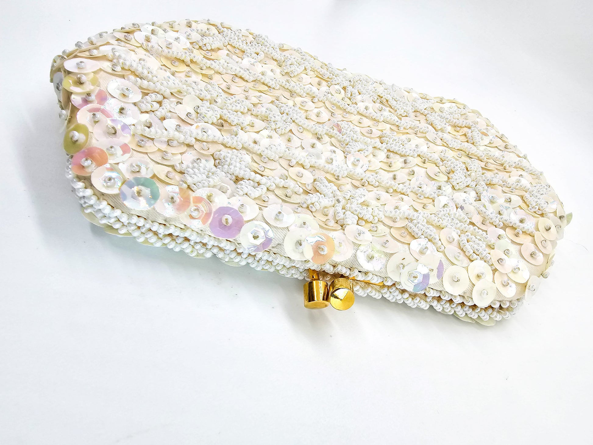 JBM Cream sequin and beaded vintage evening bag and glasses holder set. Beautiful sequin purse with rows of small seed beads with flowers and leaves. Good vintage condition with little signs of normal wear. Comes with a clutch and glasses holder. Tag in purse says Made in Hong Kong. The fabric tag in the match glasses holder says JBM.