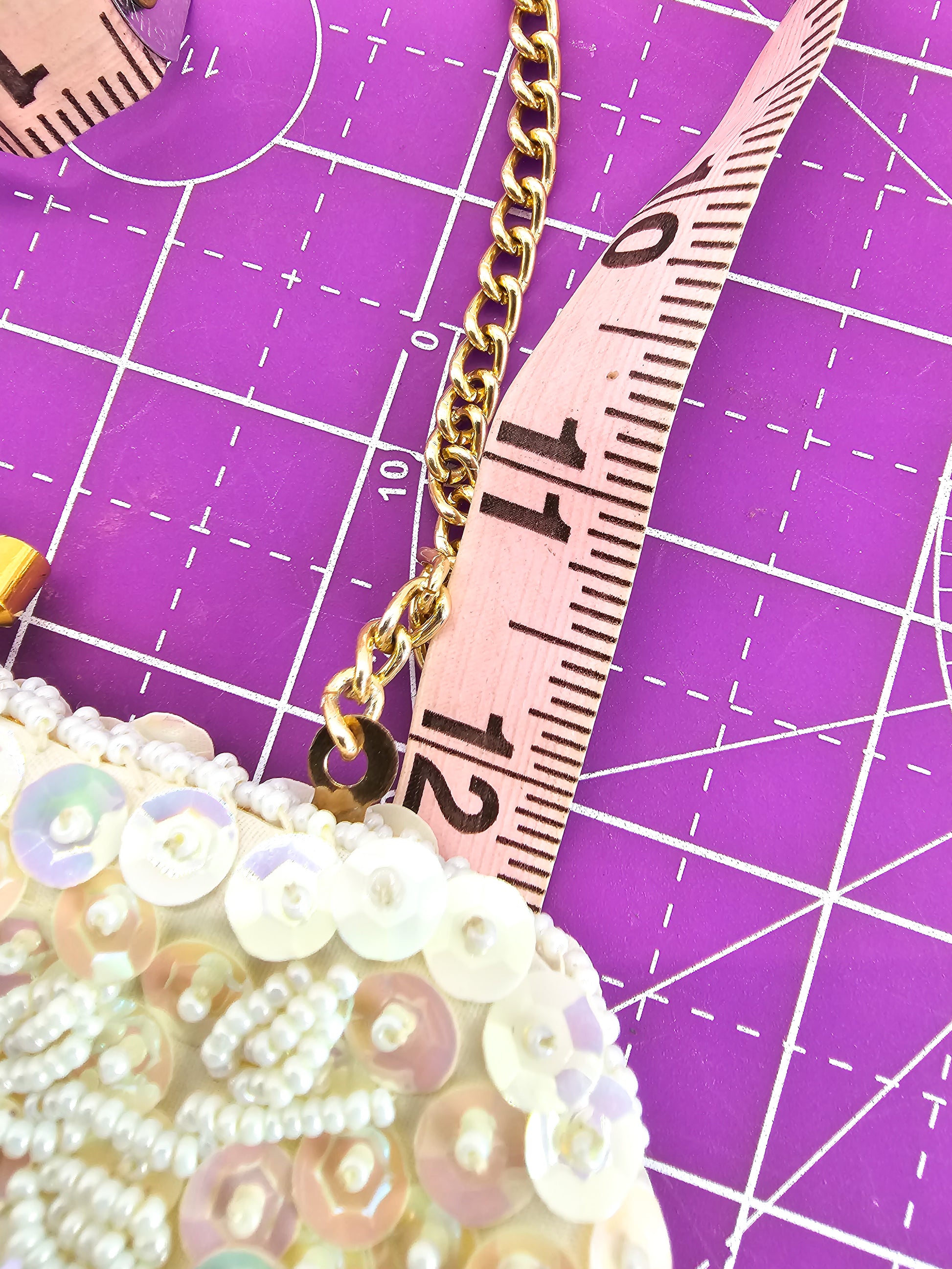 Purse measures 7 inches wide 6 inches tall and with a chain that is 12 inches long.